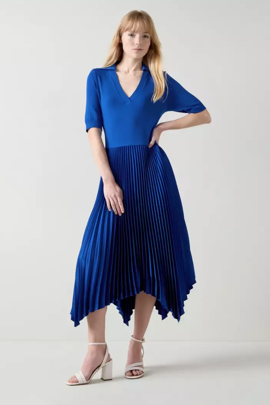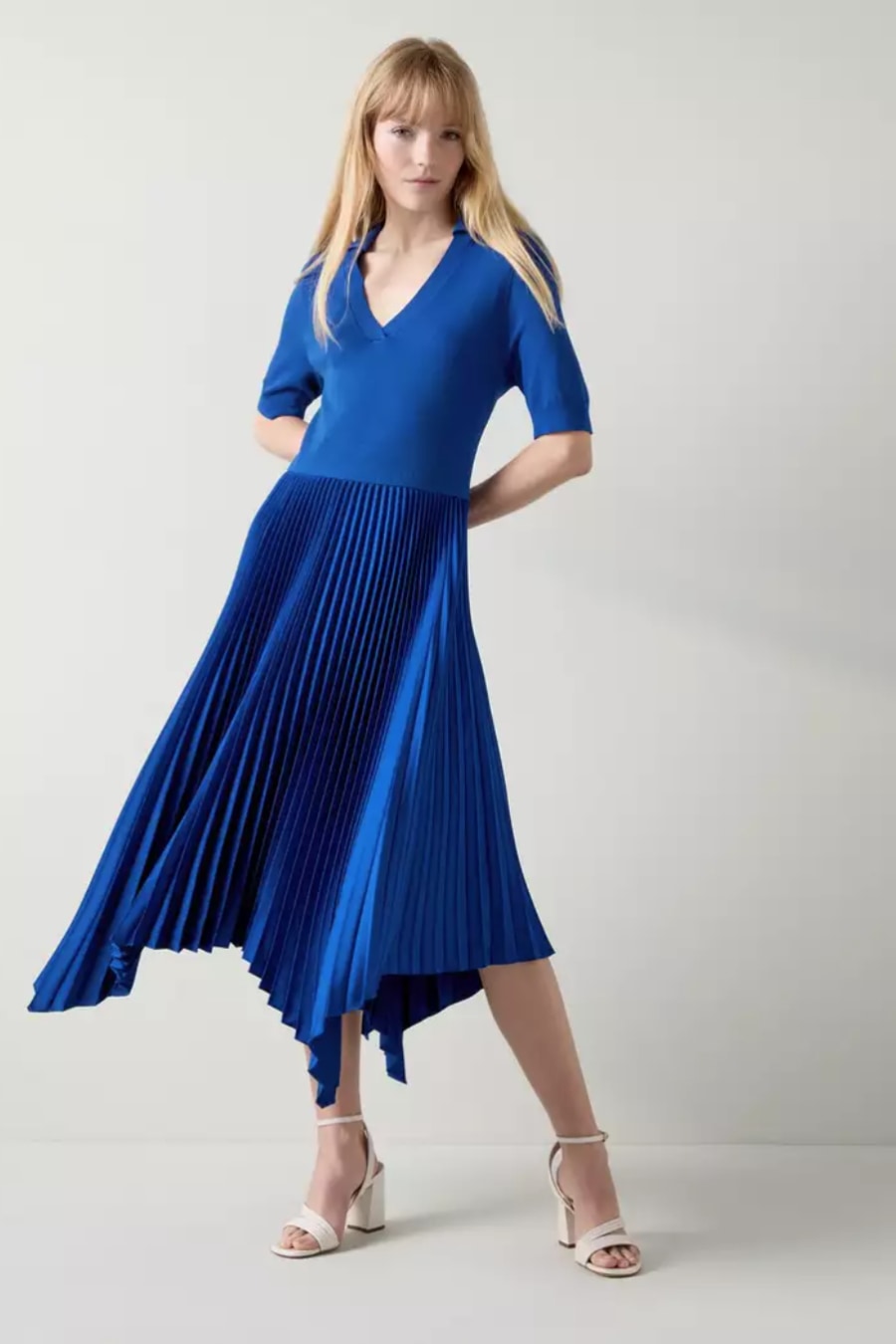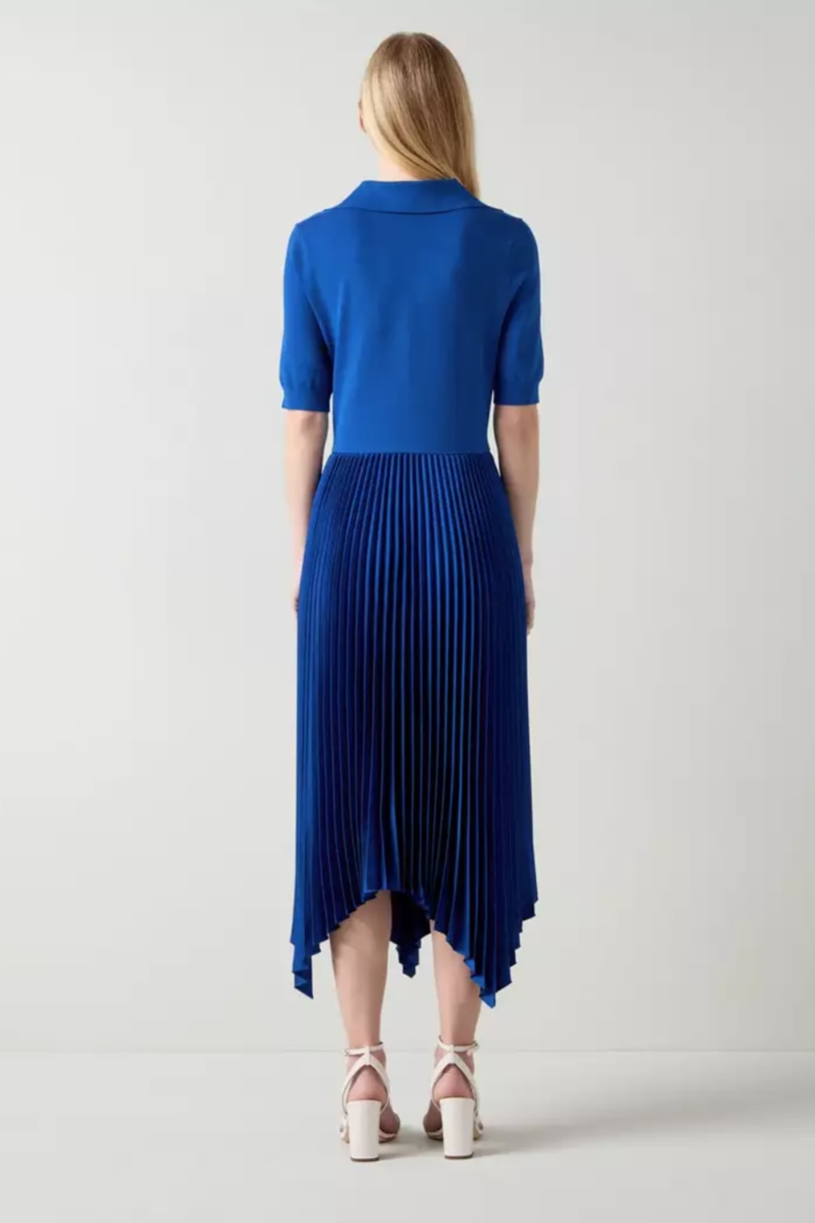 Introducing the captivating Lorna dress in mazarine blue, featuring a stretch knit bodice and a pleated skirt crafted from a luxurious viscose blend. Designed with a flattering V-neck and elegant full length sleeves, this dress is ideal for sophisticated events. Combine it with metallic heels and a minimalist clutch for a refined look.
