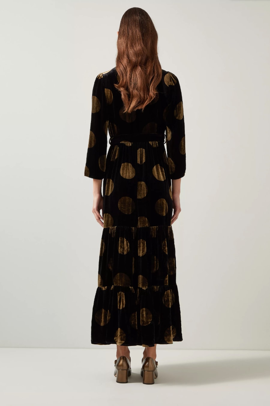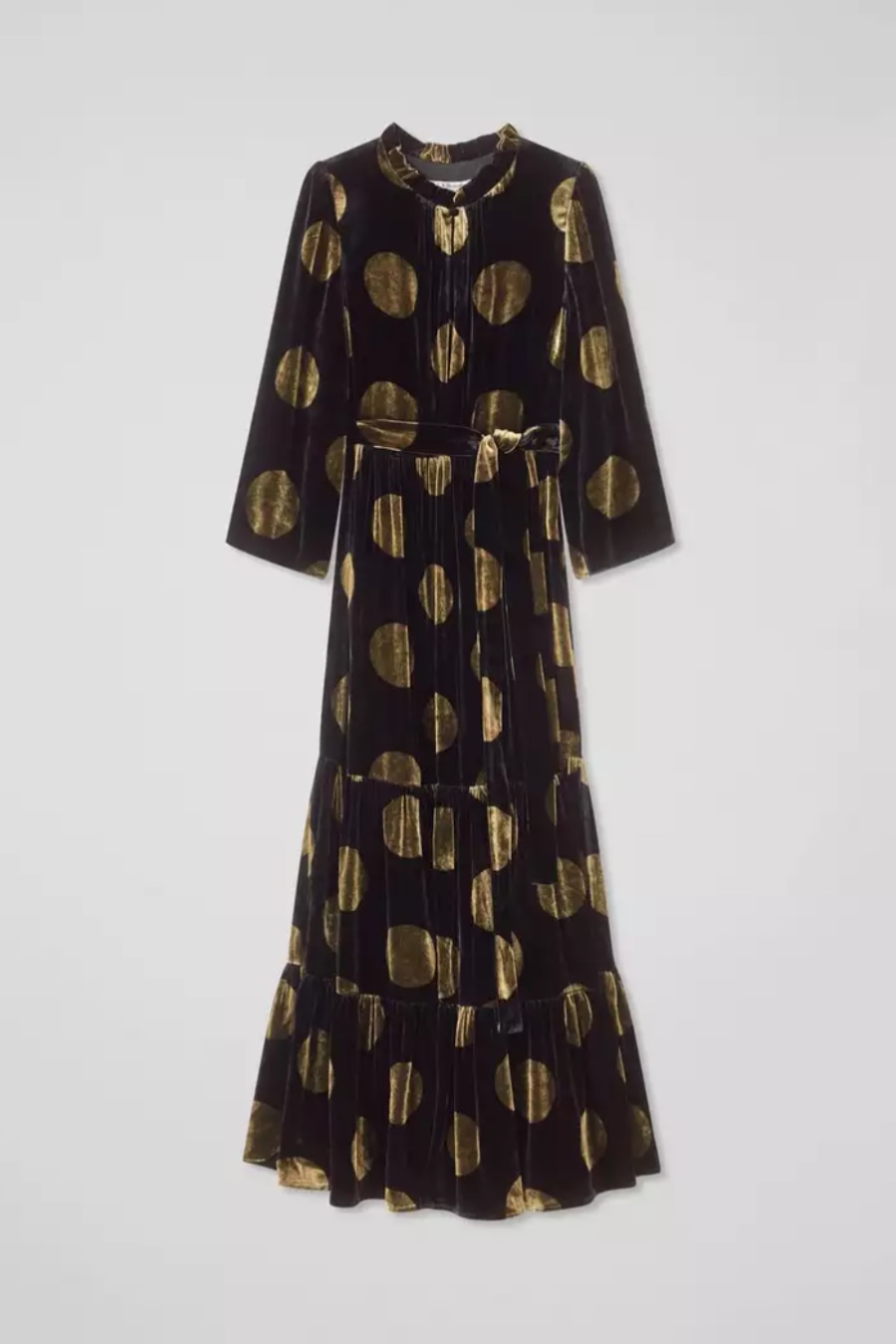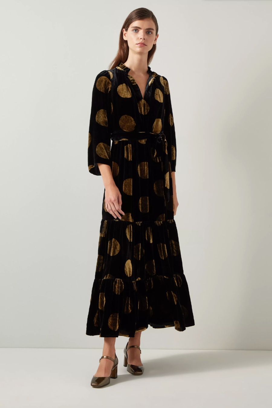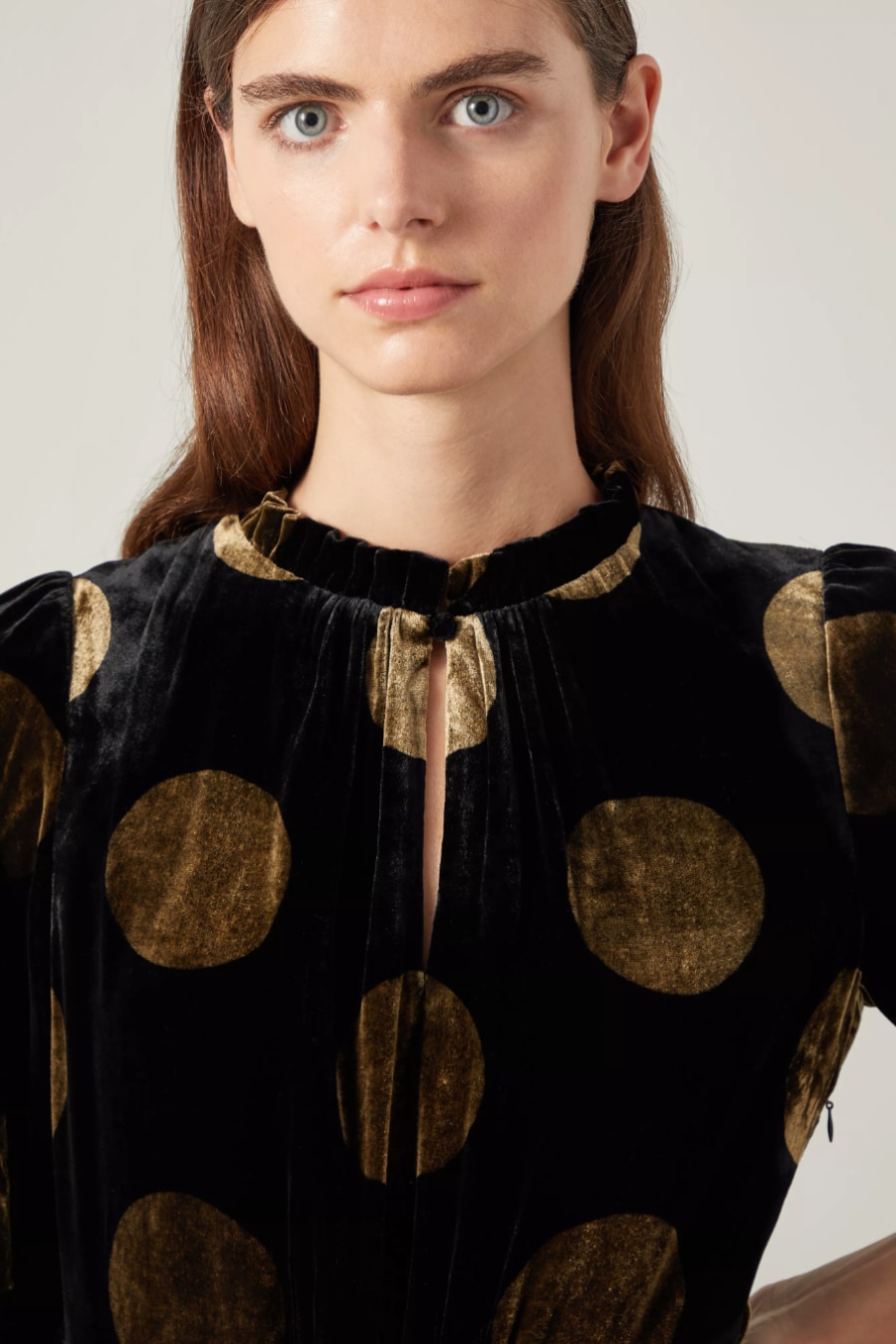 Shine bright with the Lulu giant spot print velvet dress. This black and gold silk mix dress features a stand frill collar, full length sleeves, and a stylish side zip, perfect for any evening occasion. Pair it with statement heels and a clutch for a head-turning ensemble.