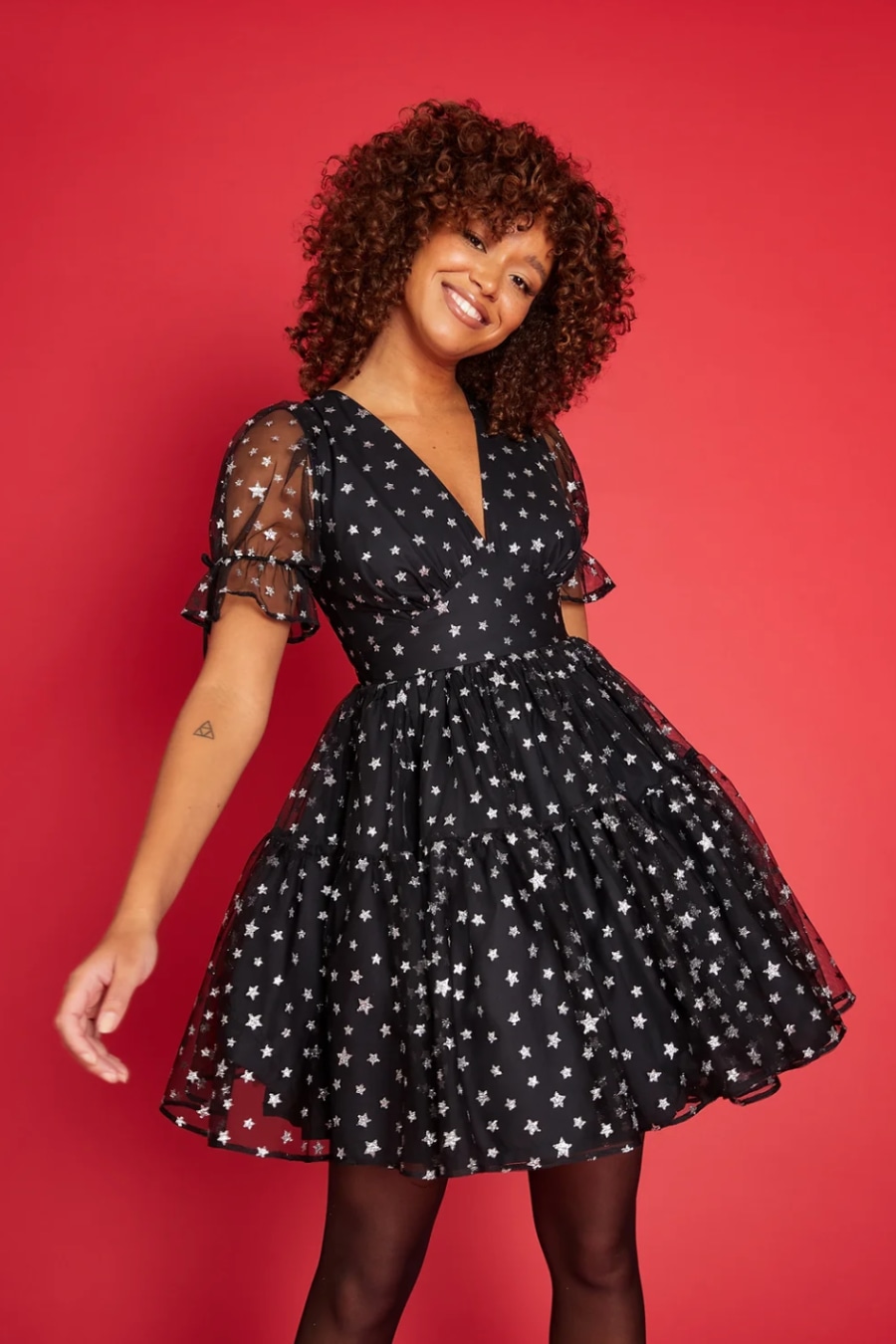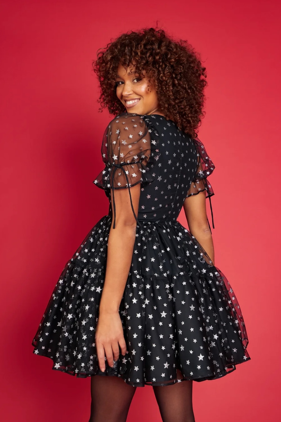 Black tulle fabric with silver glitter star print.