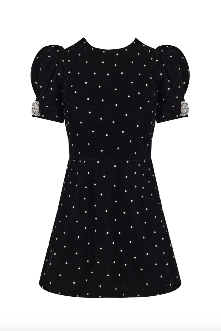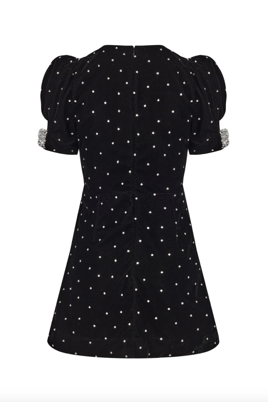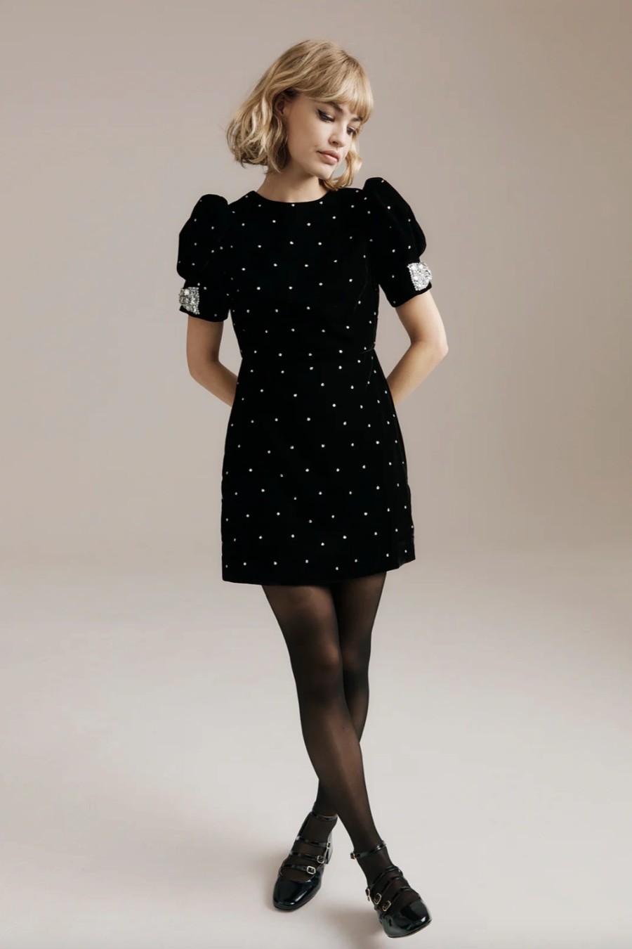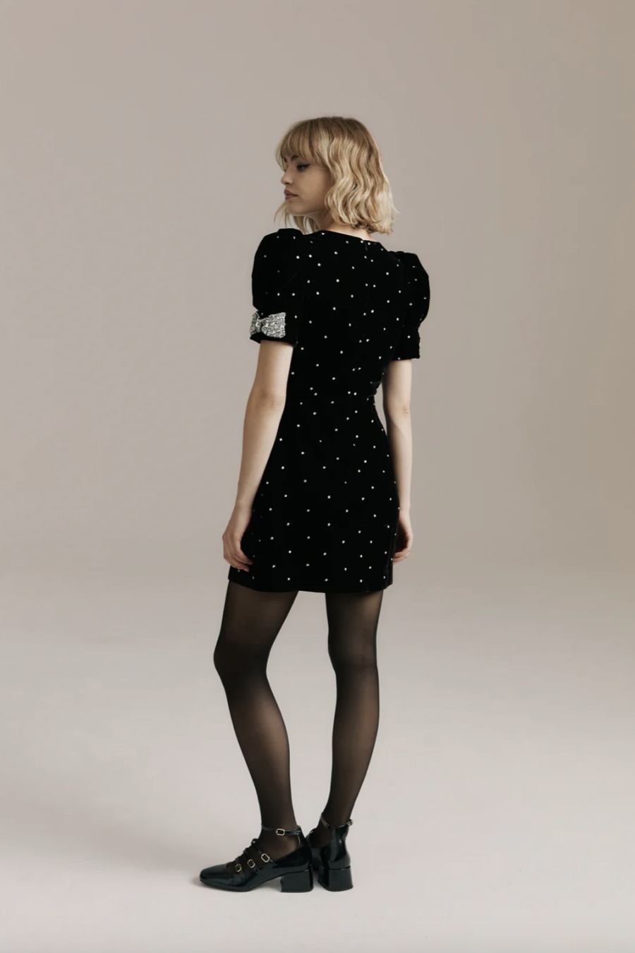 Luna is playfully polished and made to shine. Cut from rich black velvet and scattered with hand-sewn diamantés, she catches the light like a midnight sky. A sculpted shoulder and pleated puff sleeve bring vintage drama, while the embellished half-moon curve at the cuff glints like a secret.