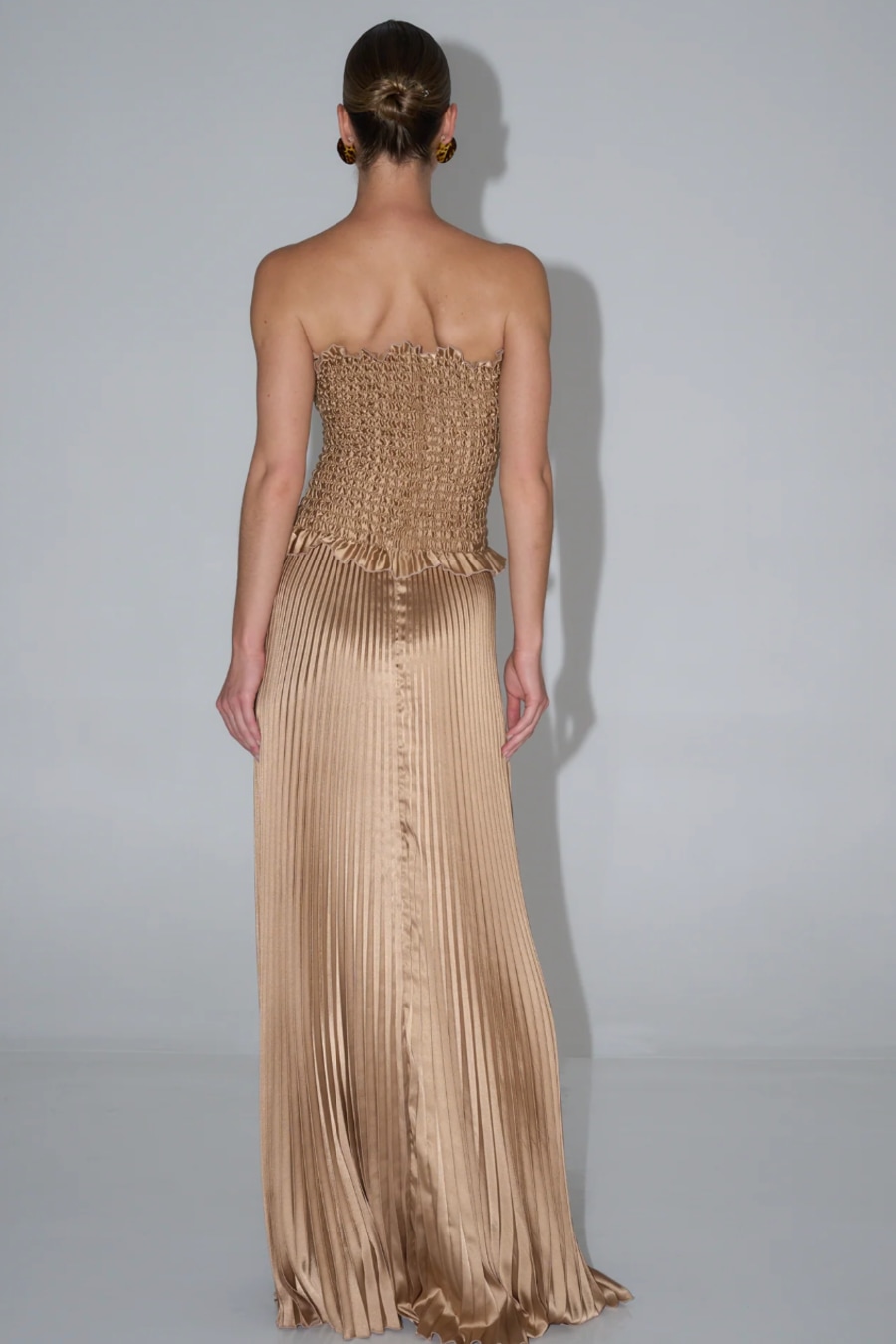The Maya Gown is a stunning strapless dress featuring an elasticated ruched bodice that effortlessly flatters the figure. Its elegant design flows into a floor-length skirt adorned with graceful umbrella pleats, creating a sophisticated yet modern silhouette. Perfect for formal events or special occasions, this gown offers both comfort and timeless style.