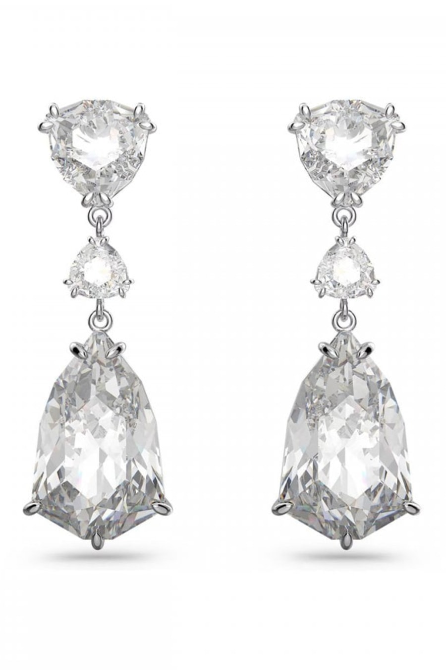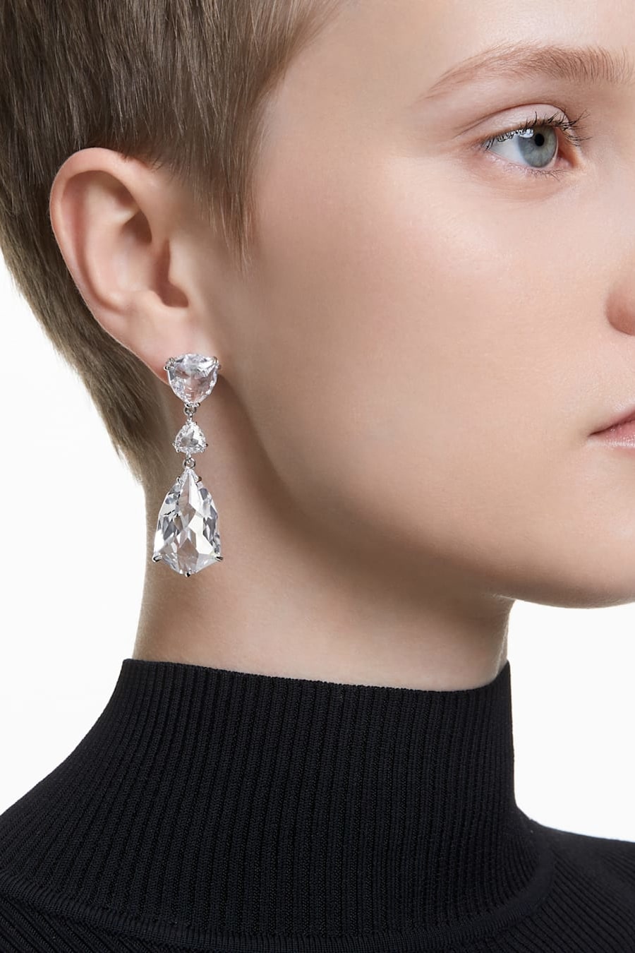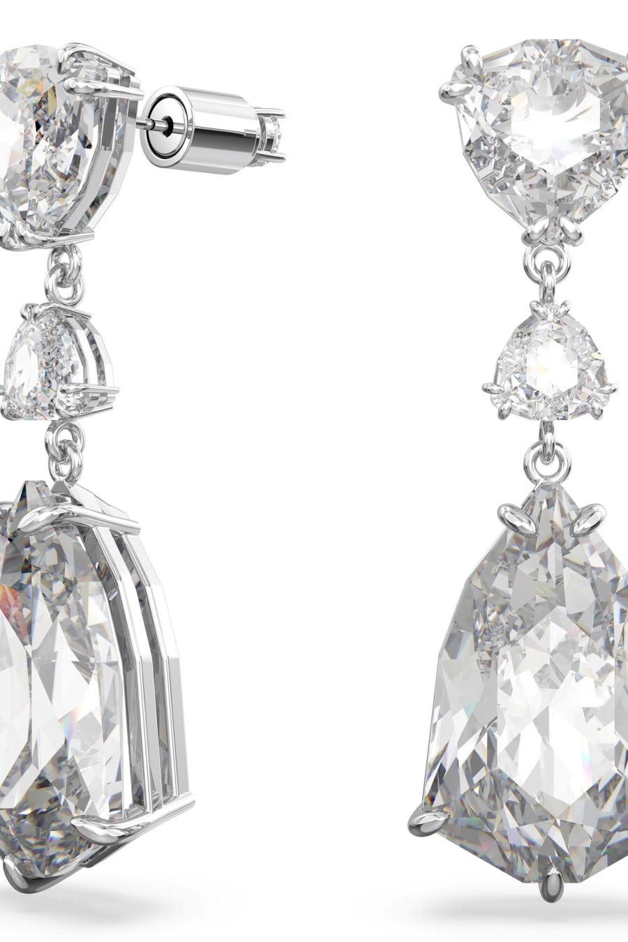 The essential choice for glamorous evening style, these rhodium plated earrings make an instant impact. The extraordinary design combines bright clear crystals in a trio of cuts, including trilliant, slim trilliant, and trilliant triangle. Each stone is set with an open back for a fine jewellery look, and arranged in a way that enhances movement and fluidity to make them dance in the light. Reach for these when you need a wondrous statement look.