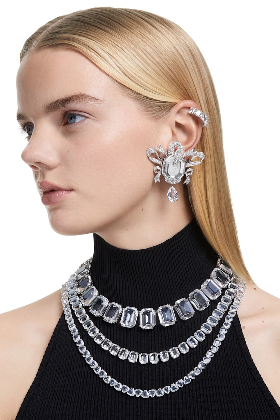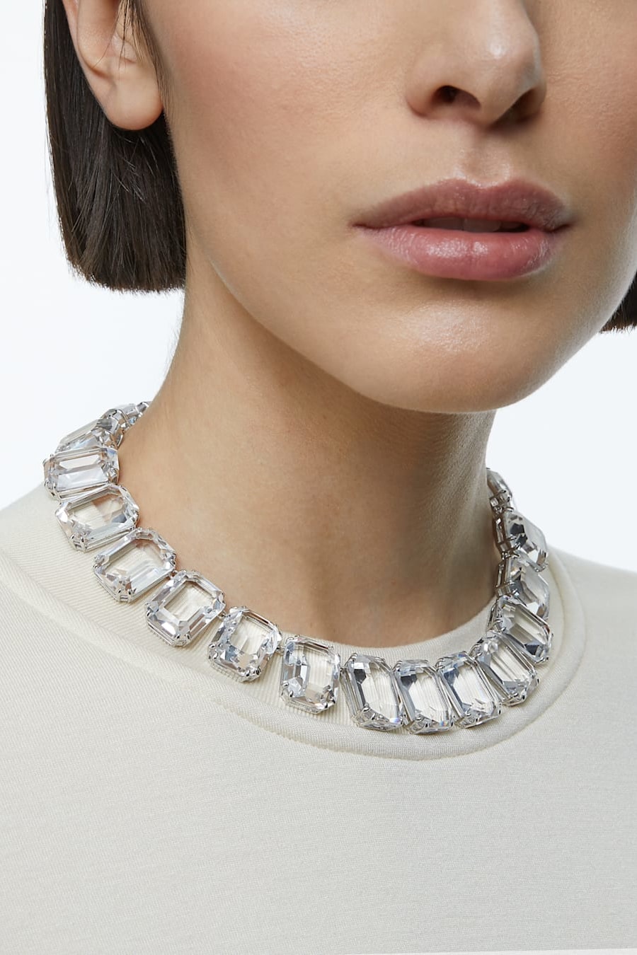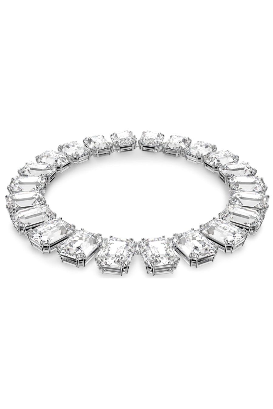 An elegant wardrobe essential, this clear crystal necklace is perfectly crafted with uniform octagon cut crystals on a silver tone plated prong setting and finished with a hidden clasp closure. Team with coordinating earrings from the Millenia family and a black dress for evening, or wear solo with a simple white t-shirt for daytime adornment with an ultramodern twist. This necklace is part of the Millenia family, designed by Creative Director Giovanna Engelbert for Collection I. How to close and open it: place the rounded baton into the widest point of the opposite hole and slide it down to the lowest point. Once in place, lower the D-ring security catch on top to secure the fastening. To open, lift up the D-ring security catch and slide the baton towards the widest point to release.