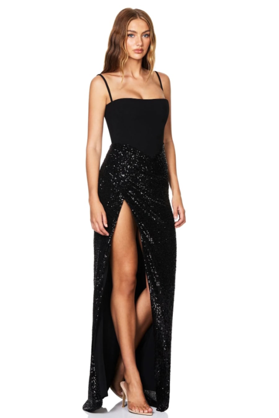 Capture the light with a beautiful contrast of structured crepe & glittering sequin. Featuring a body-sculpting bodice, faux wrap skirt & a sexy side split, this unique design was made for the magic moments. Invisible zip closure at back, fully lined