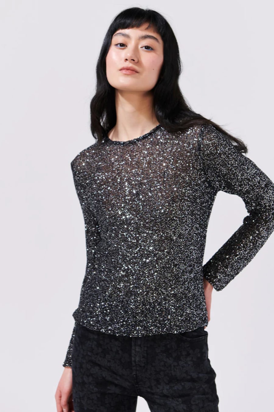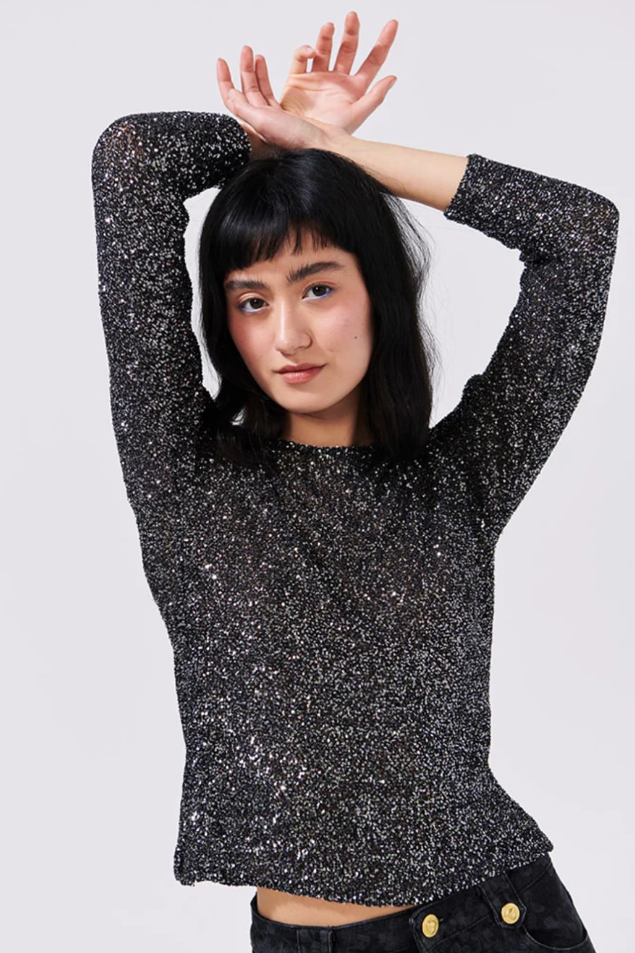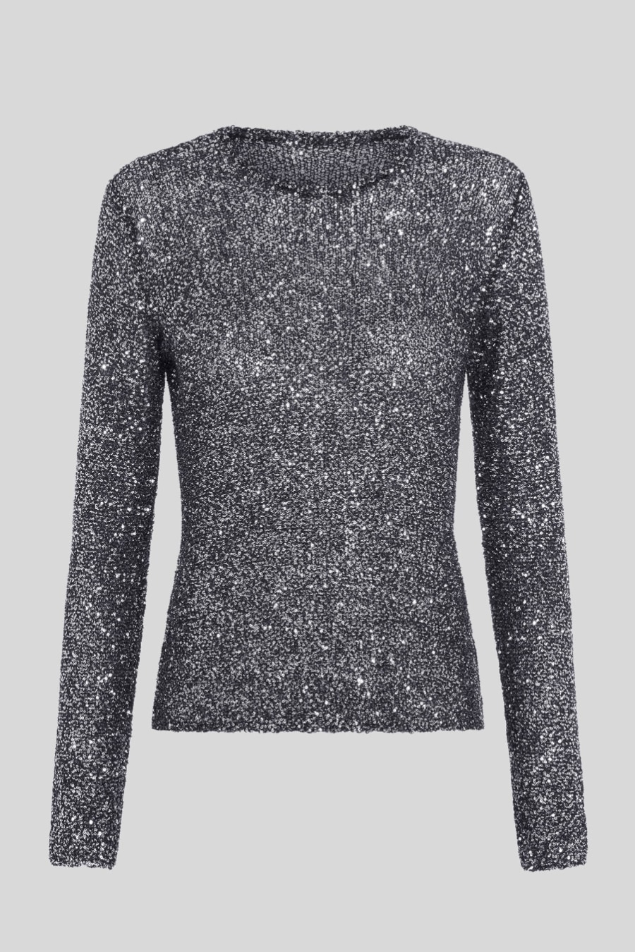 Dancing in the moonlight. Carefully crafted from premium yarn threaded with multiple glittering sequins, this standout piece is the life and soul of the party. The ultra delicate material is a challenge to knit and it took our specialist knitters no less than 138 minutes to complete each piece. Featuring a round neckline, this simple silhouette needs nothing more to shine. Pair with the matching sequin knit jogger and a strappy heel to light up the night - or the dancefloor.
