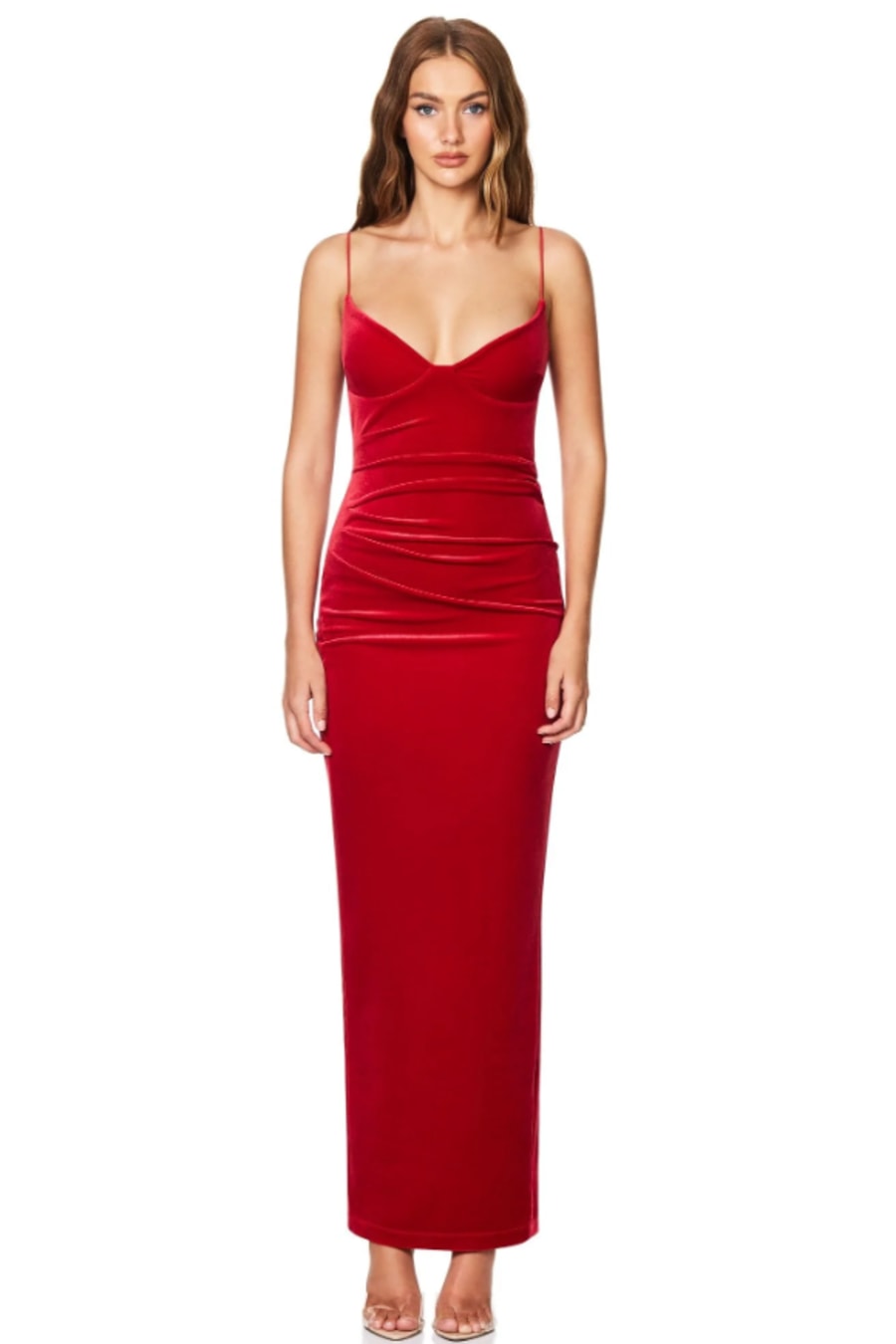 Crafted from our luxurious stretch velvet with a sweetheart neckline with moulded bra, nipped waist and split at back, this must-have maxi offers a refined silhouette designed to stand the test of time. Invisible zip closure at back, fully lined.