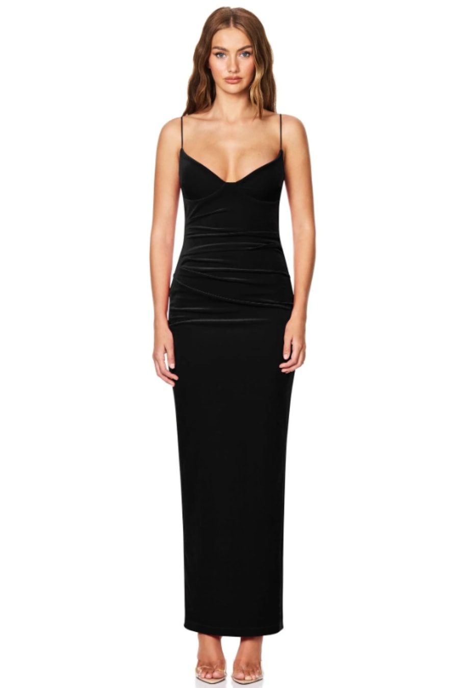 Crafted from our luxurious stretch velvet with a sweetheart neckline with moulded bra, nipped waist and split at back, this must-have maxi offers a refined silhouette designed to stand the test of time. Invisible zip closure at back, fully lined.