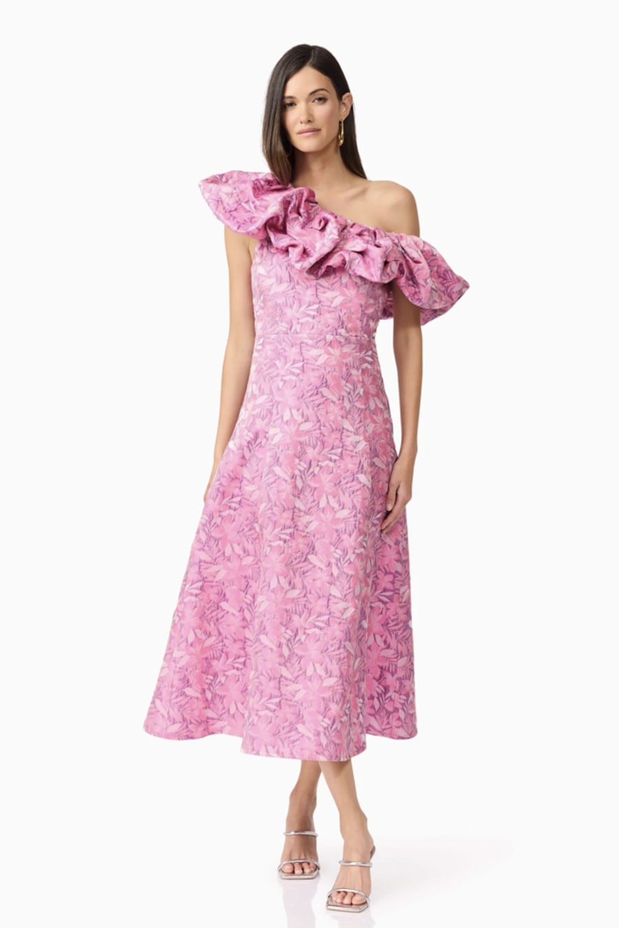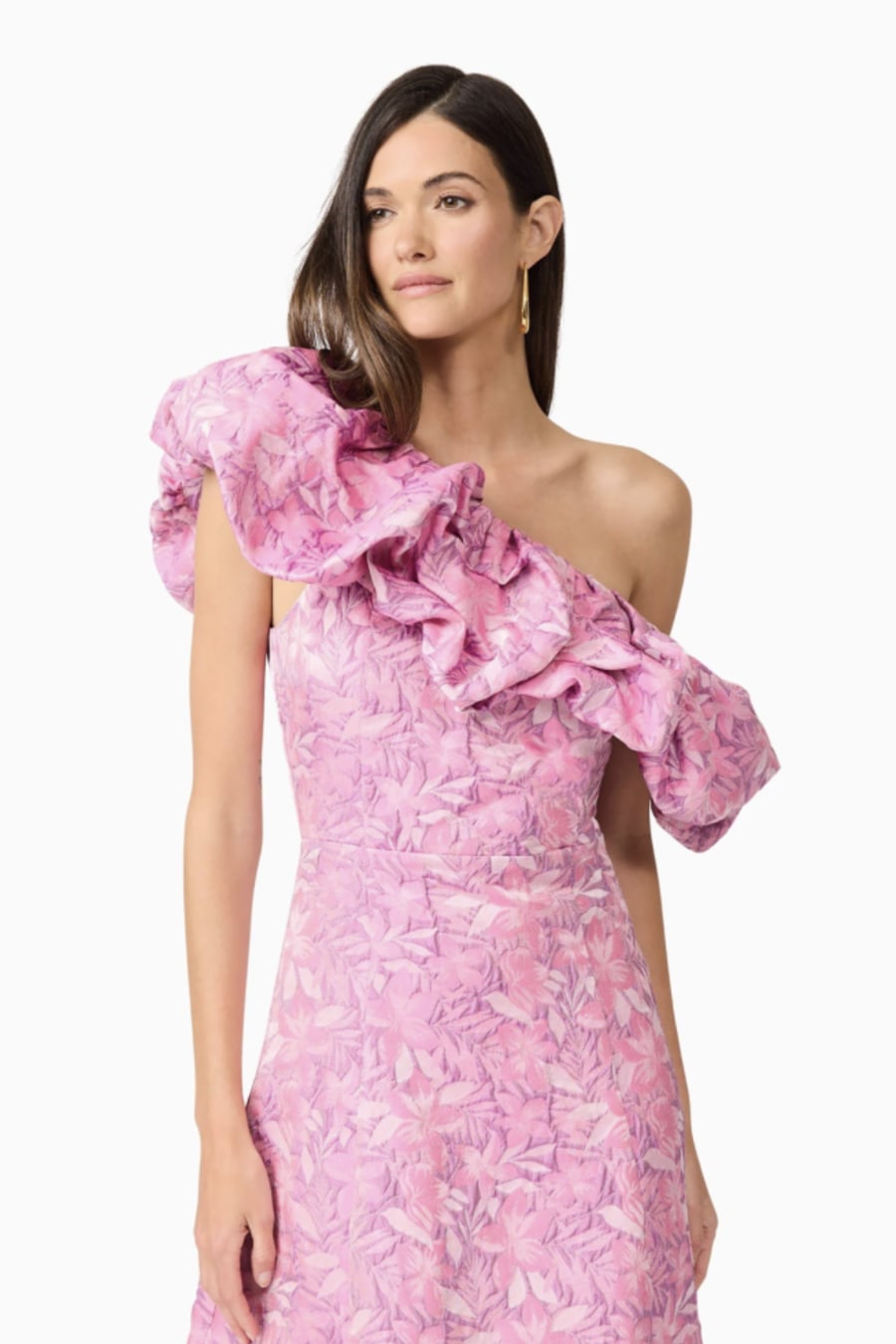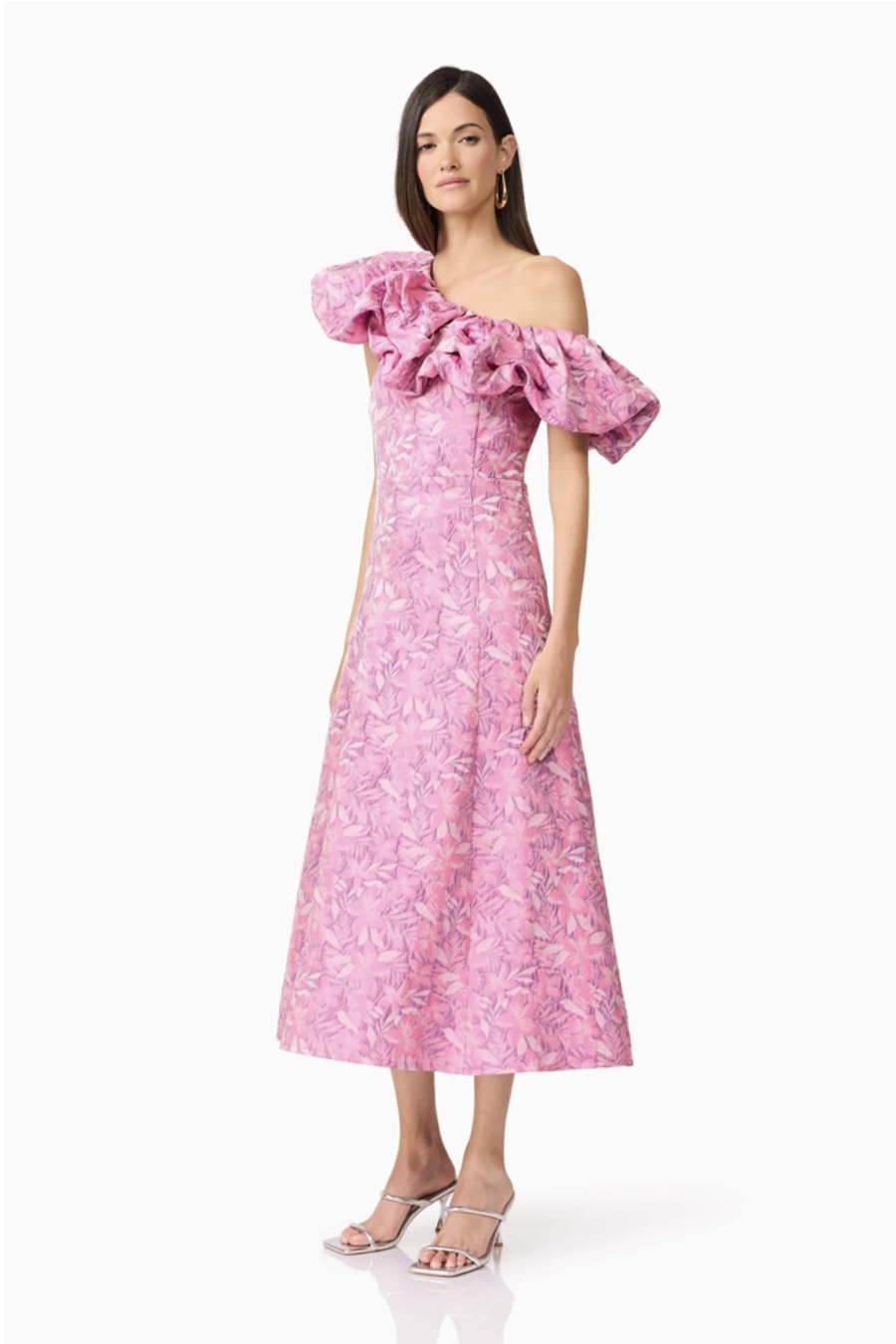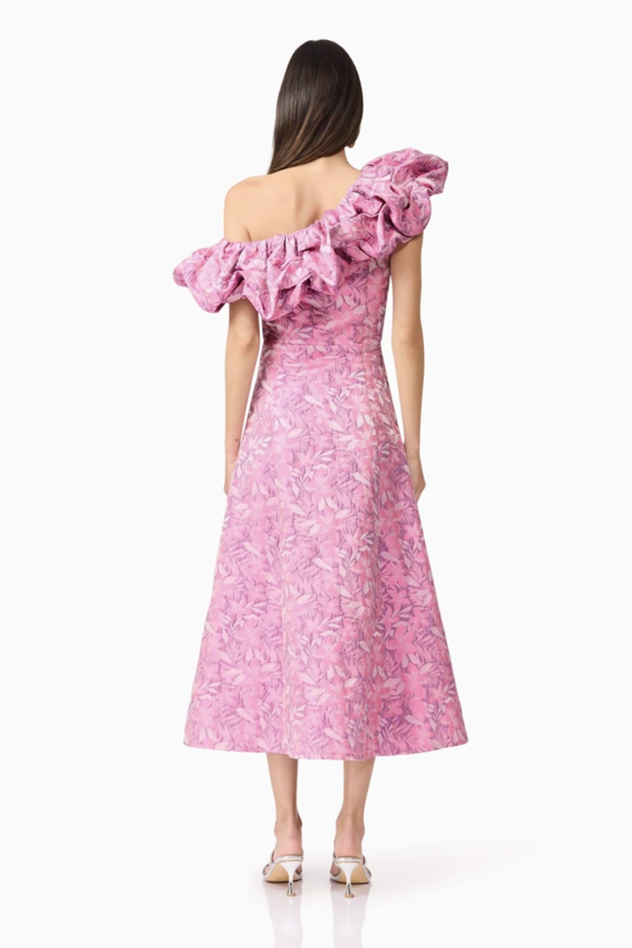 Crafted from a floral jacquard fabrication, the dress brings subtle texture and delicate patterns to the soft pink hue, making it perfect for spring or summer occasions. The woven (non-stretch) fabric ensures a structured and high-quality fit, adding a touch of luxury to your wardrobe.