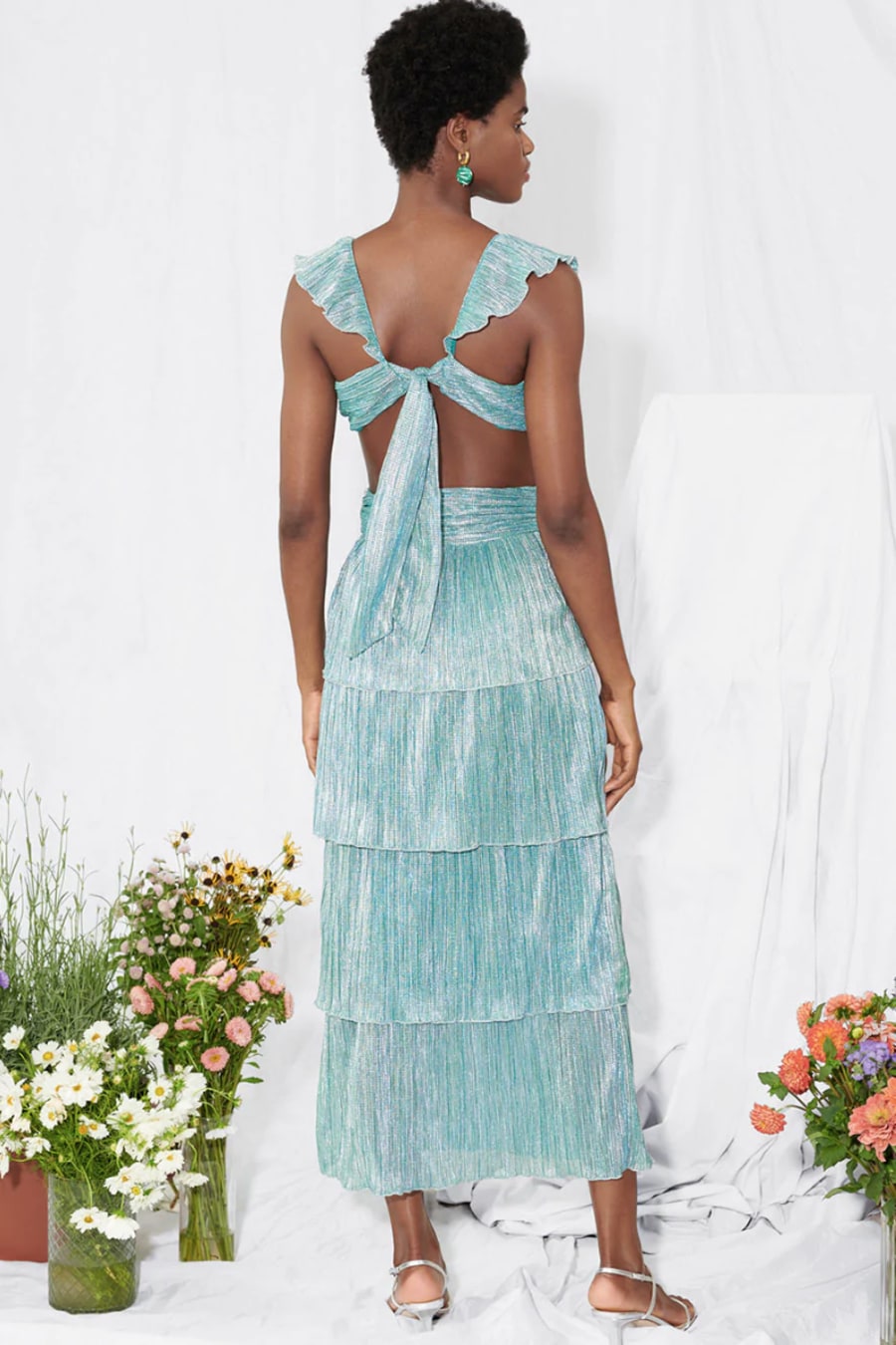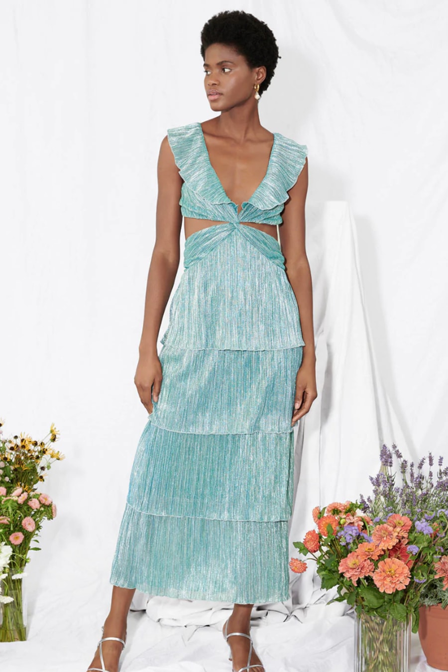 Meet the new girl in town, Newton. Newton lets you live your mermaid fantasy; the dynamic midi is cut from a beautiful jade colored metallic pleat fabric. With tiers of pleats and cut outs at the bodice, Newton is what dreams are made of. Delicate ruffles line the v-neckline and flutter into sleeves that lead to a tie back to finish the look.