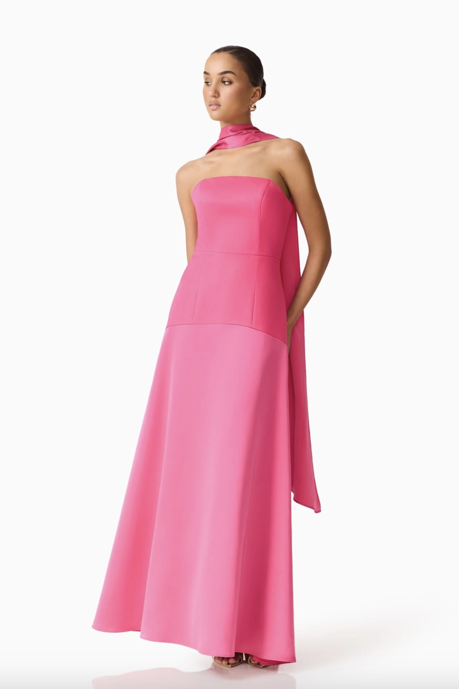 Elegant, sculptural and designed to make an entrance, the Noralyn Strapless Gown in Pink blends clean tailoring with fluid, feminine detailing. The fitted silhouette is crafted from a luxurious bonded crepe and drape satin fabrication, creating a smooth, contoured shape through the bodice before falling into a softly structured skirt.