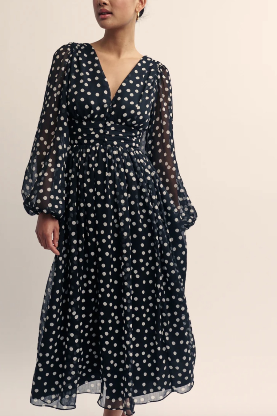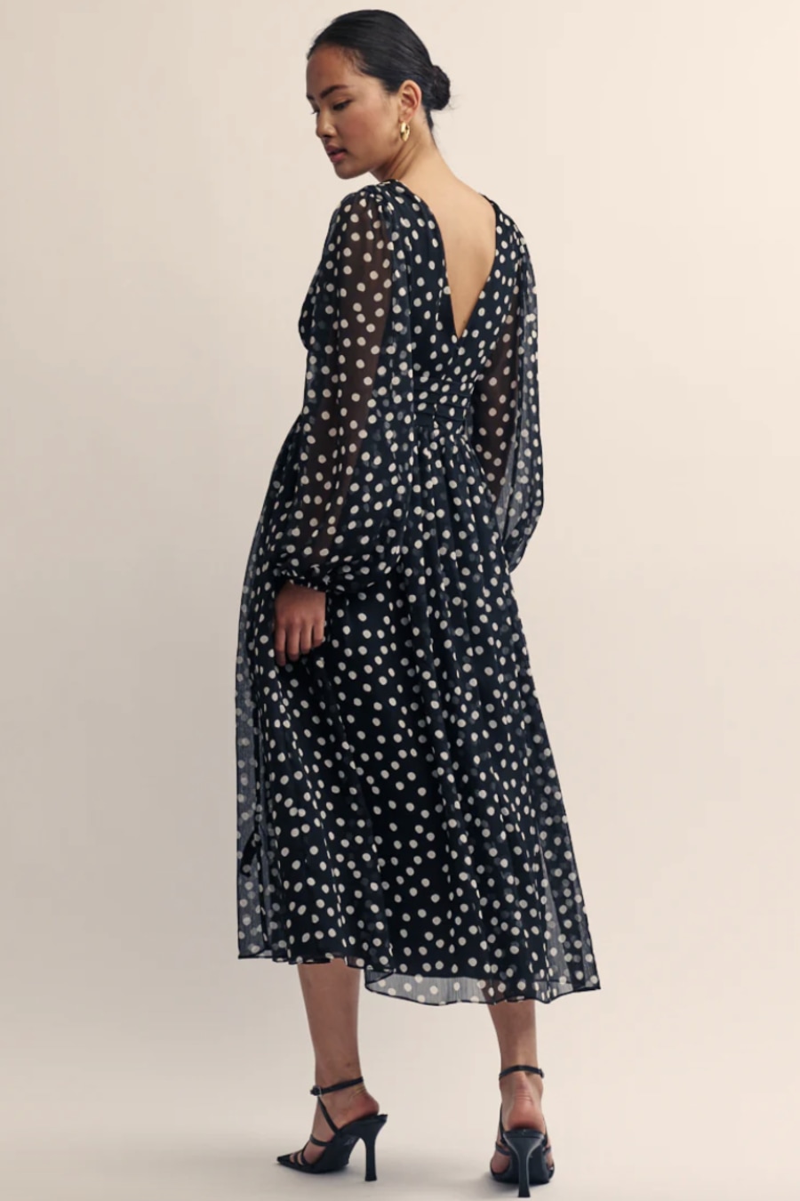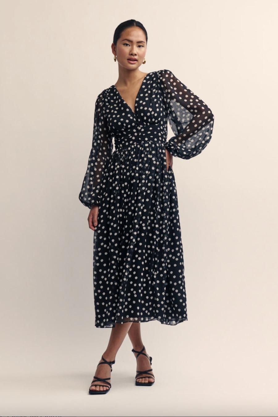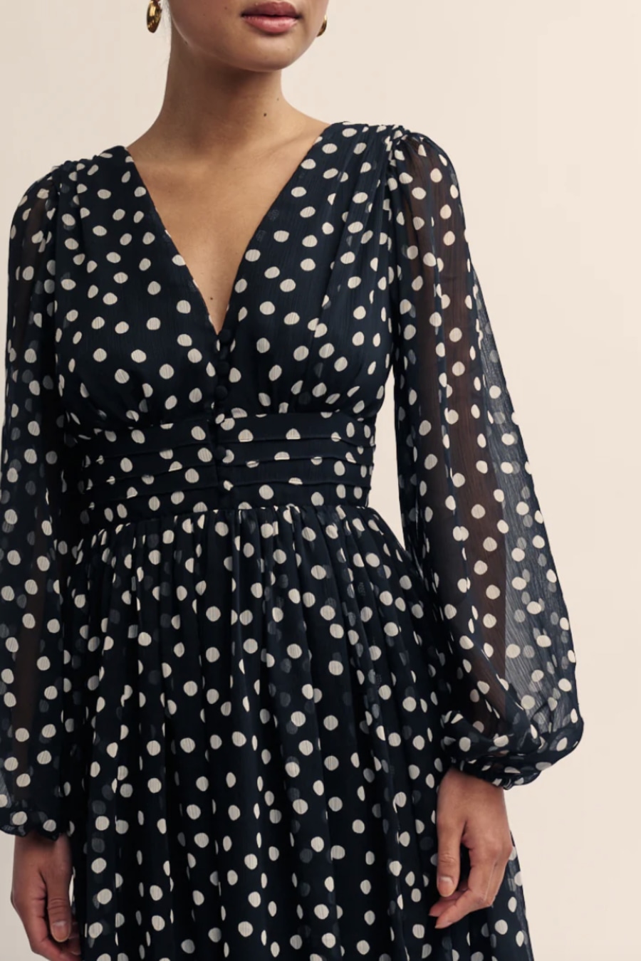Get ready for an all-eyes-on-me moment in Anya. Made from textured chiffon woven from a floaty fabric blend that includes recycled materials, she’s an occasion dress to end all others. Drawing attention with her polka dot print and voluminous puff sleeves, this black midaxi features a fitted waist and a pretty line of fabric covered buttons. Finish with your favourite jewellery.