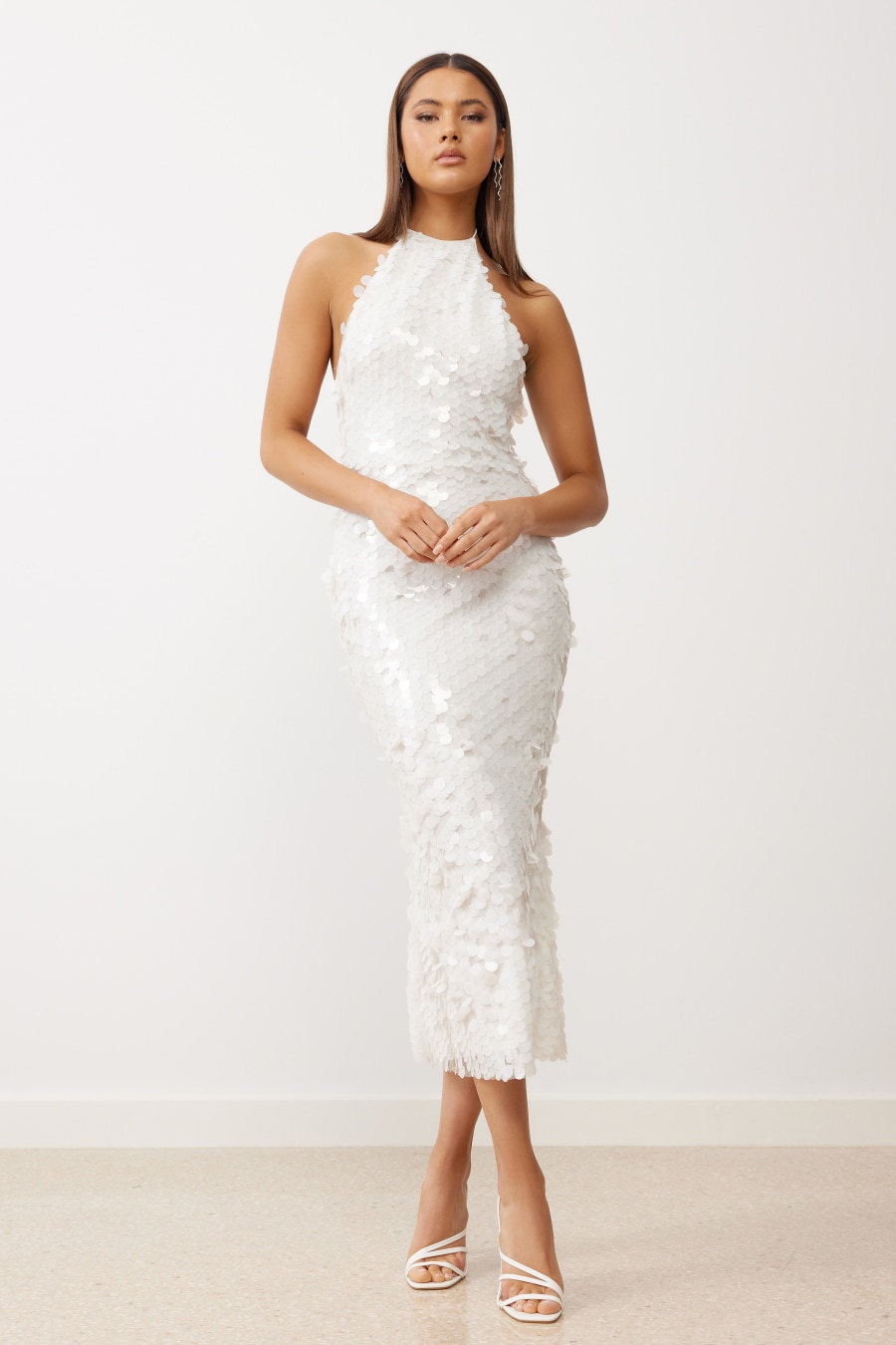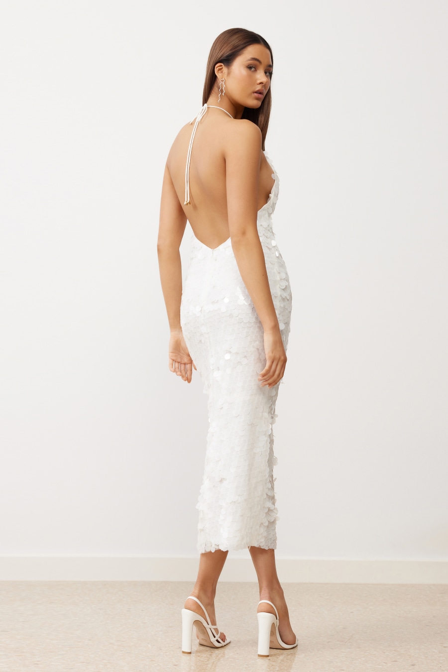 The River Dress is the ultimate statement midi dress showcasing a luxe sequin fabrication. The dress features a low back with dipped V shape waistline, and invisible zip closure at the centre back. The high halter neckline ties at the back with thin straps, finished with gold toggles, complimenting the exposed back. The dress is lined with a delicate georgette, providing smoothness on the skin.