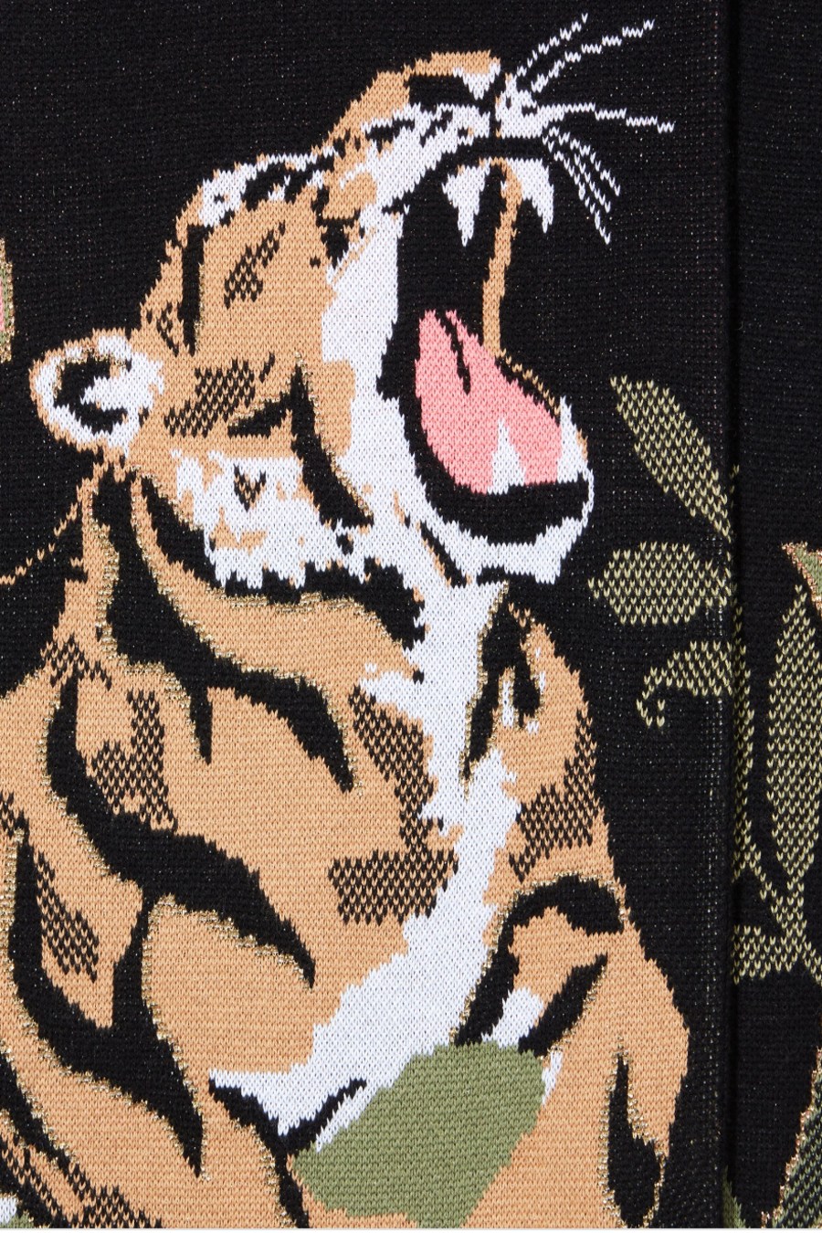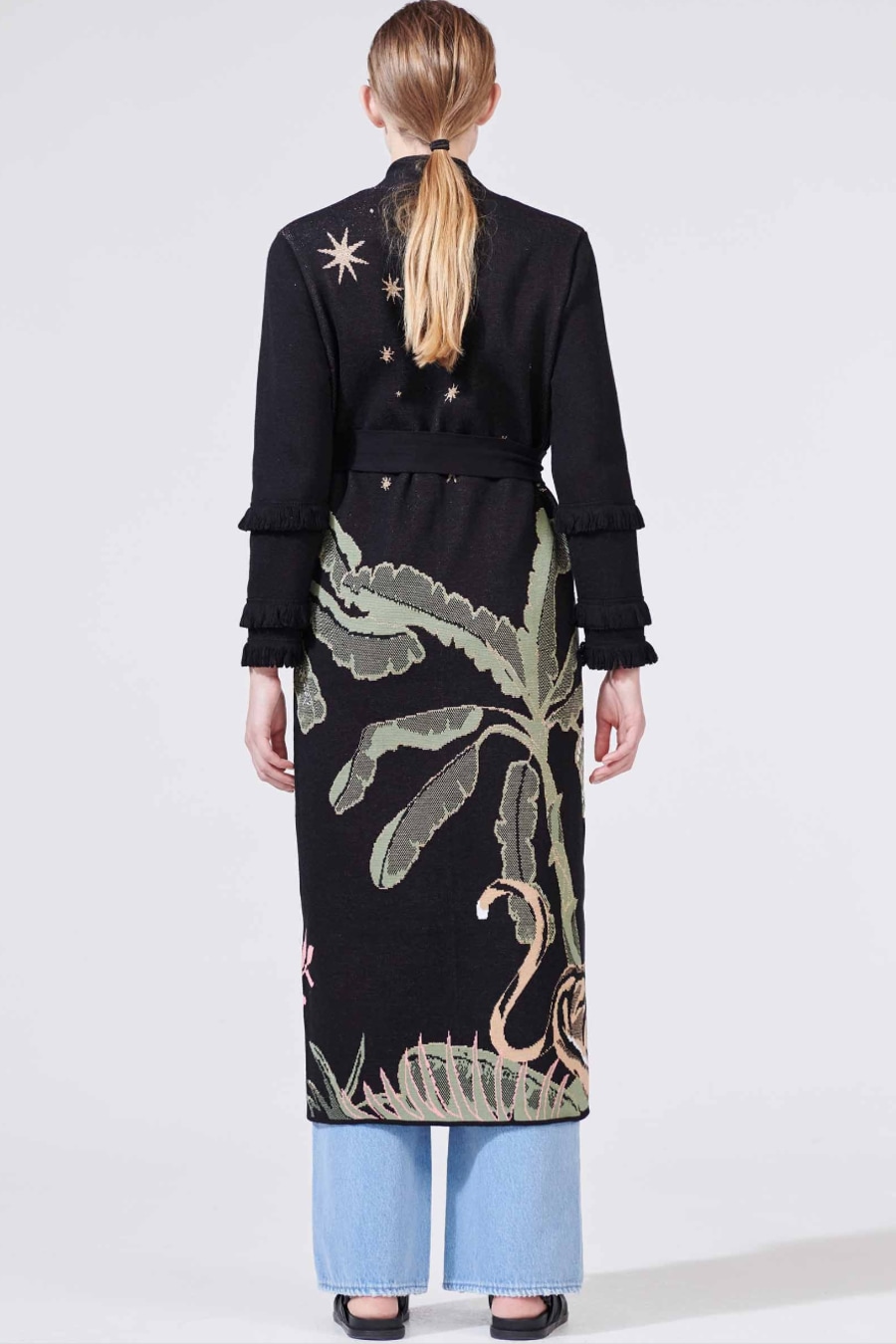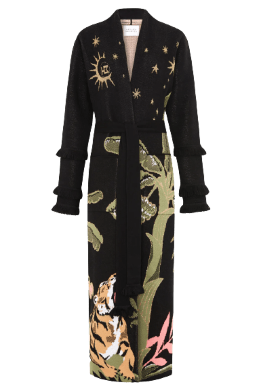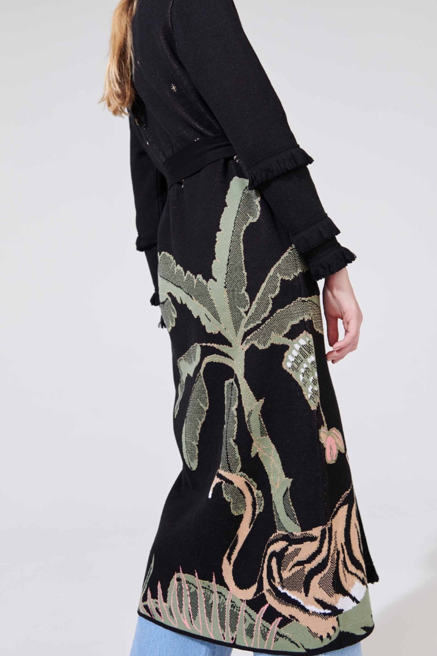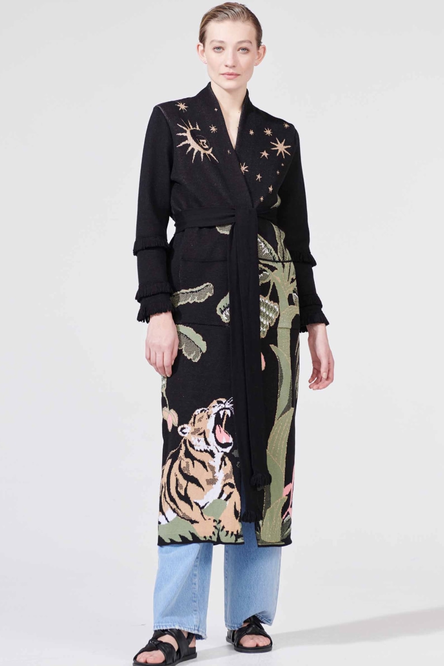 All the ease of a gentle summer night. This season’s motif, the tiger, appears alongside enlarged banana trees and a twinkling night sky lending this duster a wondrously tropical feel. A complex jacquard knitting technique is used which means that each garment takes over 7 hours to knit. Wear open or closed, belted or unbelted, to layer over any look.