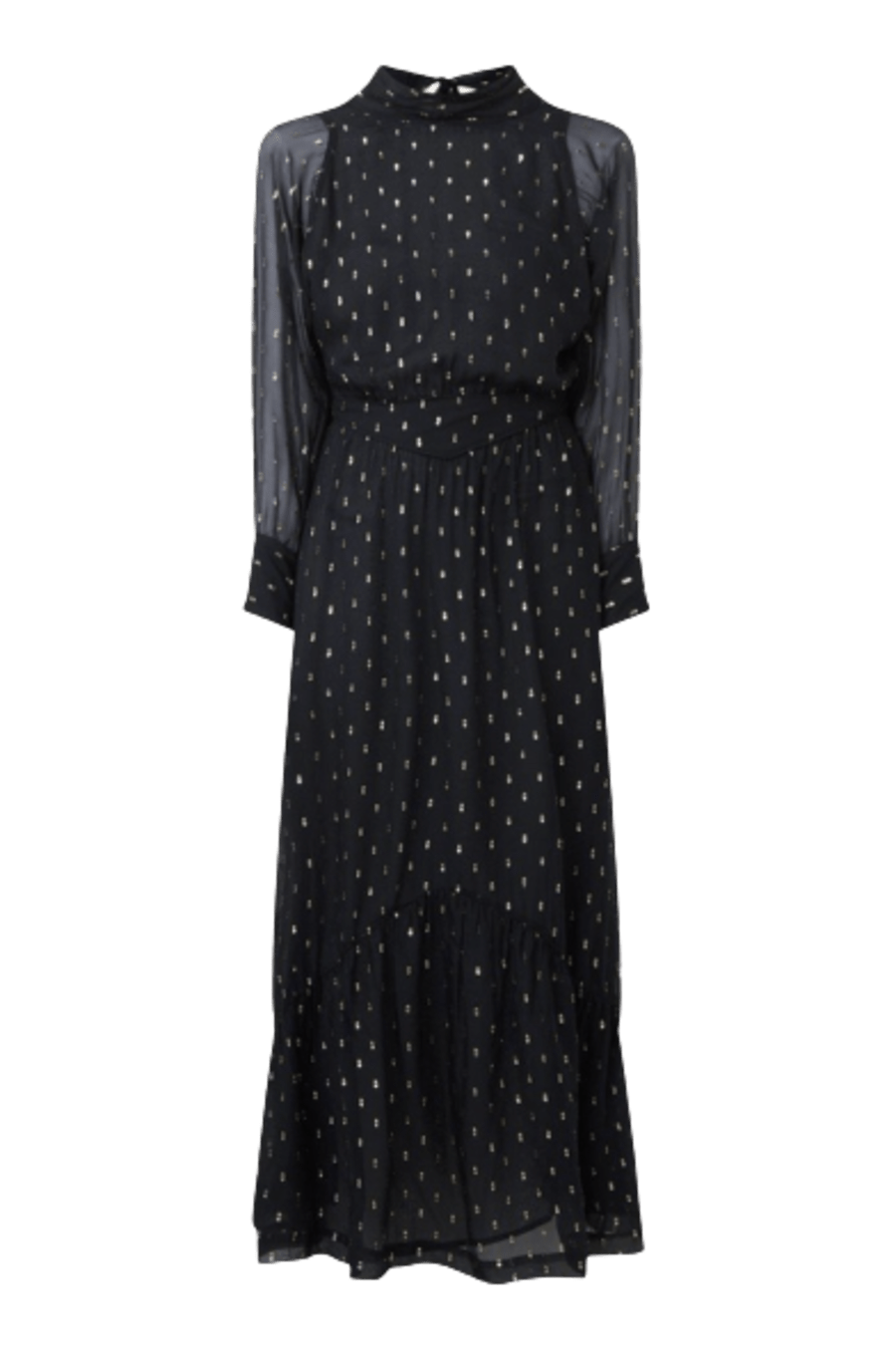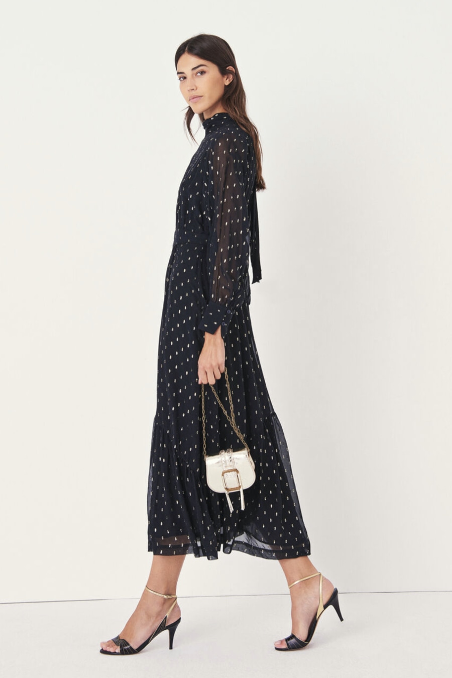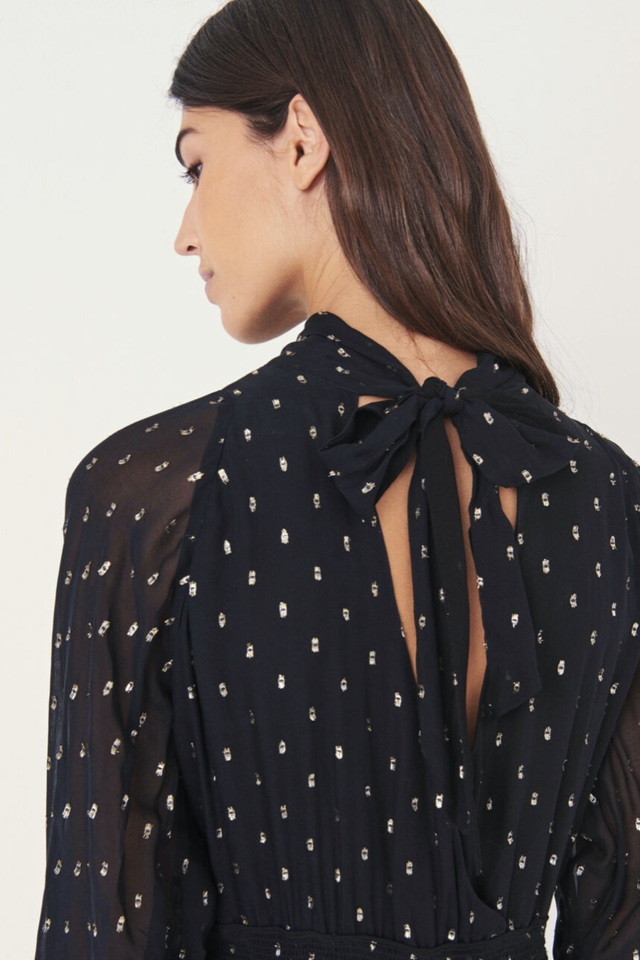 You'll love the ba&sh; ROMY dress. This long dress is cut in a breezy fabric enhanced with little touches of gold. Note the high neckline, long sheer sleeves and the gently gathered waist. In the back, the neckline extends to two panels which tie and create a wide keyhole. A feminine dress with lovely old-fashioned style.
