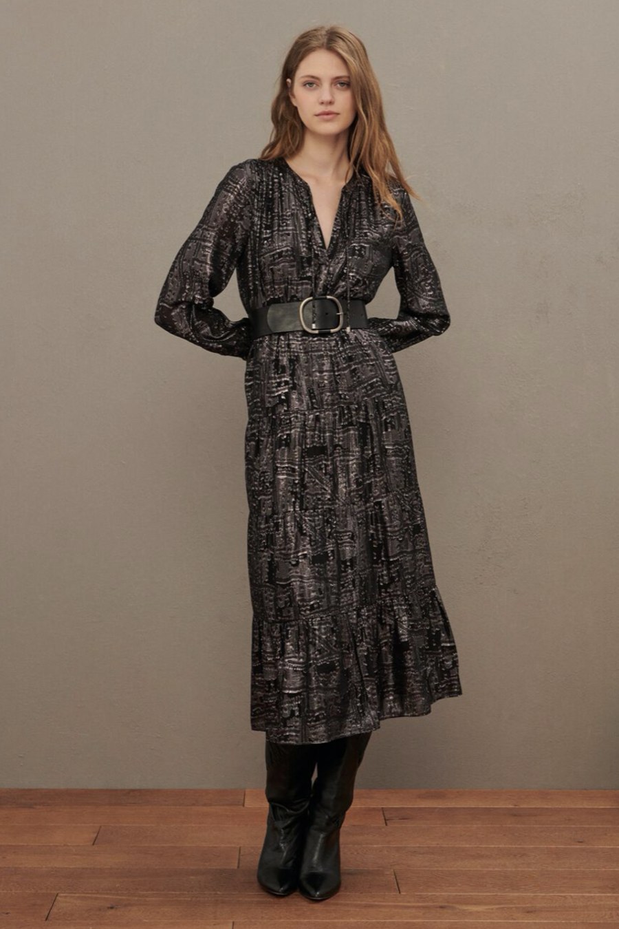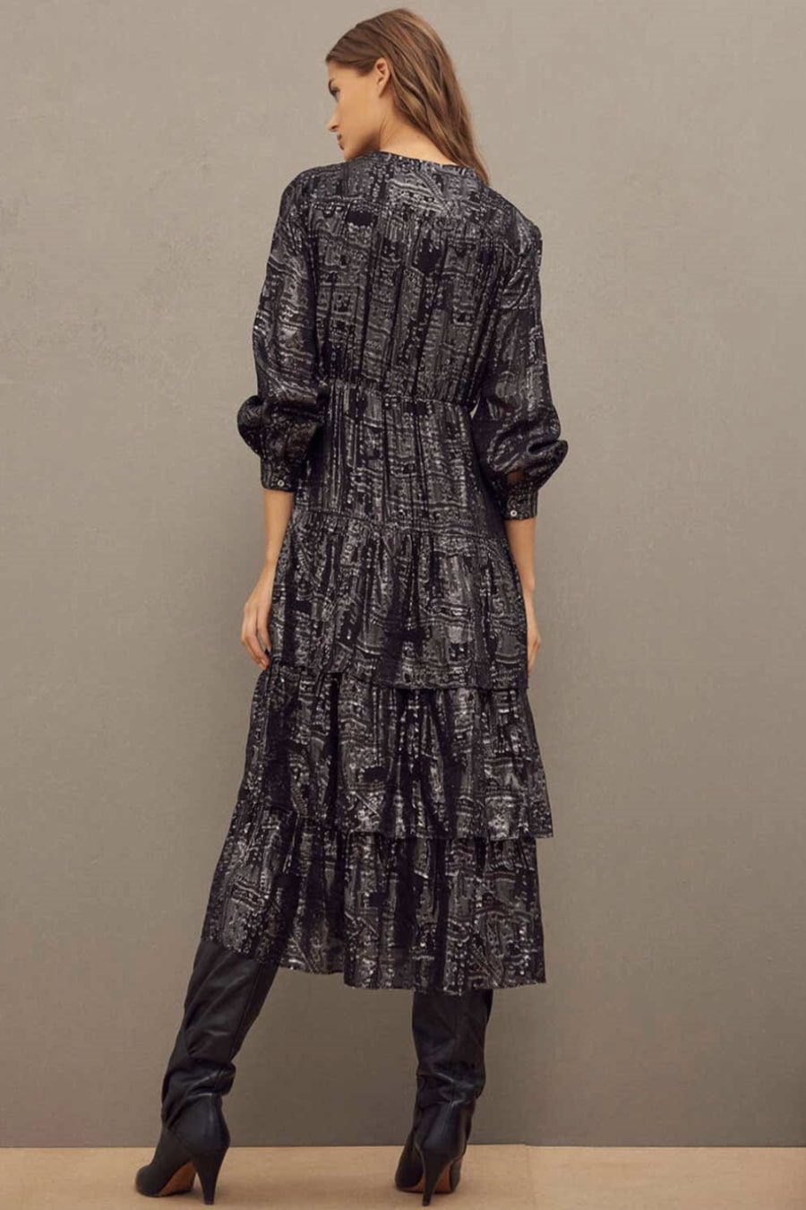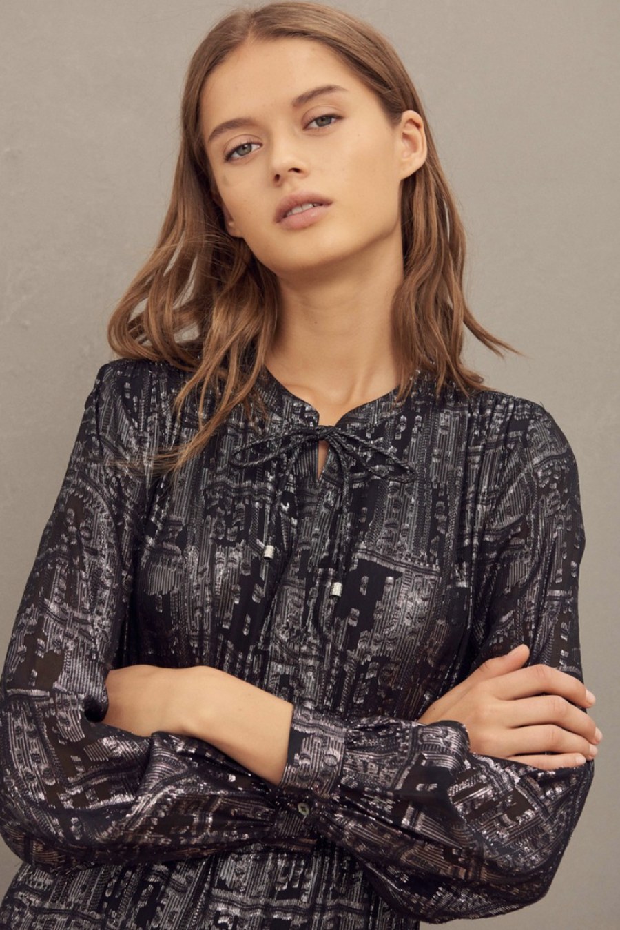 Featuring a gorgeous metallic shine, this ba&sh sophie dress in black features: beautiful black and metallic printed dress. V shaped neckline with tie up detailing. Long sleeves with buttoned cuffs. Elasticated waistband with a tiered skirt. There is always room in your wardrobe for a little sparkle, to brighten up your day. This beautiful dress can be worn for that special occasion or even dressed down slightly for a lunch with the girls.