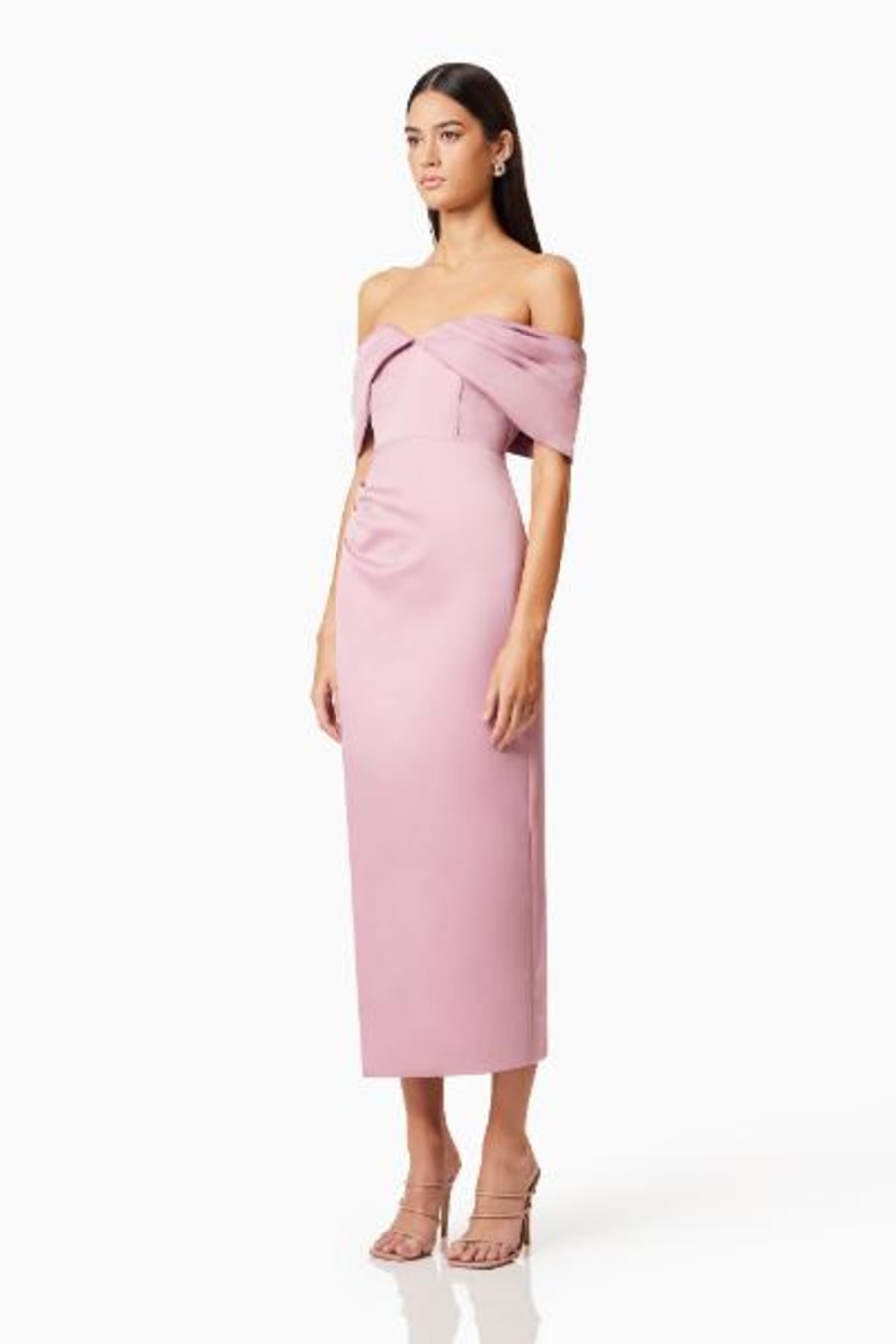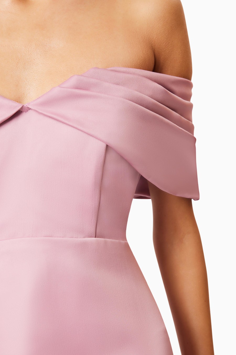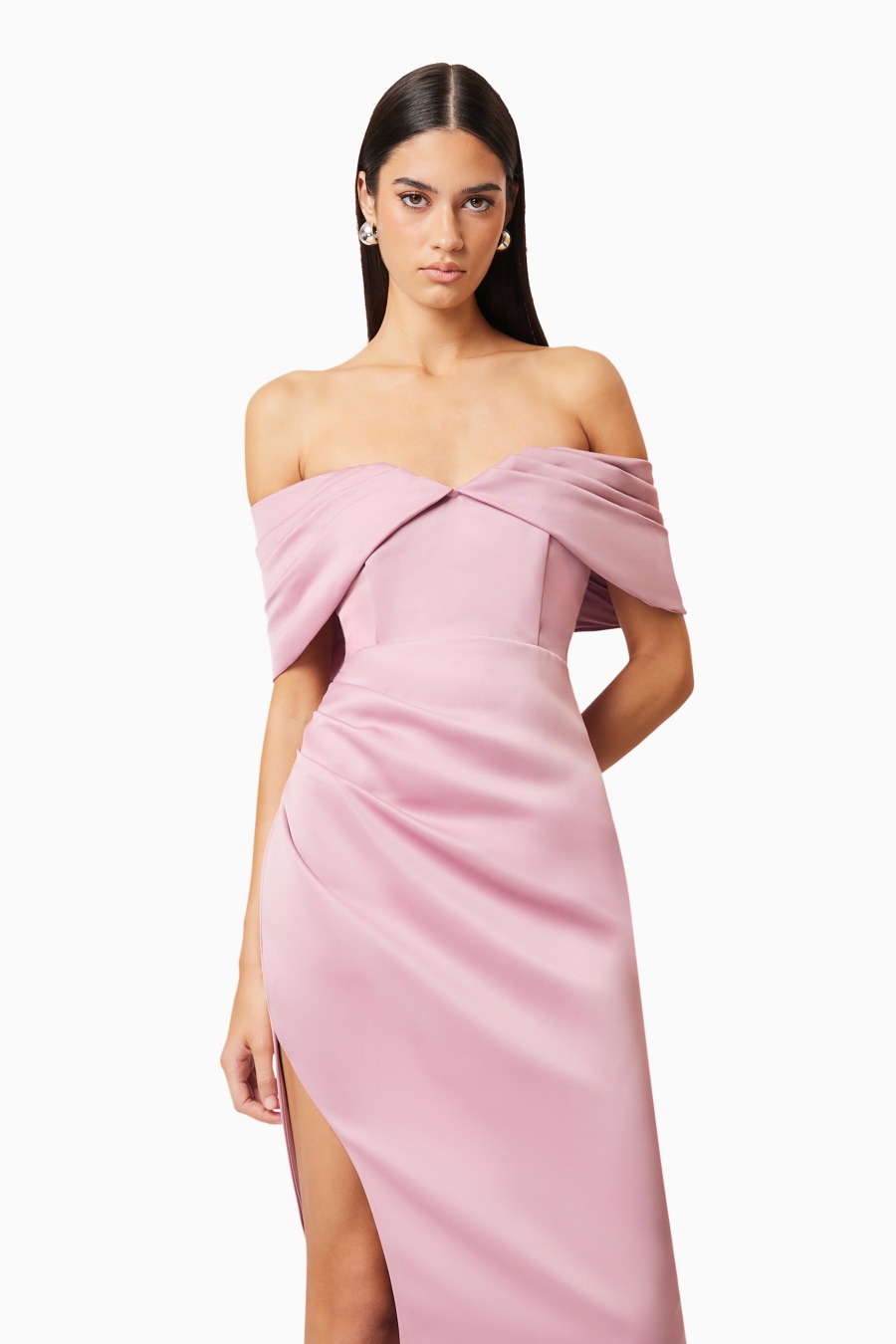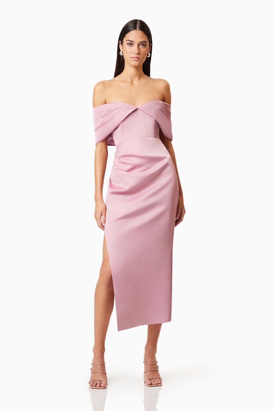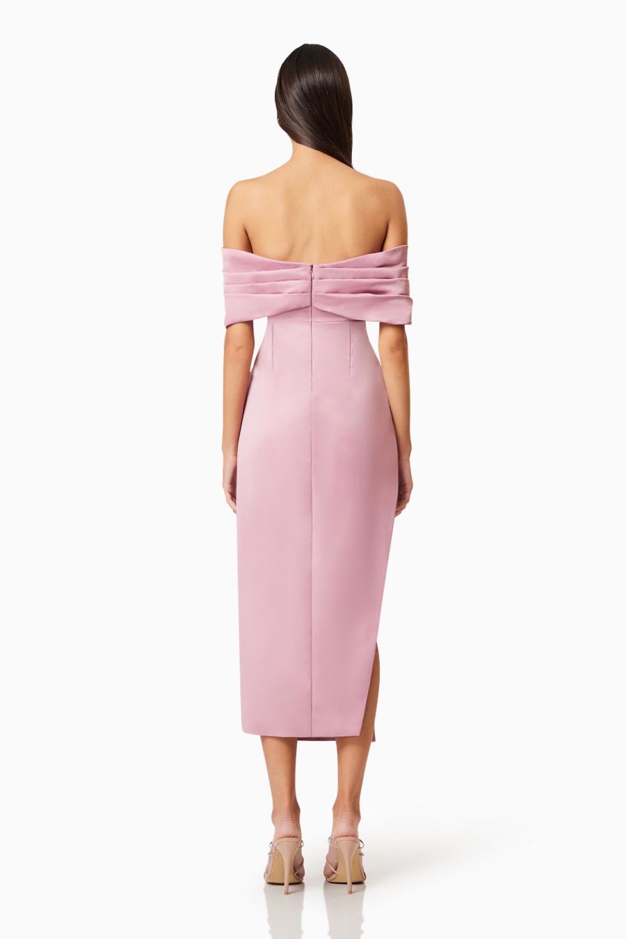 Make a statement with the Rose Off The Shoulder Midi Dress in Blush, designed for elegance and sophistication. This stunning dress features pleated off-the-shoulder sleeves, giving it a delicate, romantic flair. The side split adds a touch of allure, ensuring you turn heads as you move. Crafted from luxurious duchess satin fabric, this dress exudes high-end style and smooth comfort, making it ideal for weddings, cocktail parties, or any formal occasion.