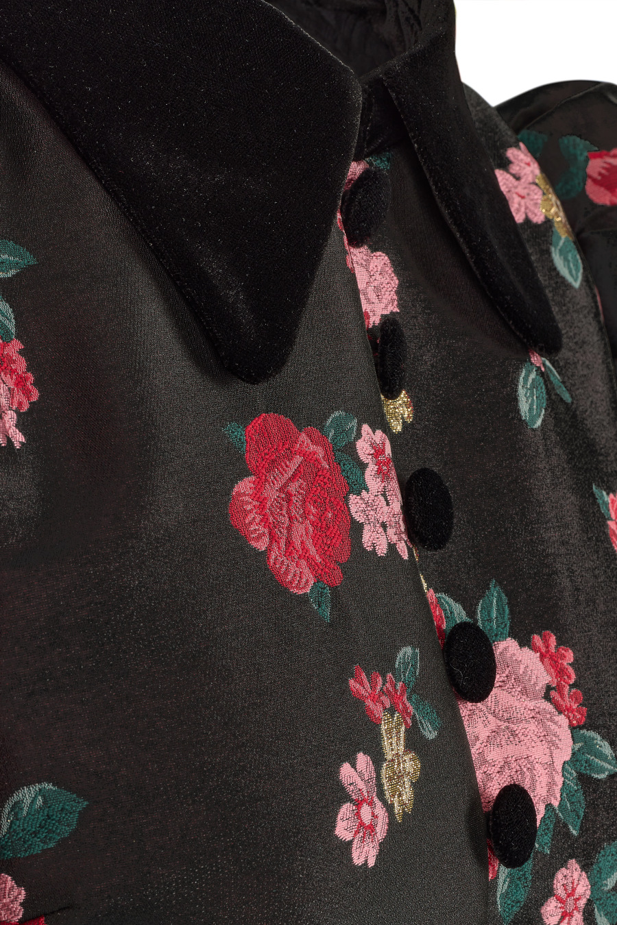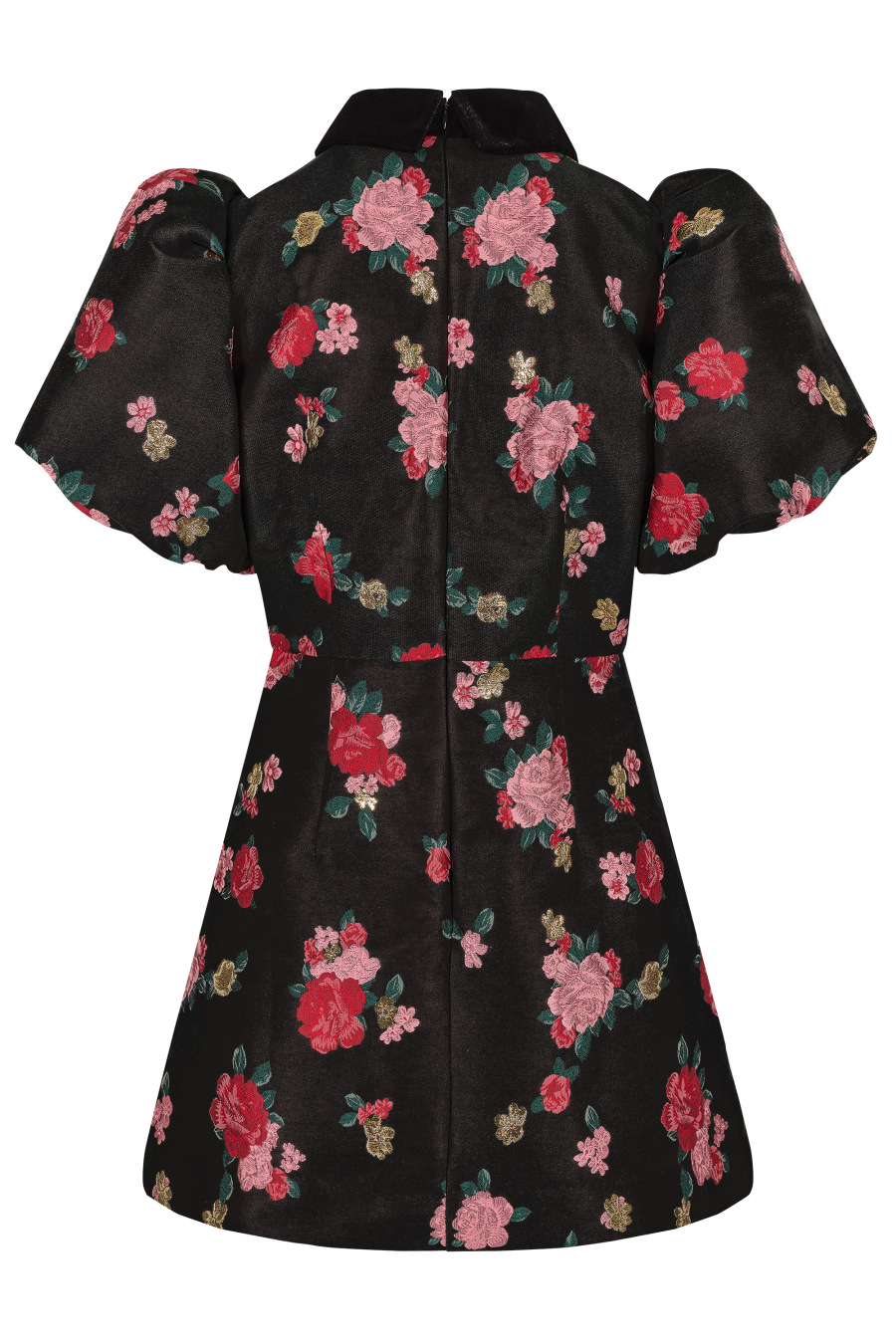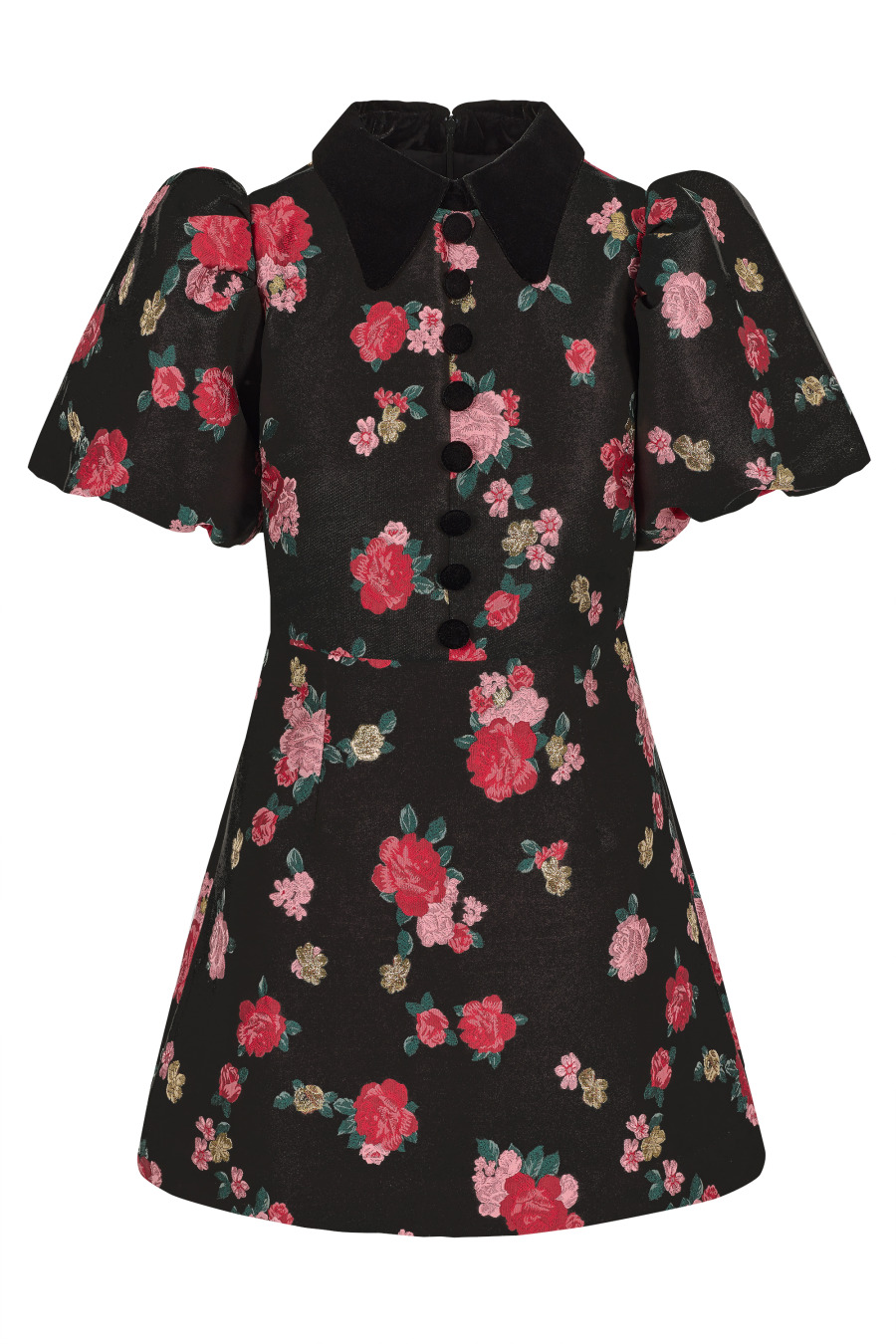 A Line Rose brocade mini dress with black velvet collar, mock black velvet covered button front detail, puff ball sleeves and fitted waist.