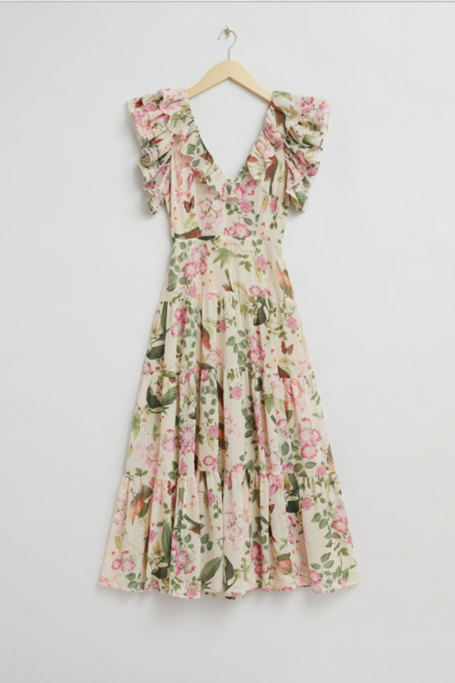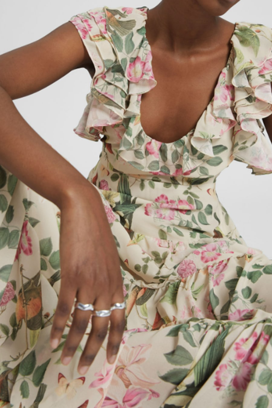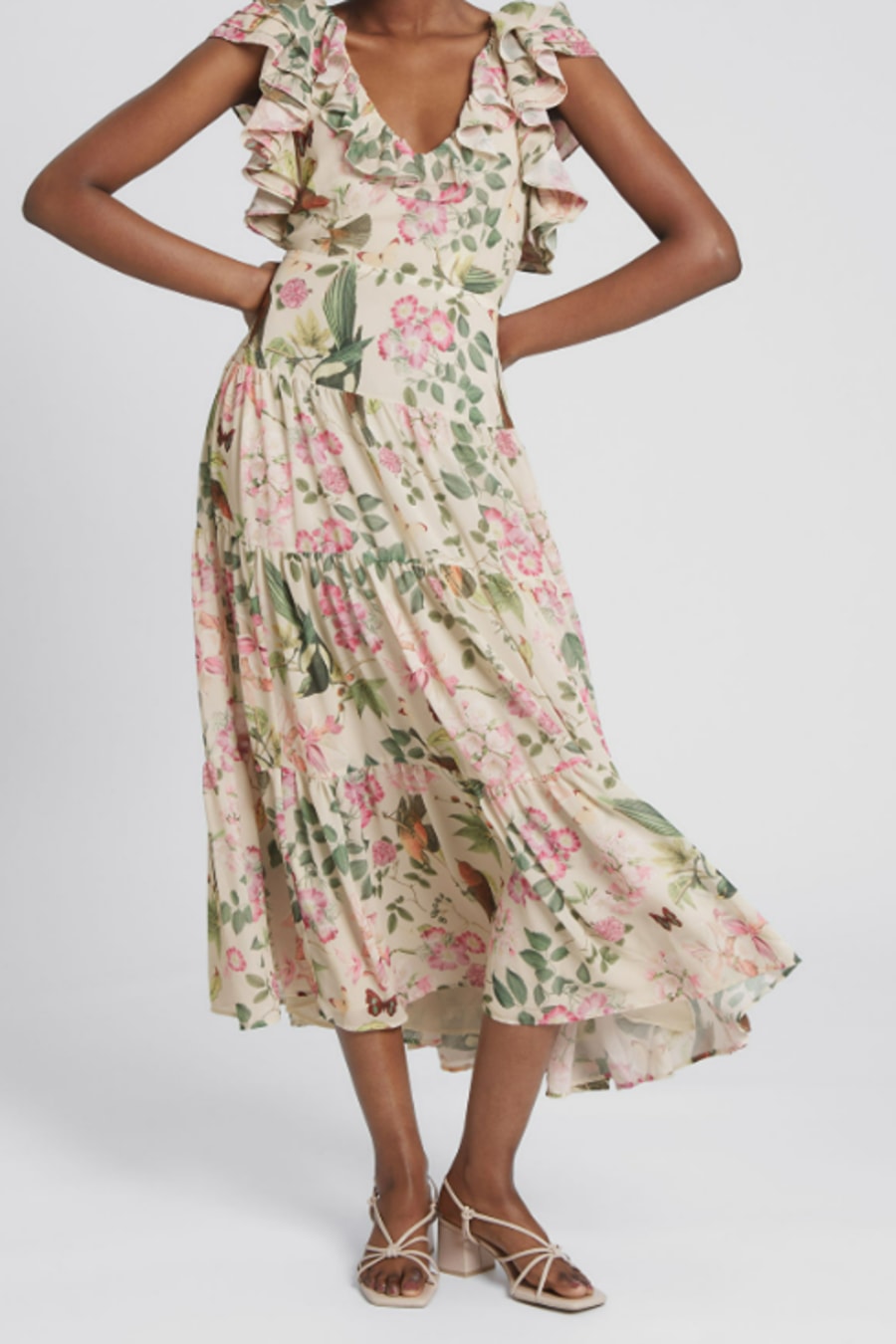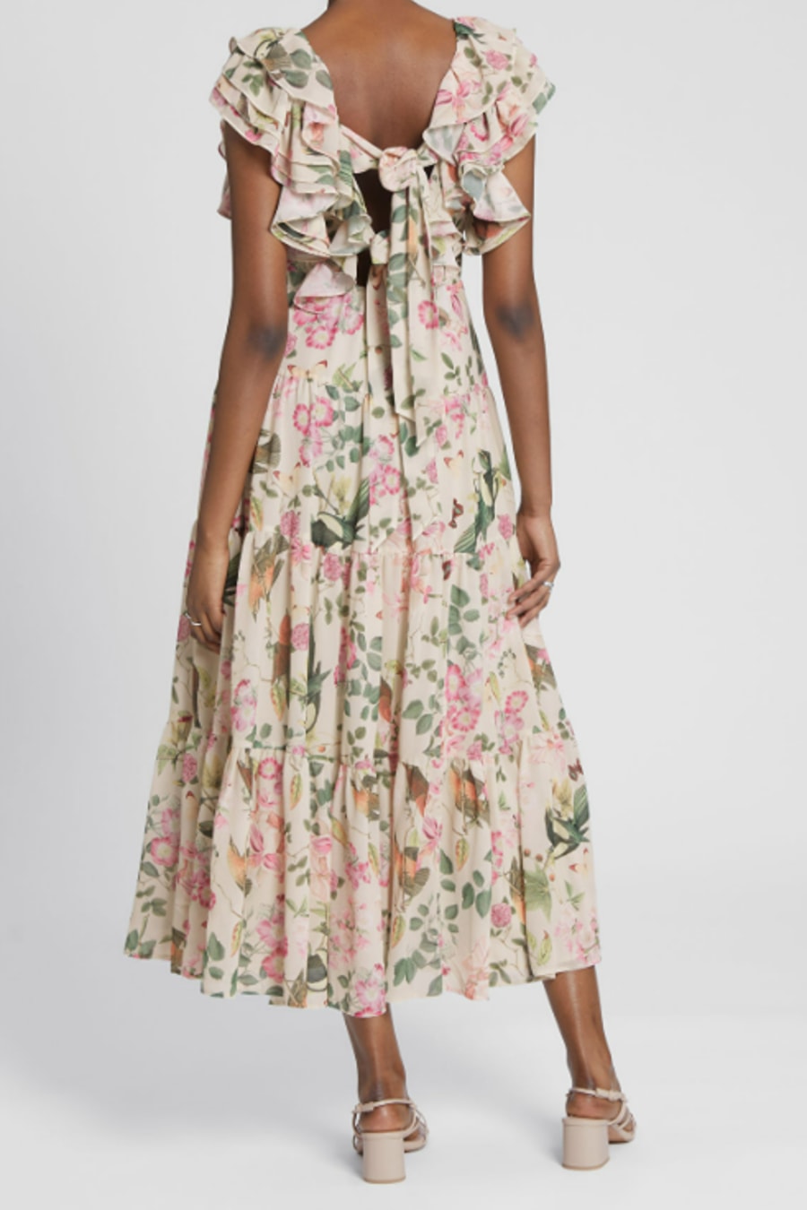 Ruffle detail voluminous tiered dress crafted from chiffon featuring a sleeveless top, a v-cut neckline finished with ruffle edges, and an open back secured with two back ties. A long multi-tiered voluminous skirt cut in a maxi length. Finished with an invisible side zip closure.
