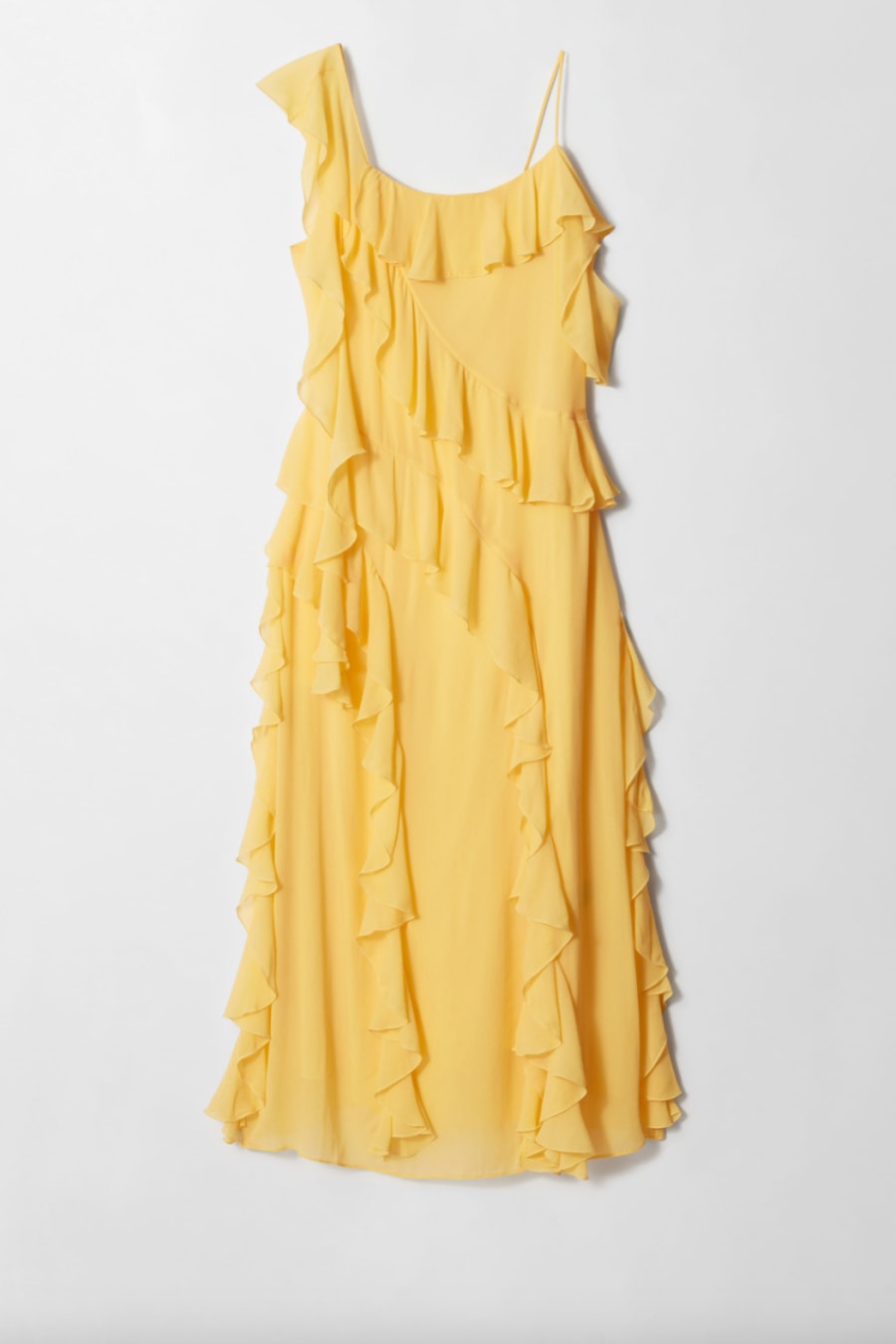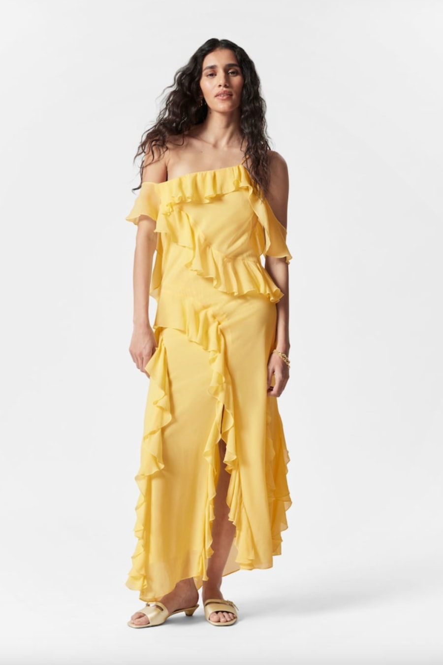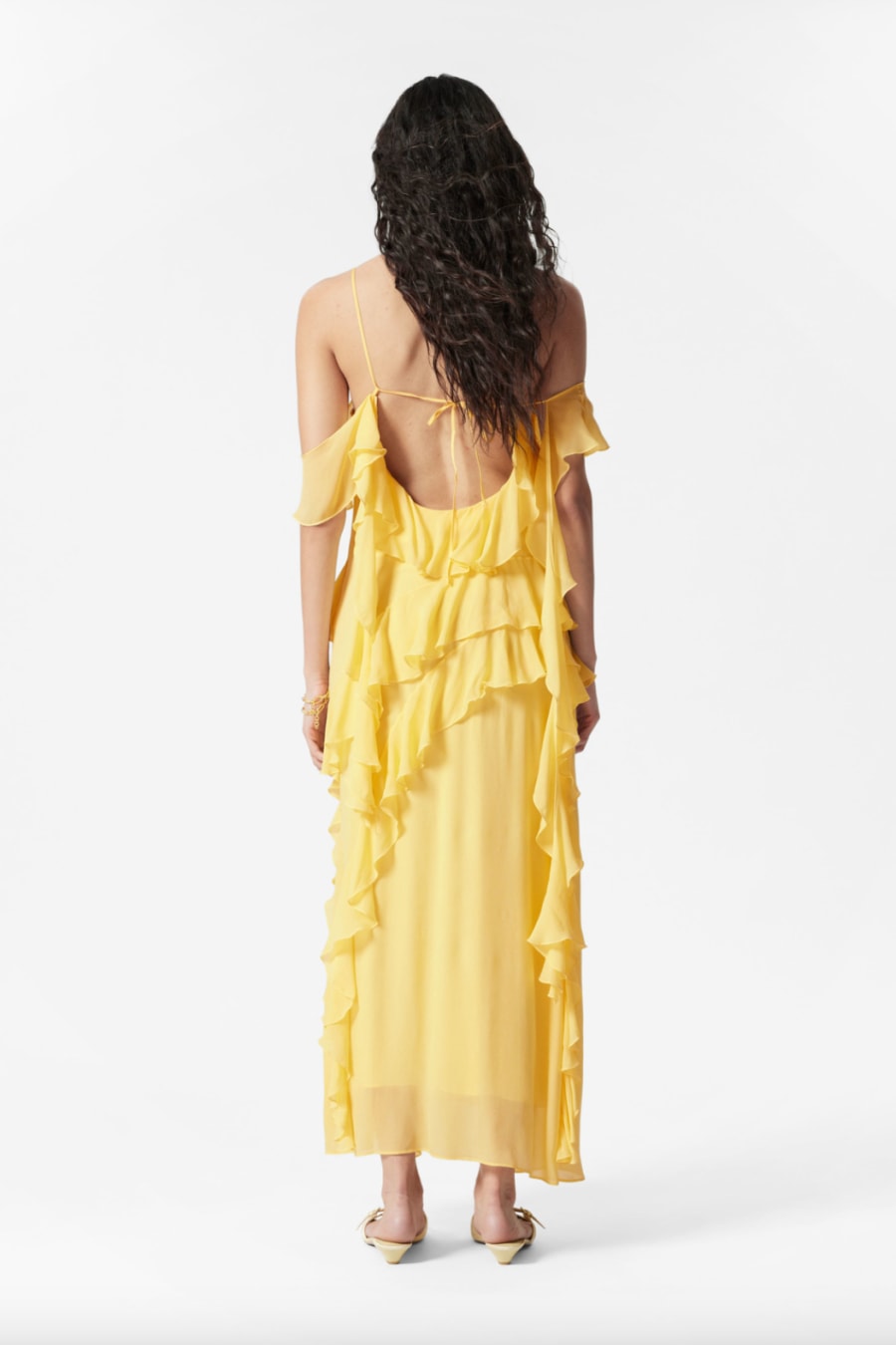 Maxi dress crafted from a light chiffon fabric. Designed with an asymmetric neckline, thin shoulder straps, and all-over flounced layers for a flowy silhouette. Featuring a slit in the front hem, and a low cut back with a self-tie strap.