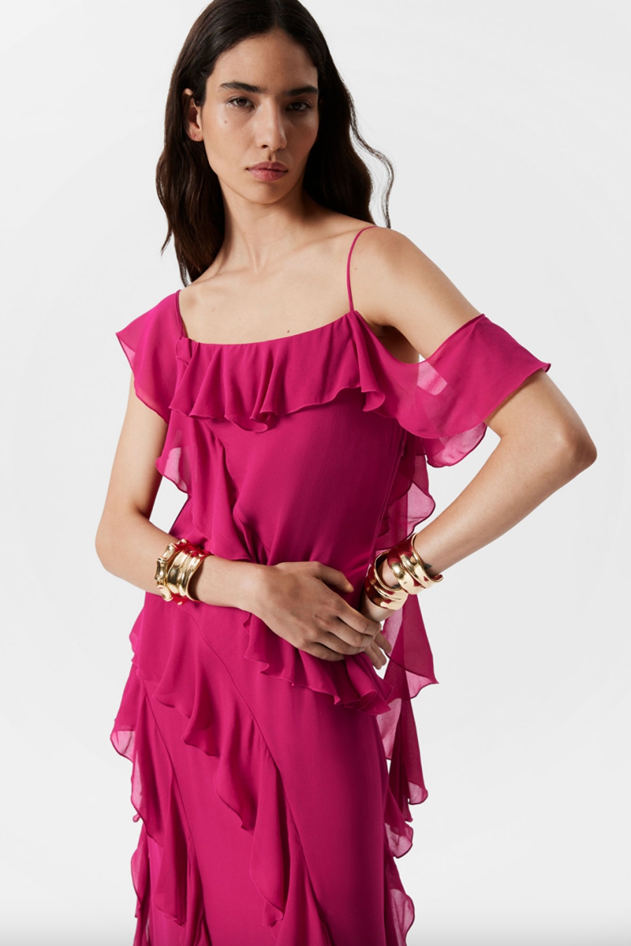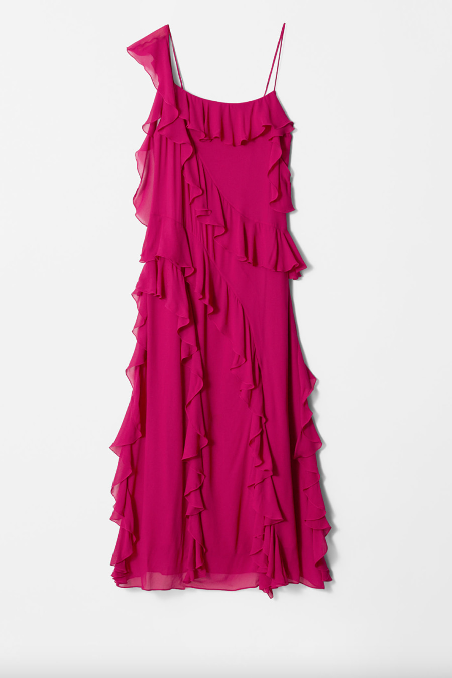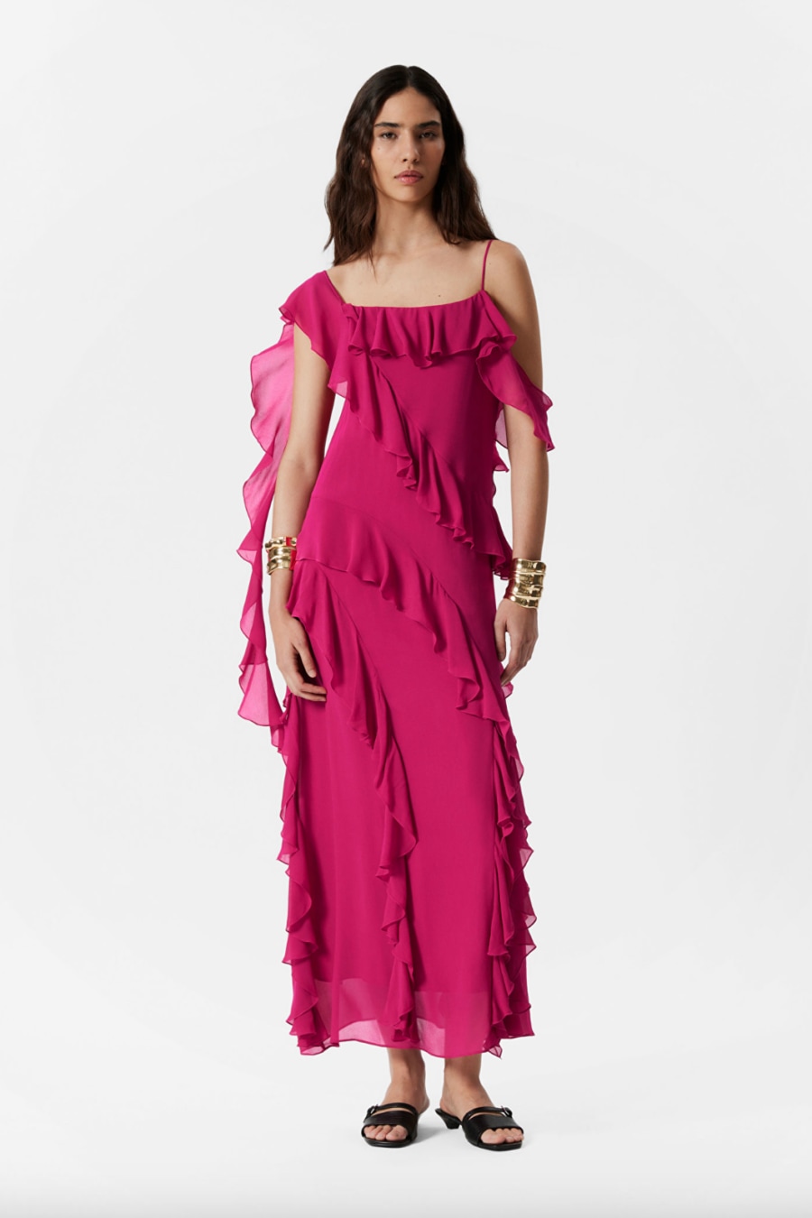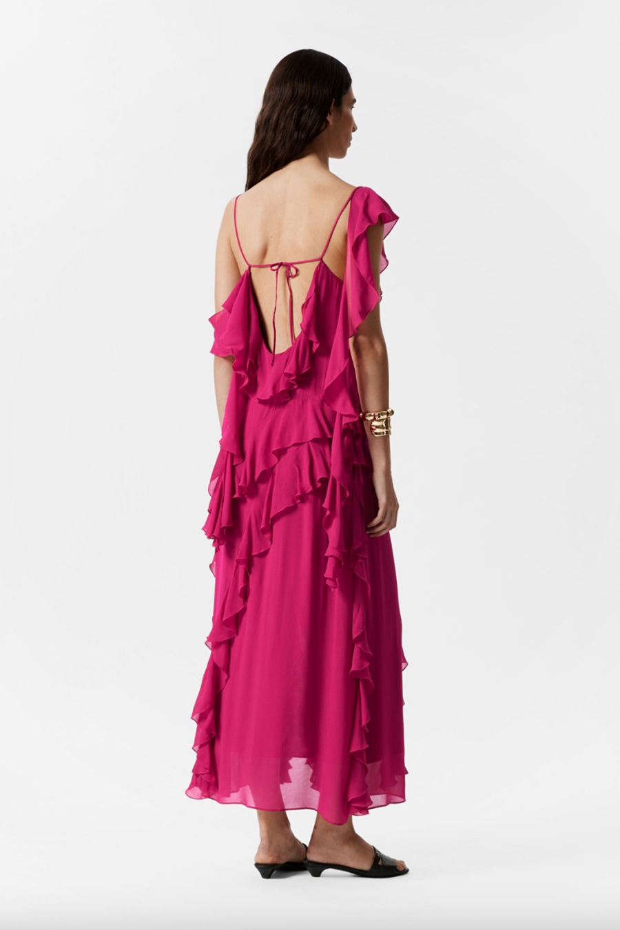 Maxi dress crafted from a light chiffon fabric. Designed with an asymmetric neckline, thin shoulder straps, and all-over flounced layers for a flowy silhouette. Featuring a slit in the front hem, and a low cut back with a self-tie strap.