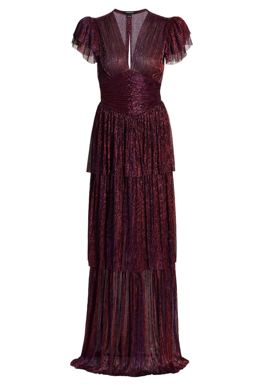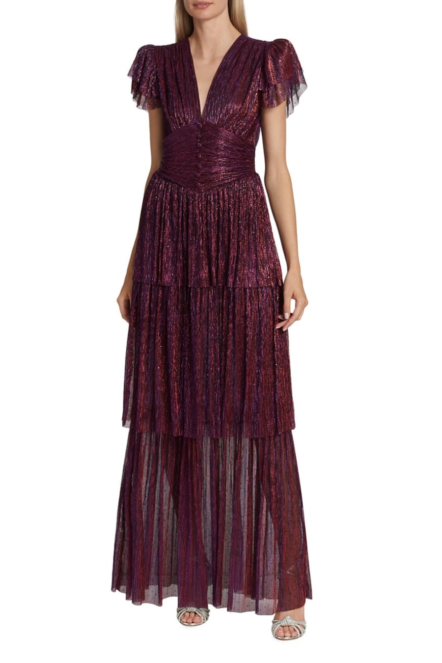 Crafted of plissé knit, SABINA MUSÁYEV's Sarah sequin maxi dress features a plunging V-neck, ruffled short sleeves, and midriff roke with coated mock buttons.