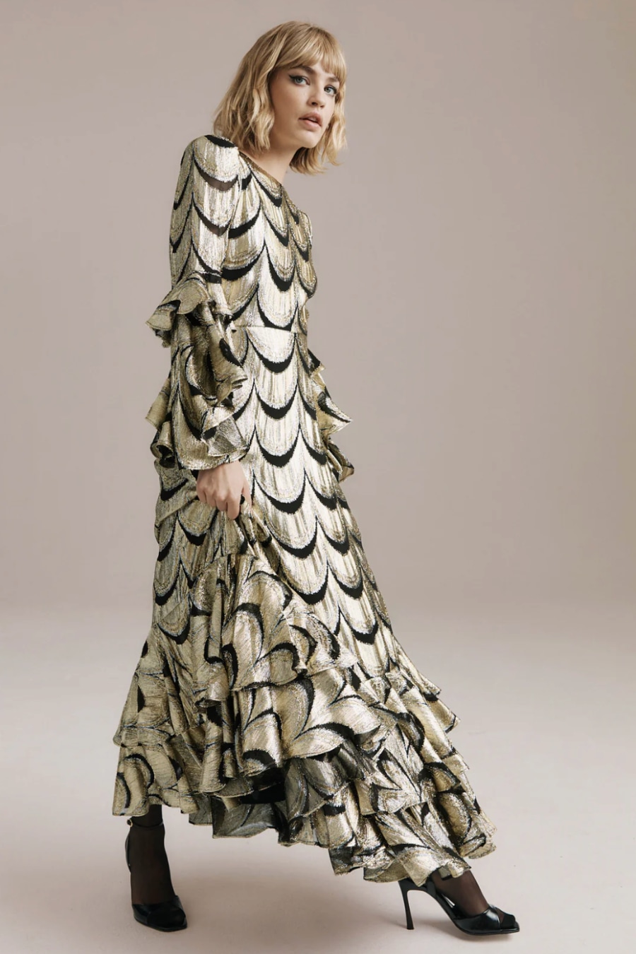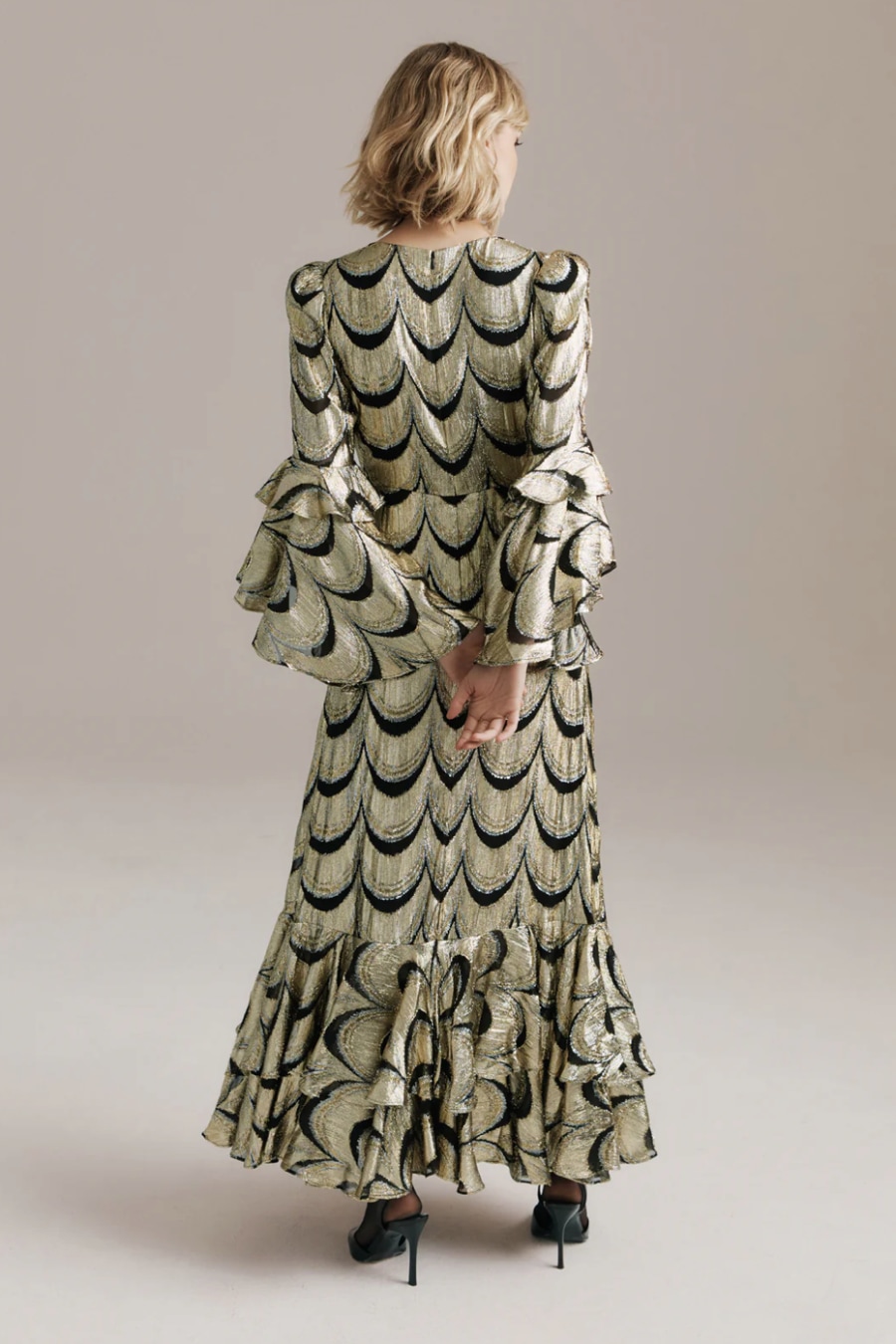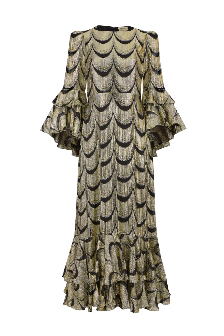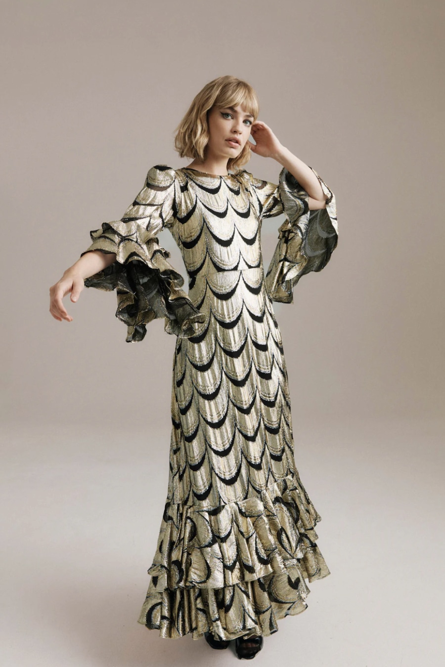 Scarlet is unapologetically bold. Cut from scalloped metallic fabric that gleams with every movement, she captures the spirit of a Studio 54 siren and the elegance of old Hollywood. Fluted sleeves ripple with theatrical flair, while her floor-sweeping hem glides like liquid light.