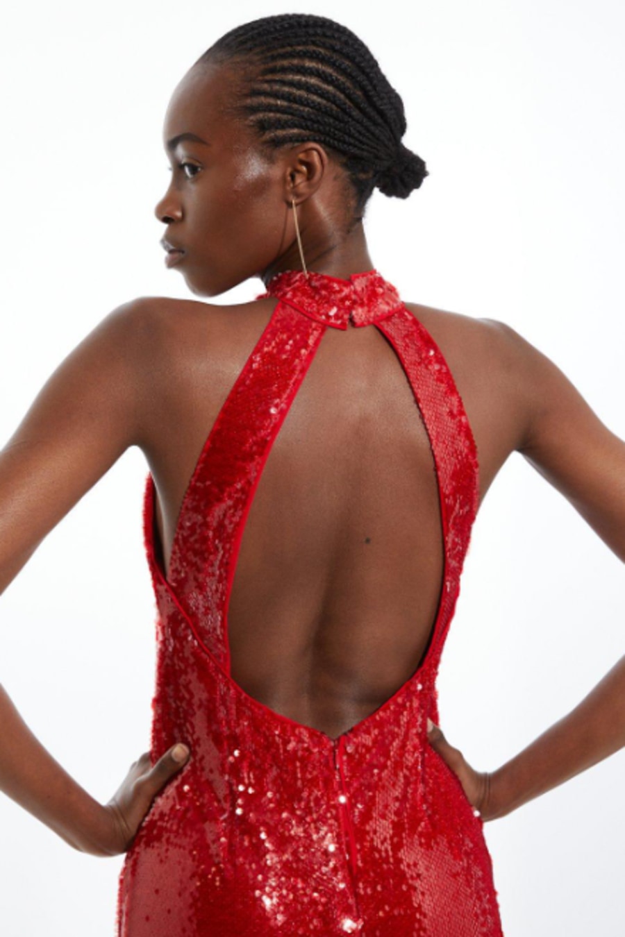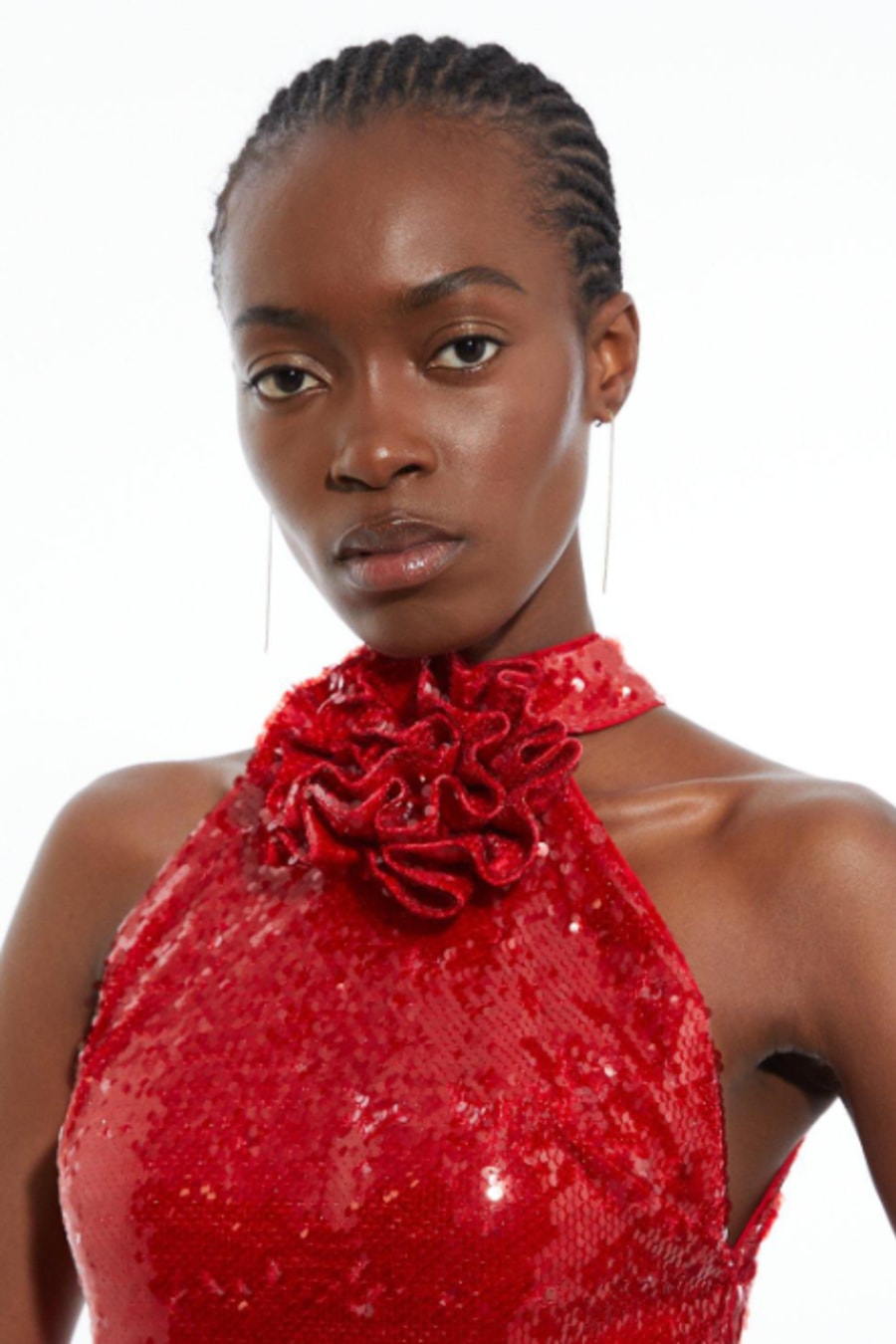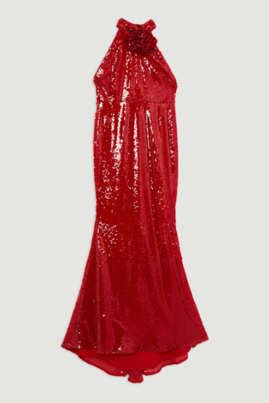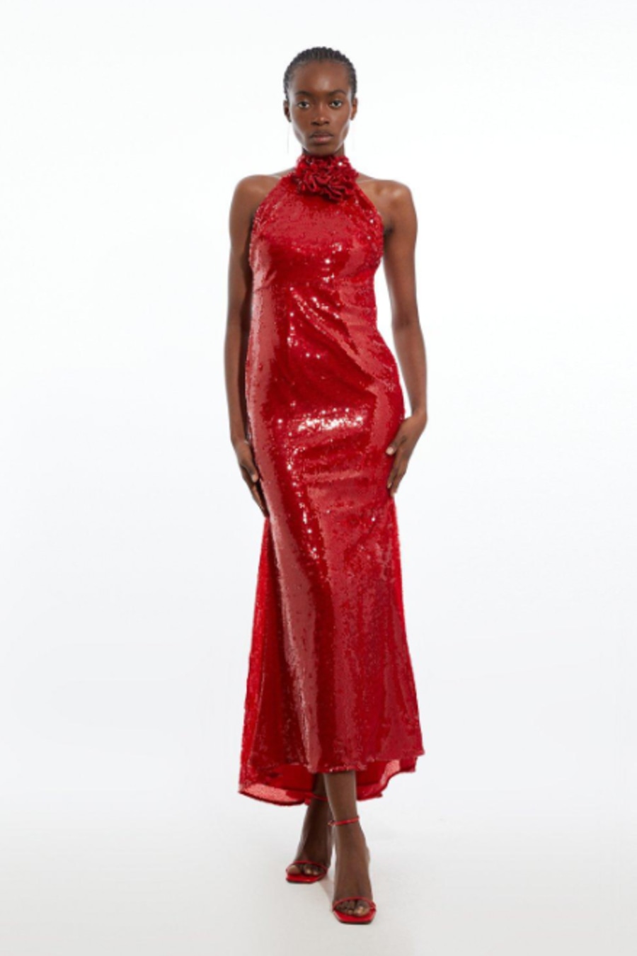 Feel like the centre of attention in our maxi dress, made with dazzling sequin fabric, featuring a fit that hugs the curves, a rosette accent at the neck, and a halter neckline that leads to a backless design. Styles well with strappy heels for a statement occasion look, perfect for prom night, wedding reception dresses, and formal occasions.