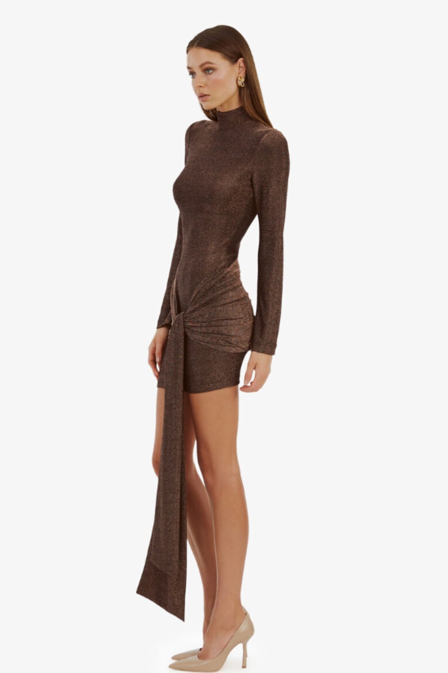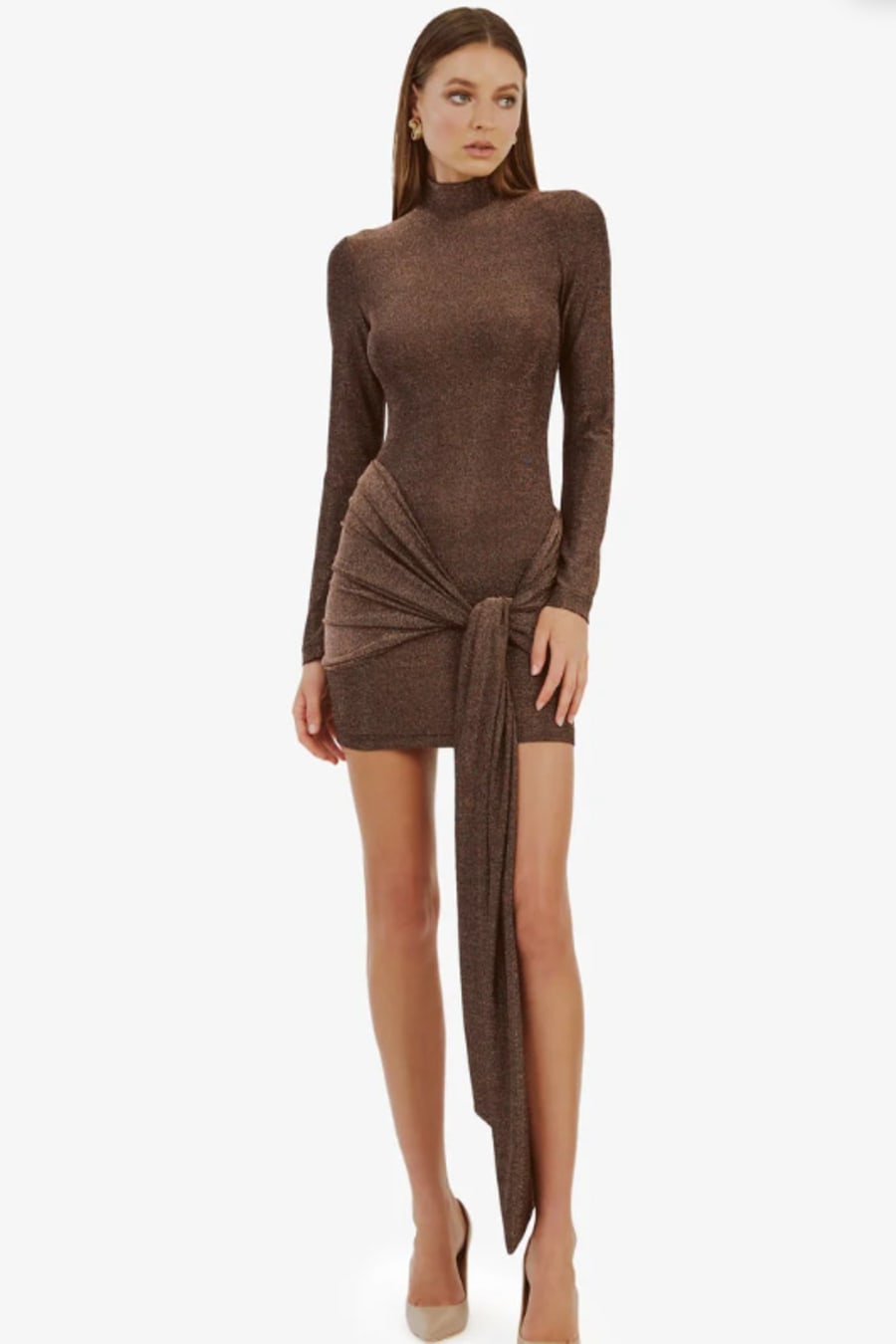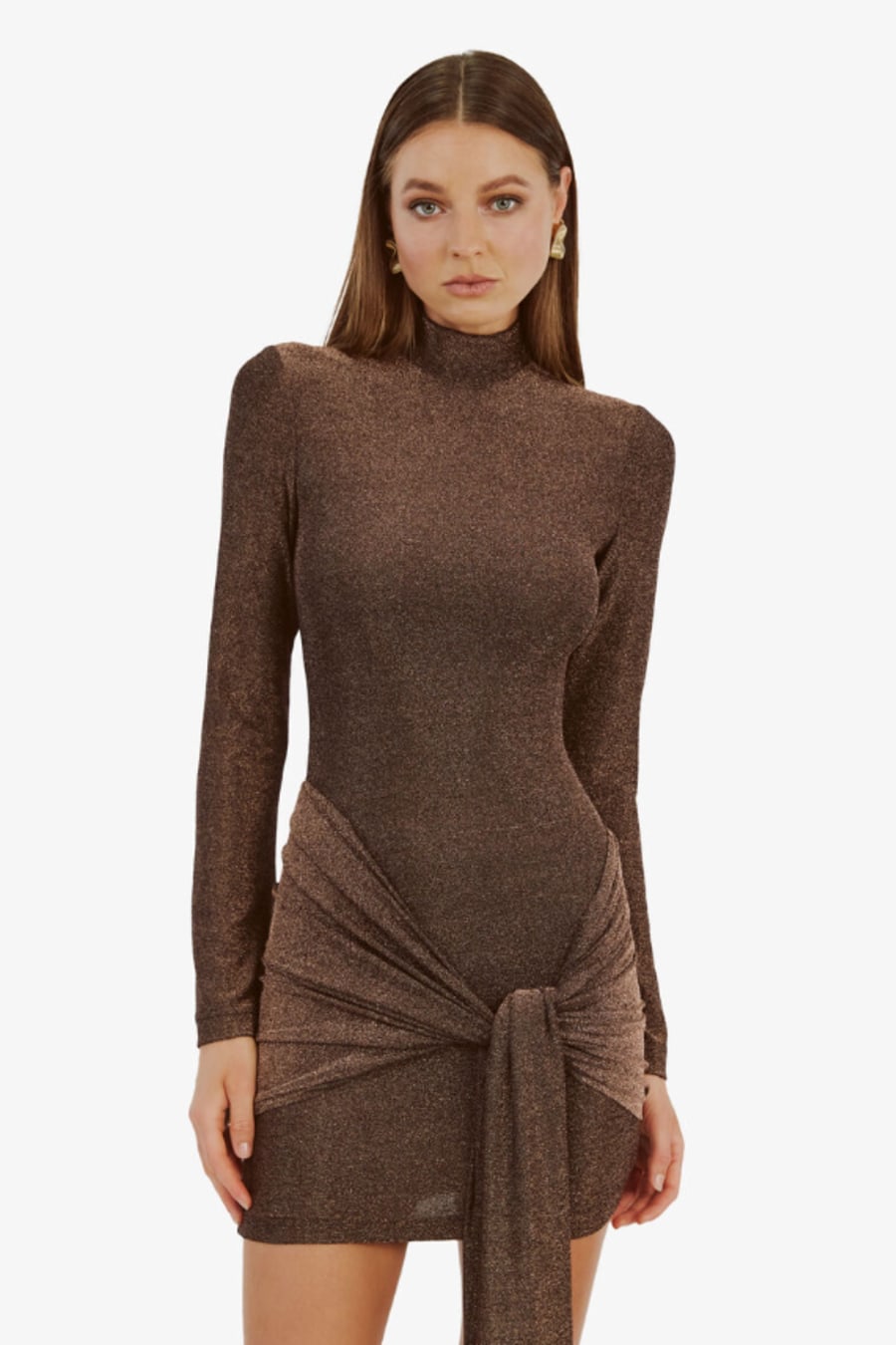 If party-ready is the objective. The Seraphina Tie Front Dress is designed for desire in a mini-length silhouette with long sleeves, a high neckline, statement front tie detail and a fit to form.