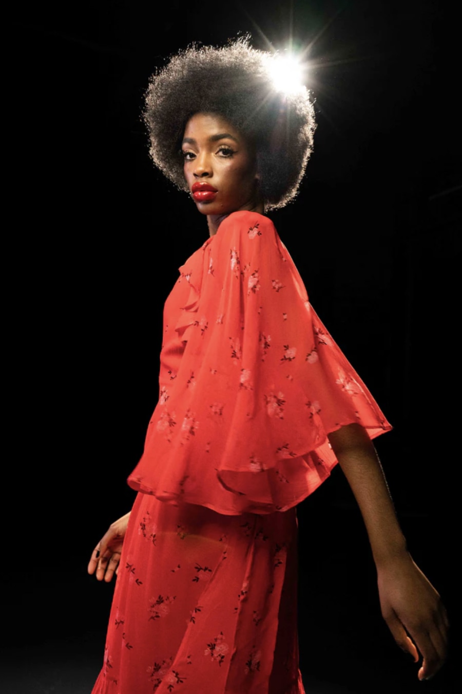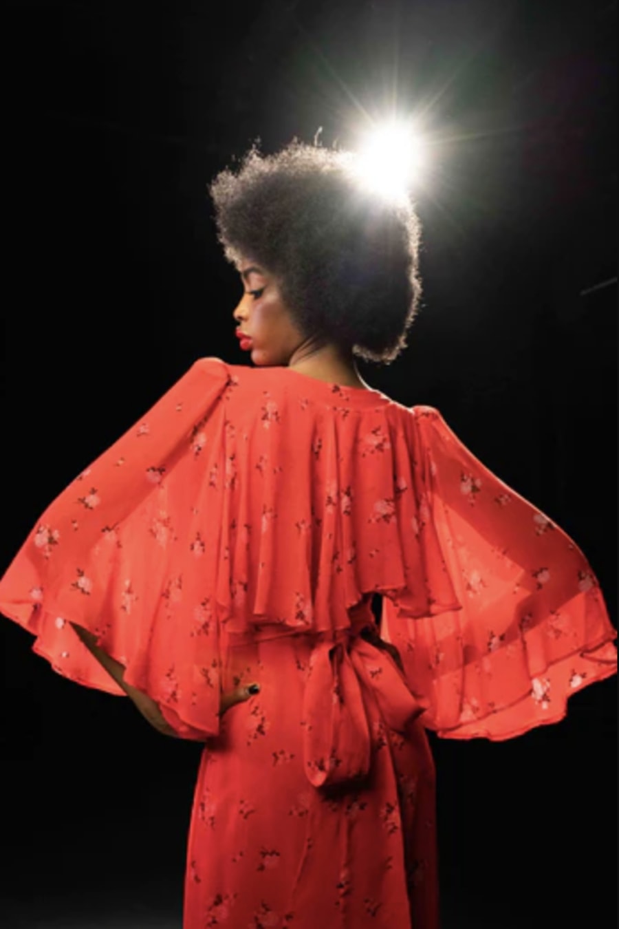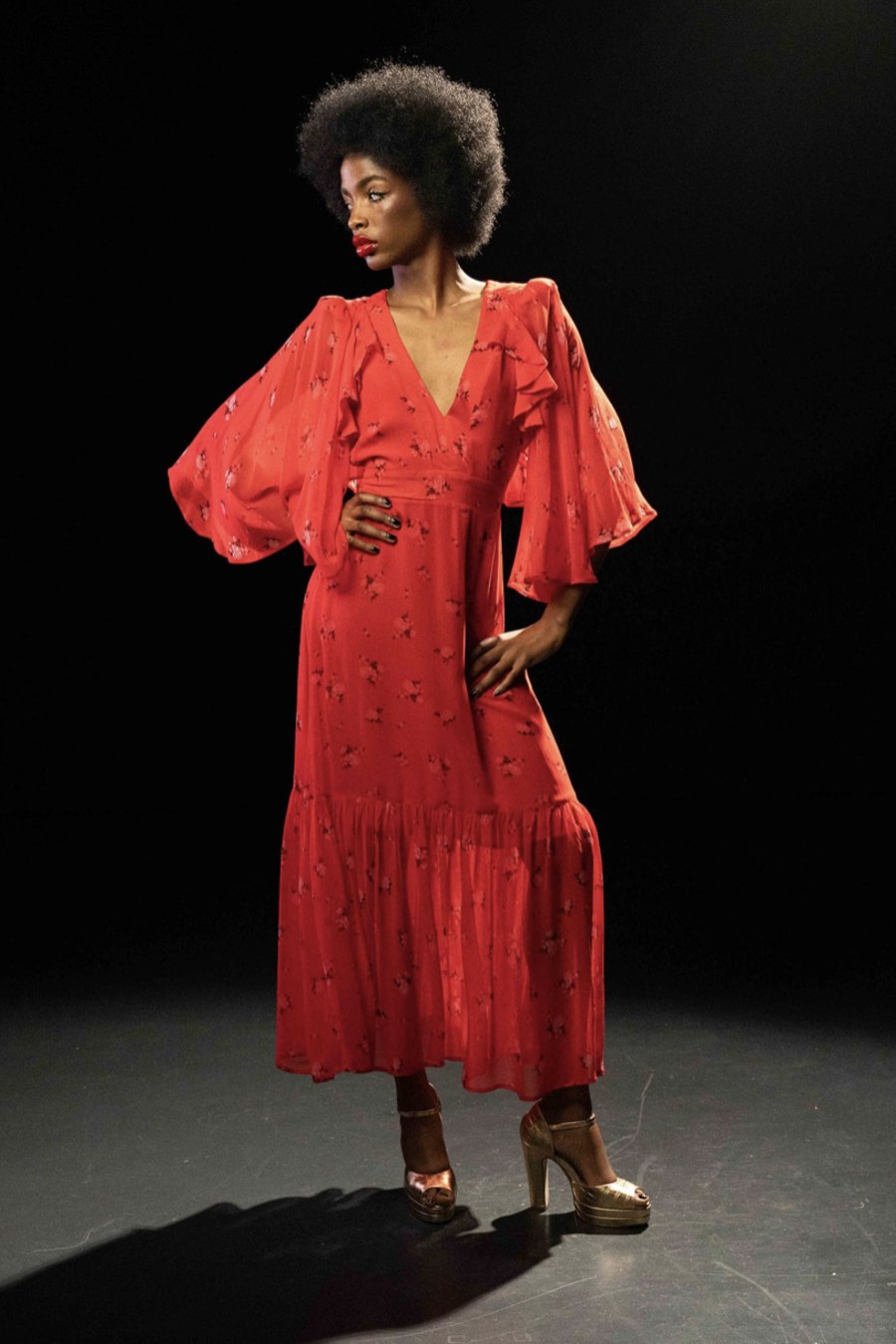 Feast your eyes on this timeless creation. Simone dishes out 70s bohemia in abundance. Her light chiffon base, angel sleeves & our new cape back silhouette give way to floating on air.