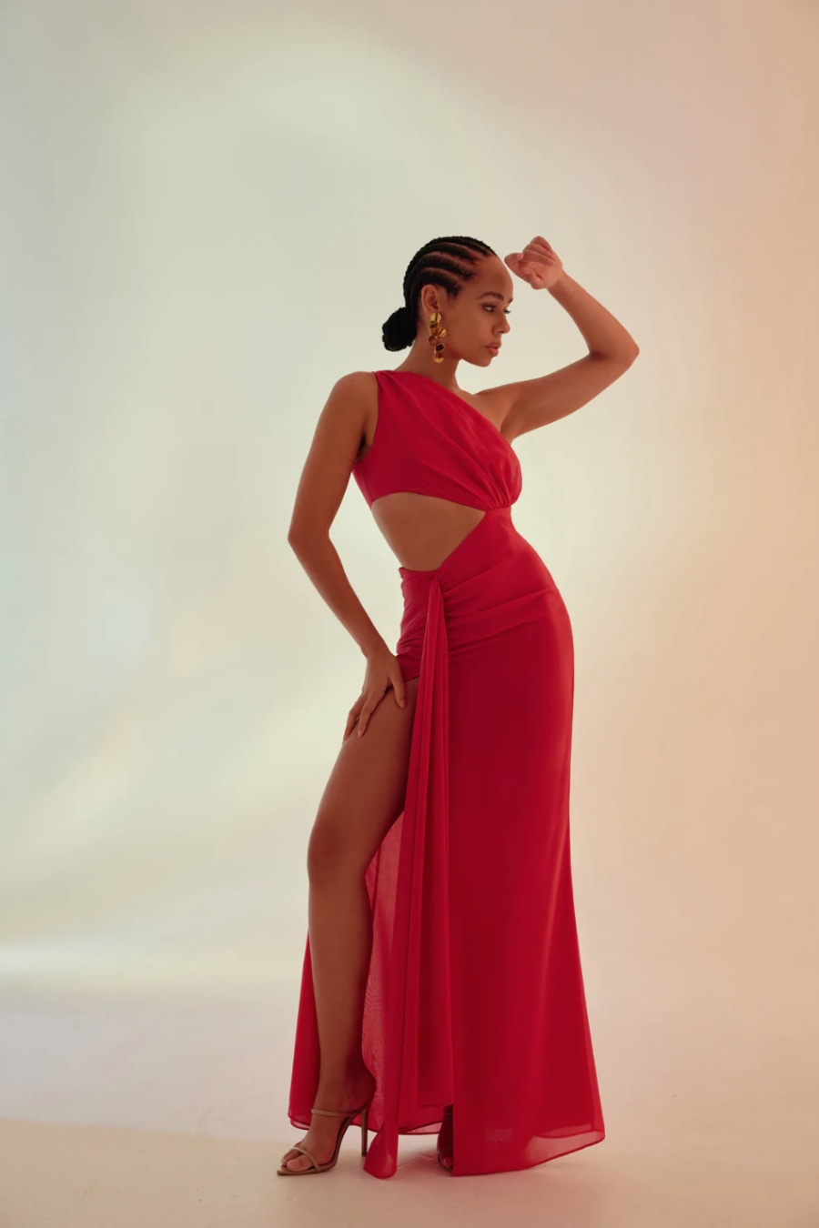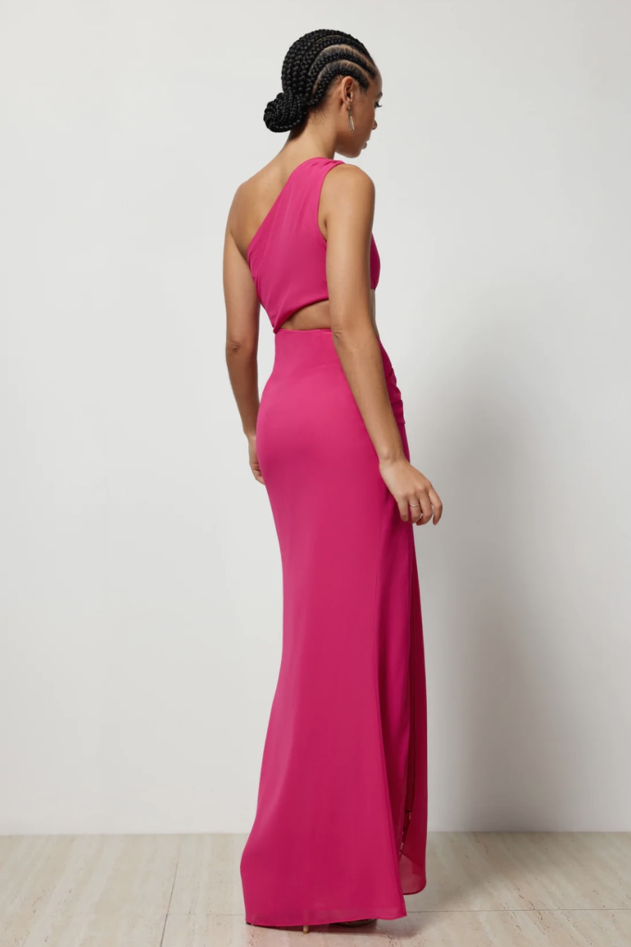 The Sol dress features a one shoulder, asymmetric bodice with a sexy waist cut out. The flattering ruching across the hip, paired with the dipped waistline, creates the ultimate cinched waist look. The dress is cut from a delicate georgette featuring a sash overlay and sexy thigh high split.
