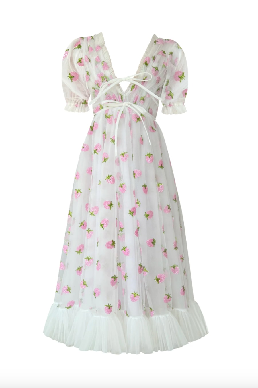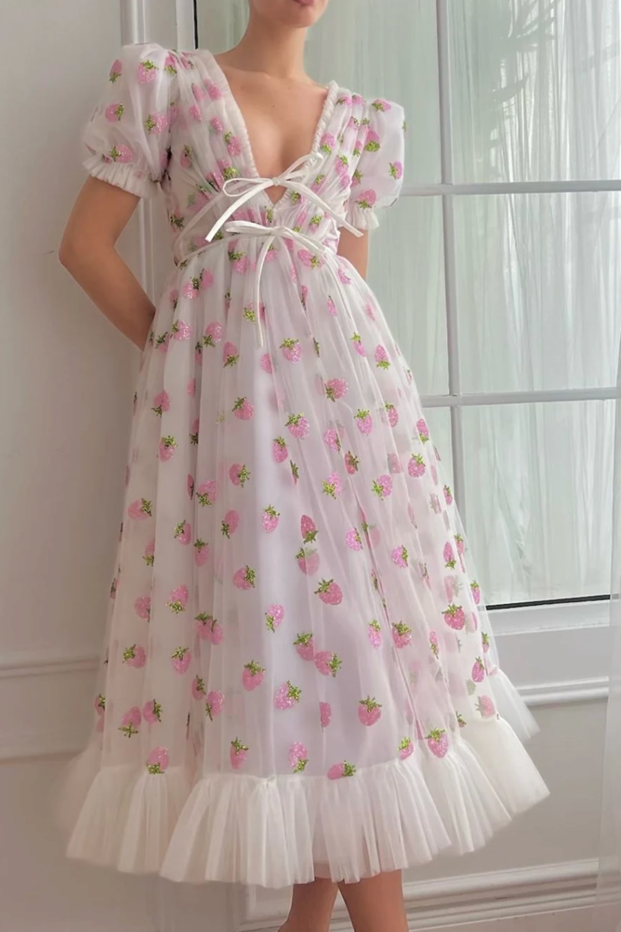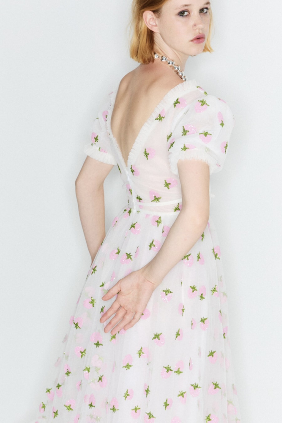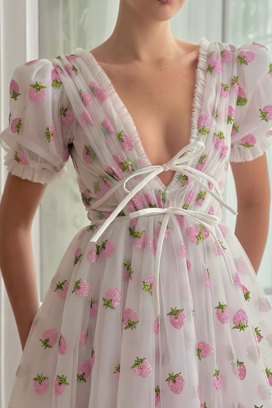 The perfect head turner dress featured by a midi dress silhouette covered in glittery strawberries. The tie up detail and the puffy sleeves make the dress even more fabulous. The dresses length from waist down is 33 inches. Made of 100% polyamide tulle, pvc glitter, environmental protection glue.