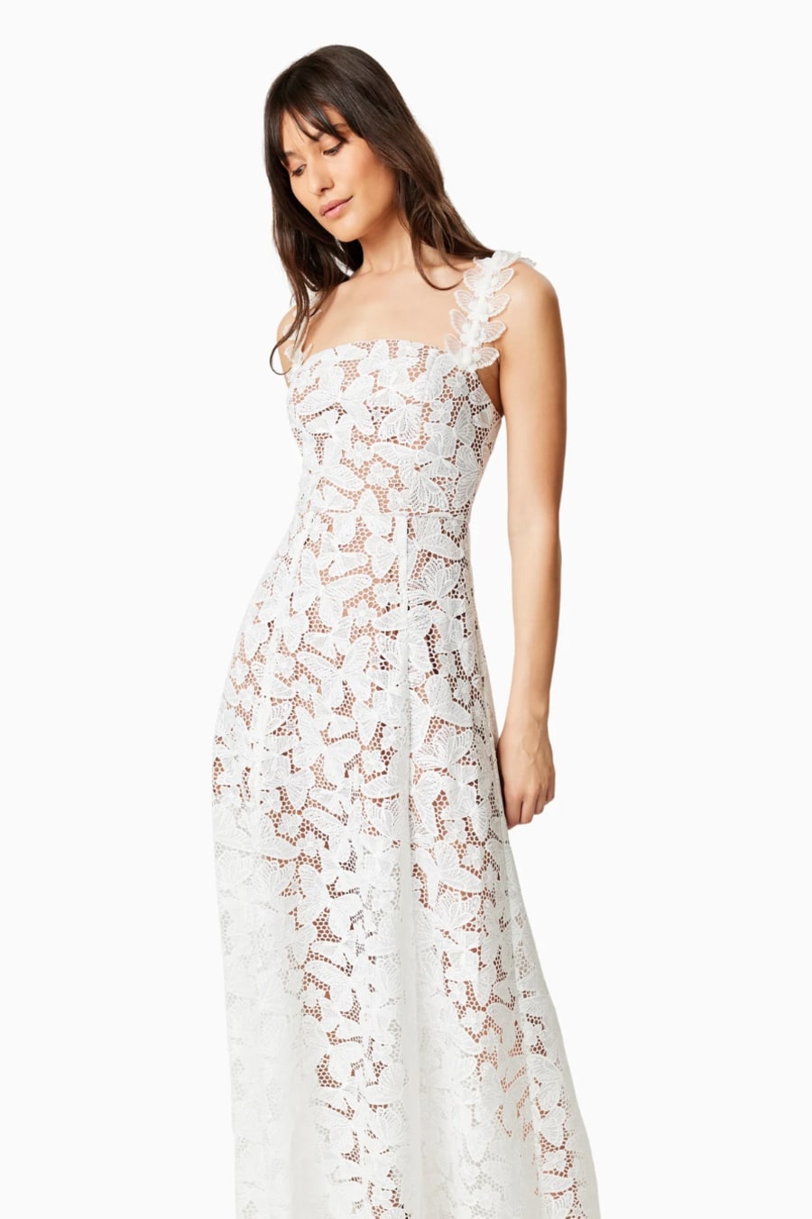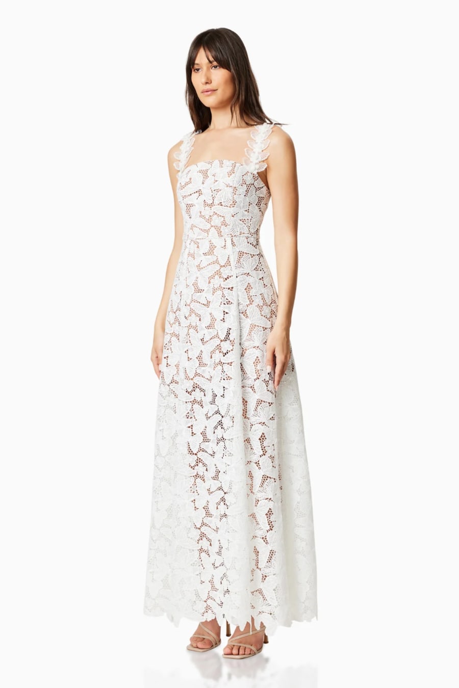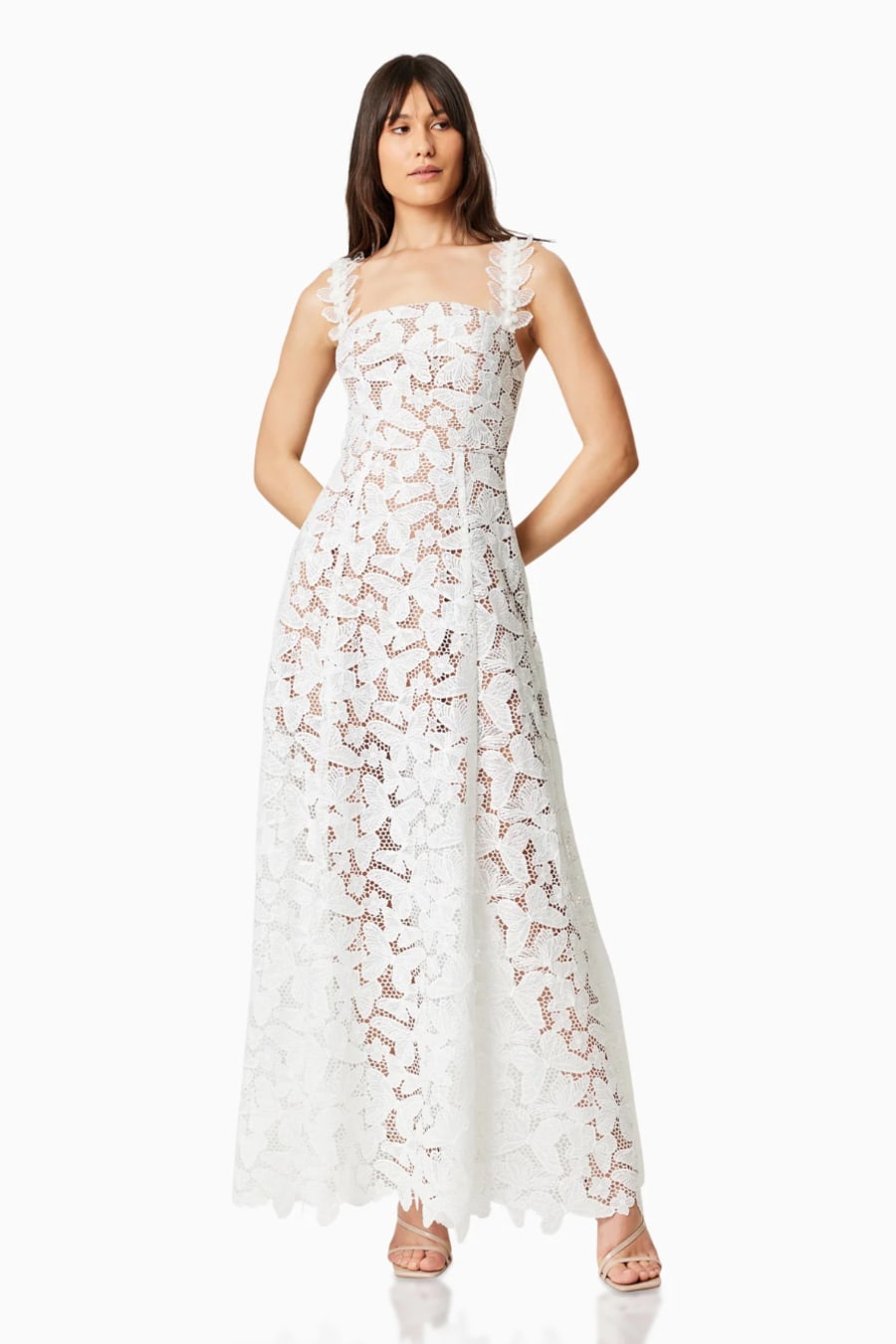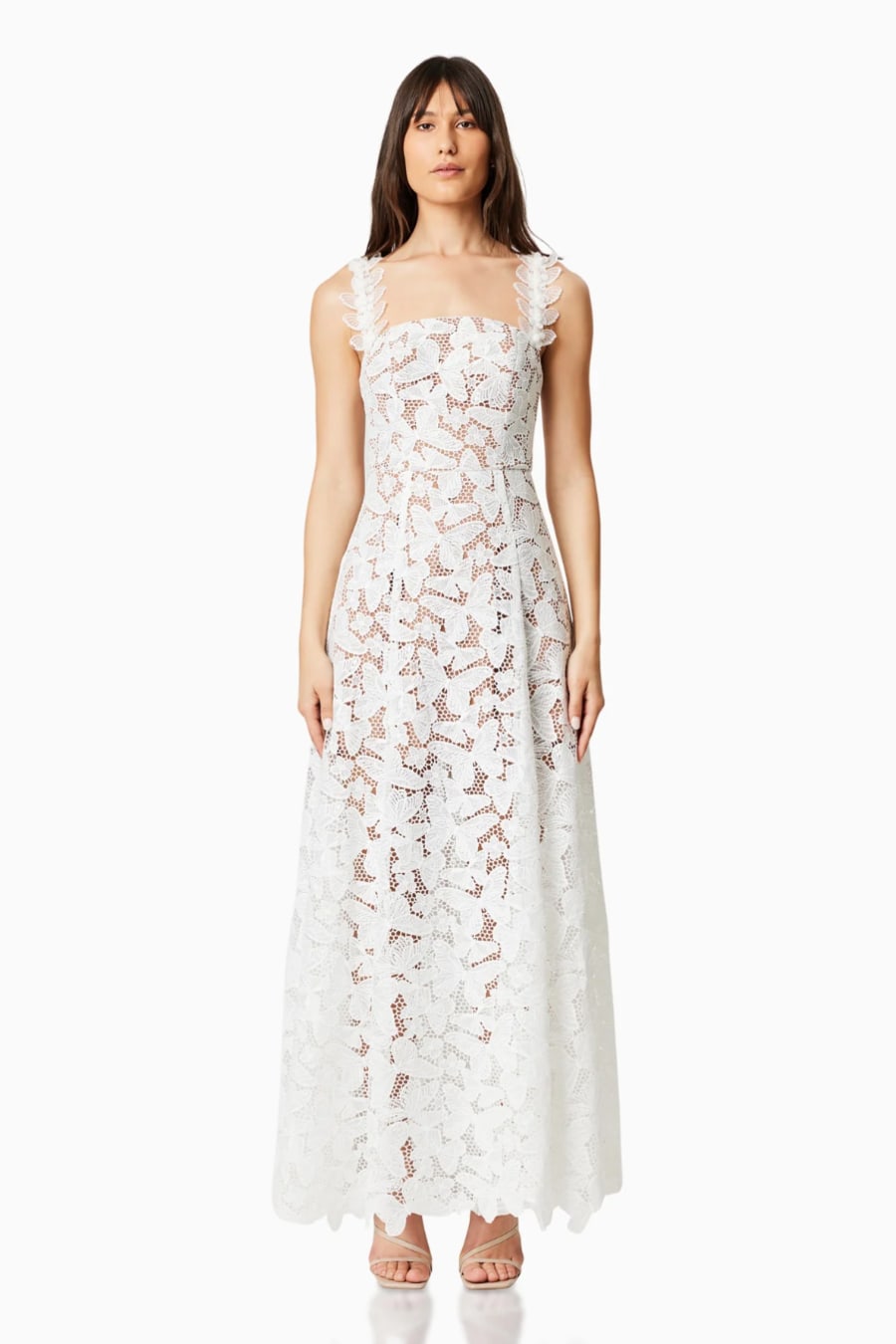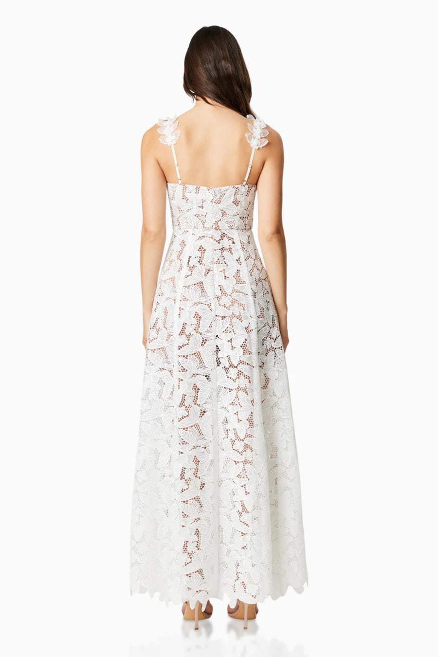 Introducing our exquisite Symi Lace Maxi Dress in White, a breathtaking ensemble that exudes ethereal beauty and timeless grace. Crafted from delicate butterfly lace pattern fabrication, this white maxi dress is a vision of sophistication and femininity.