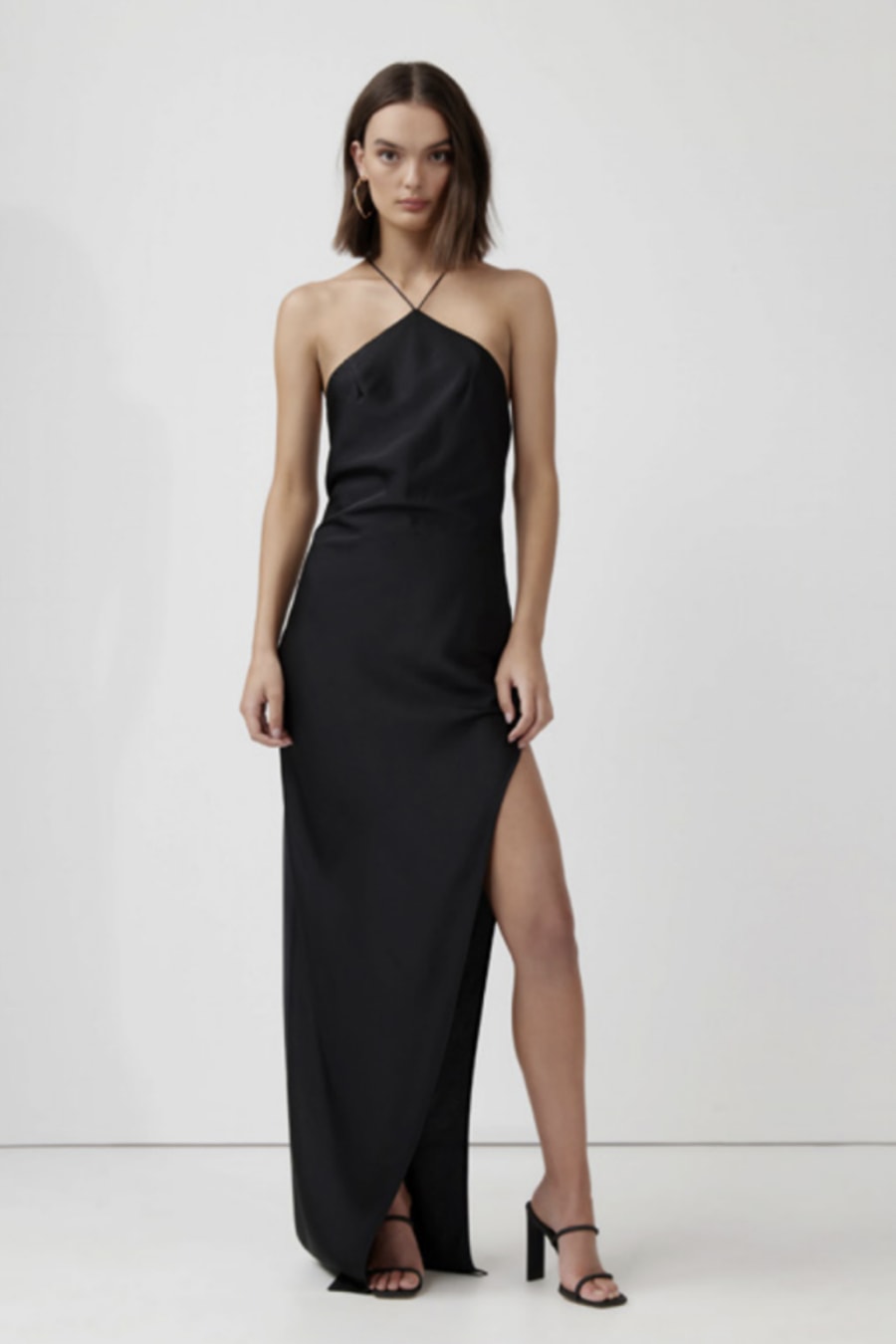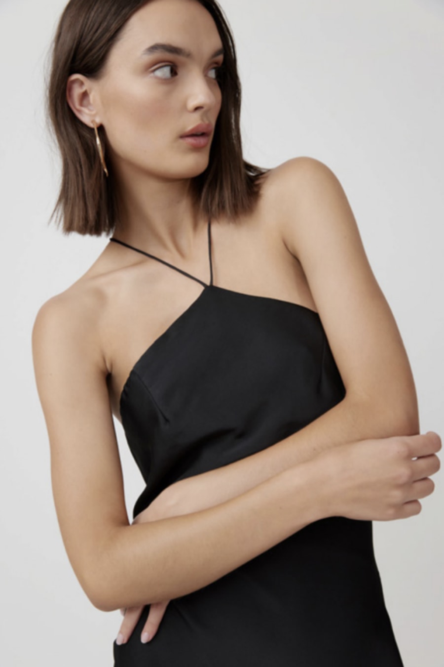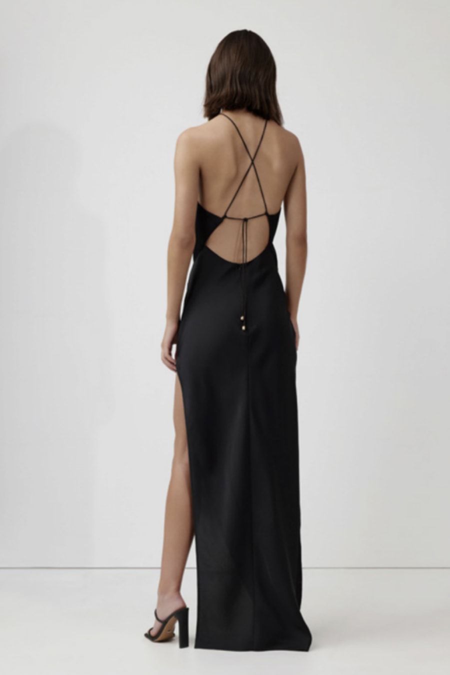 The Terra Dress features a diamond neckline and is cut from a free flowing, luxe, recycled satin. It has delicate spaghetti straps that wrap around the neck and are criss crossed into the back and fastened. It is maxi in length and features our signature thigh high split.