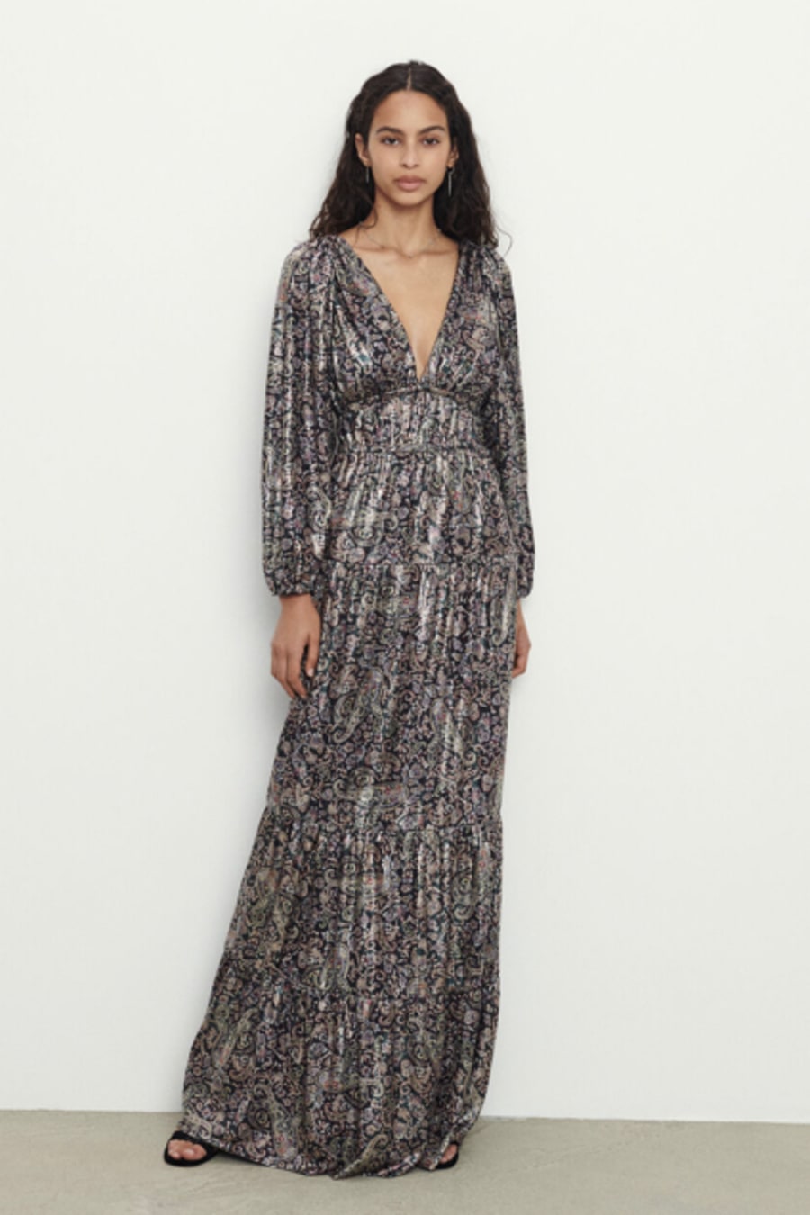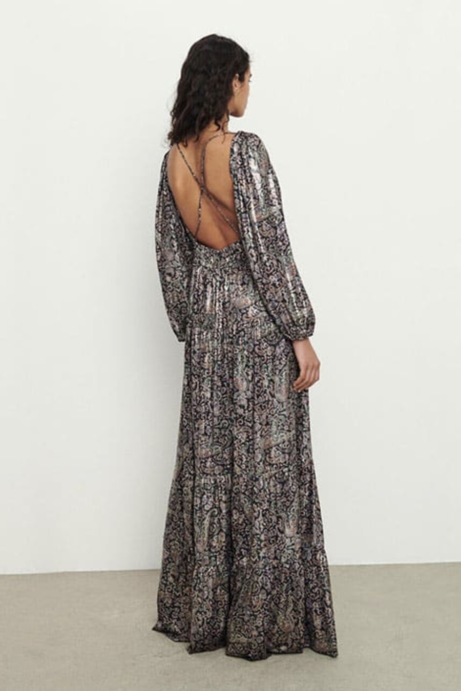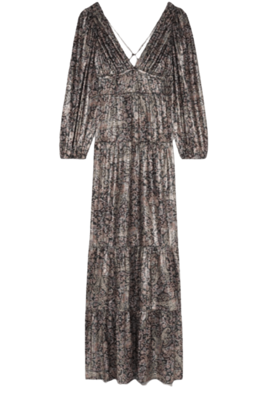 The ba&sh GLADY dress is the perfect party dress. This gorgeous maxi dress shines beautifully. Check out the deep V-neck, the delicately fitted panel that shows off the waist, and the flowing skirt with gathered panels. In shining fabric with a paisley print in sparkling hues. The back holds a surprise with a sexy, rounded halterneck held by thin crossover straps. A stunning maxi dress!