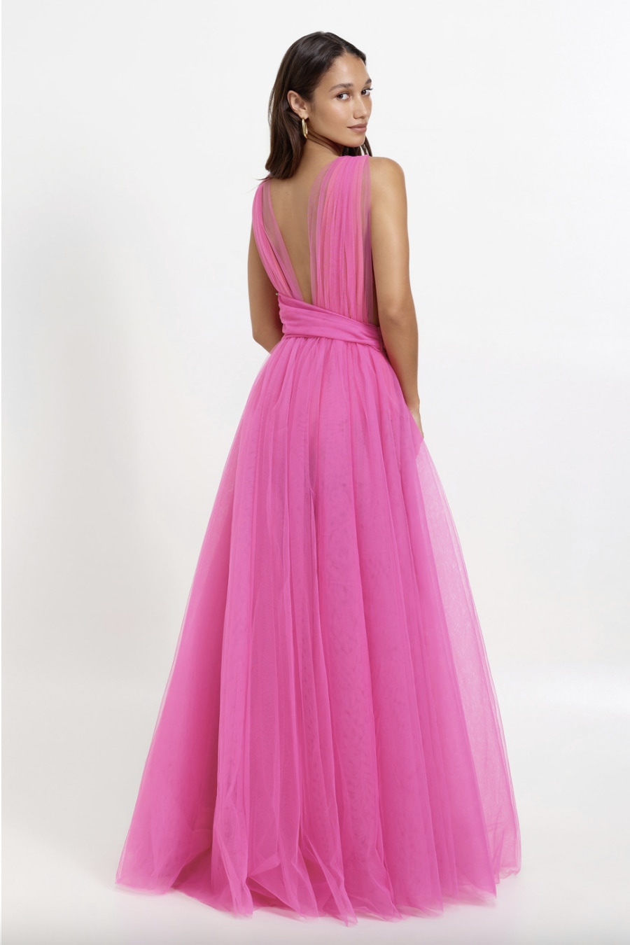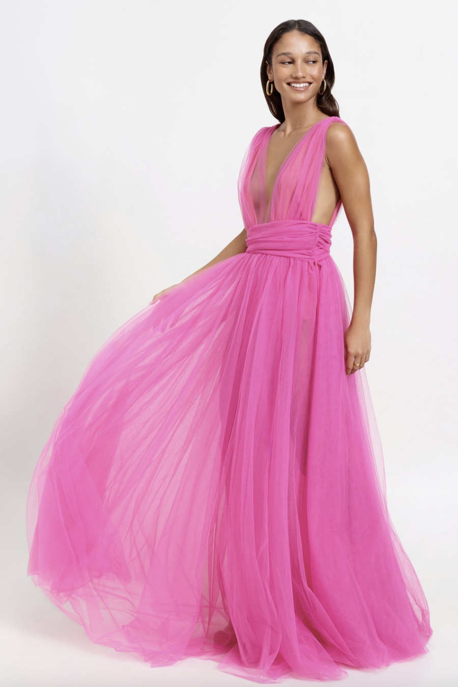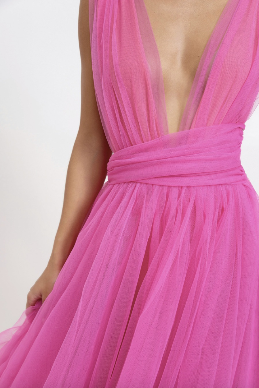 The Karmina Dress is crafted from a soft, romantic tulle that is gathered into a full, flowing skirt. The dress features a deep plunging neckline and back, and finished with an asymmetric waistband. The dress is fitted with an inbuilt mesh bodysuit for comfort and protection.