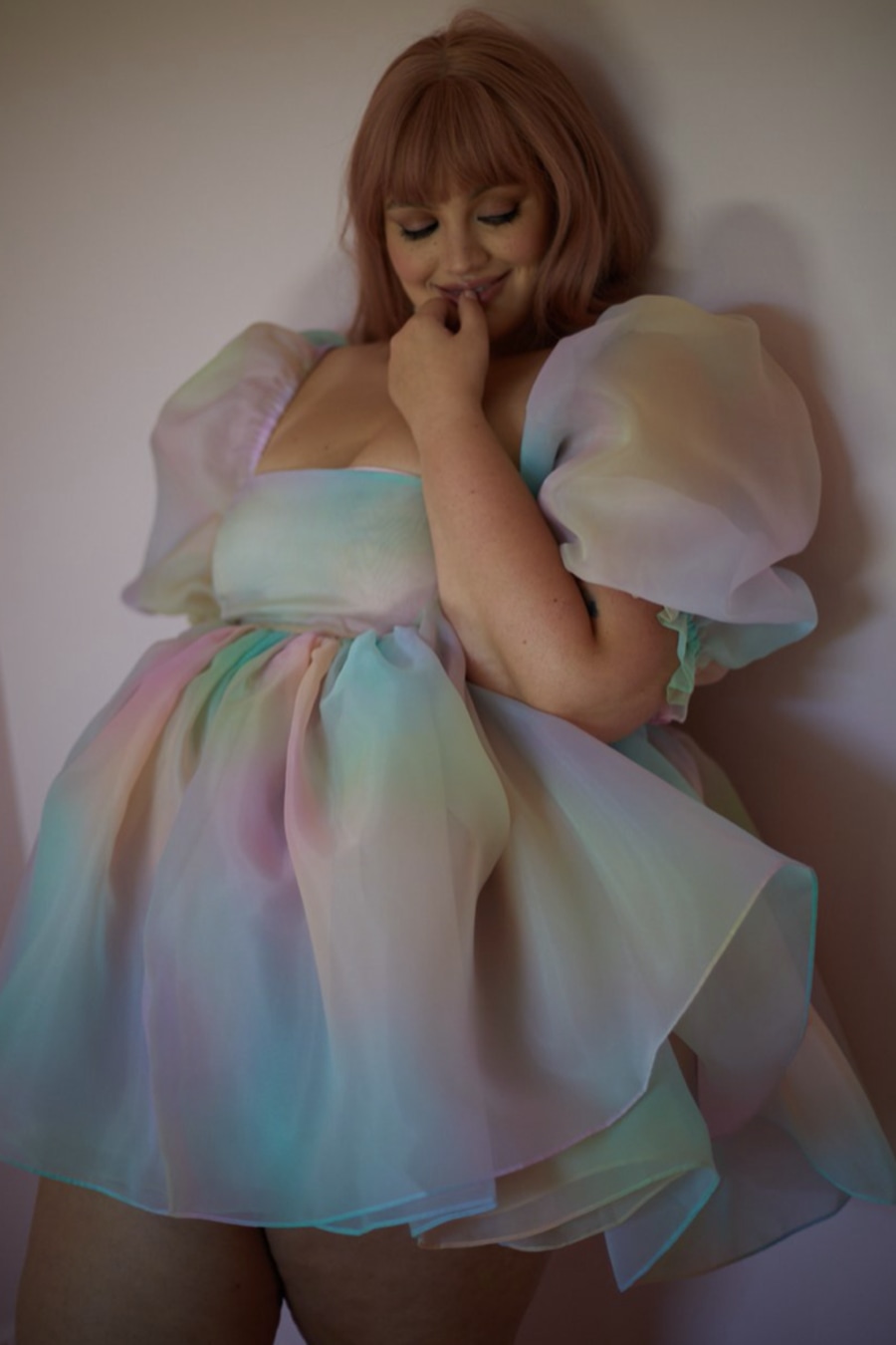 Why not make some magic, or at least feel some magic during this daunting time. Pretend you are sitting on the roof tops of Paris, drinking champagne cocktails and eating baguettes from the paper, feasting on plates of berries. Maybe when you slip into this opaque rainbow (the print was custom created VERY carefully, perfected to be semi subtle and elegant while still outrageous)