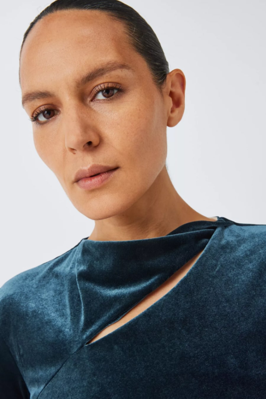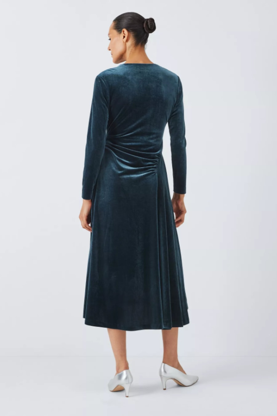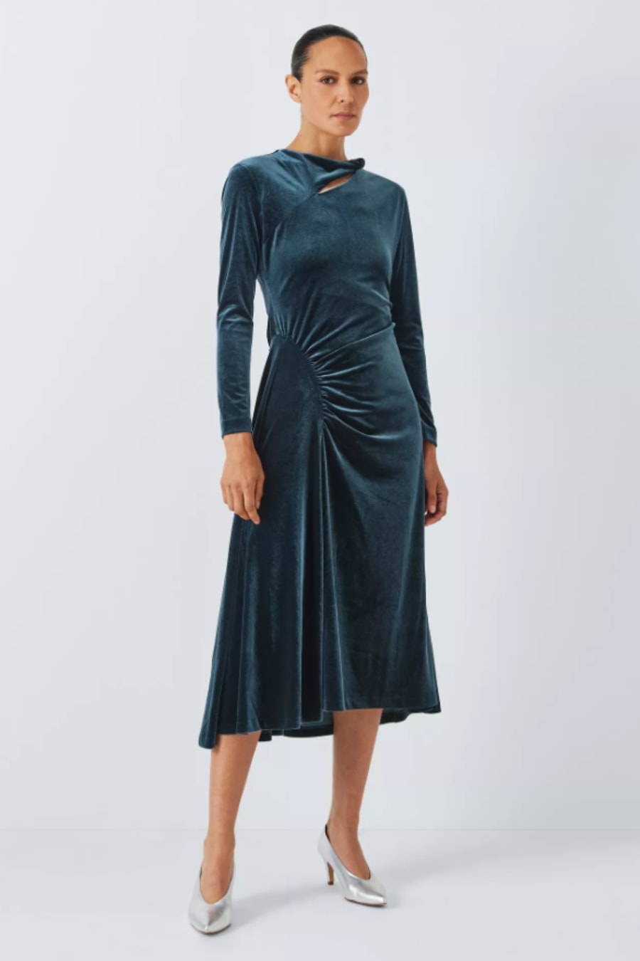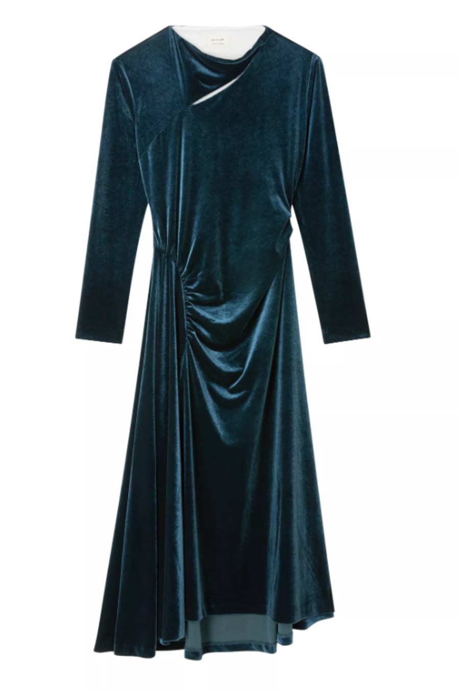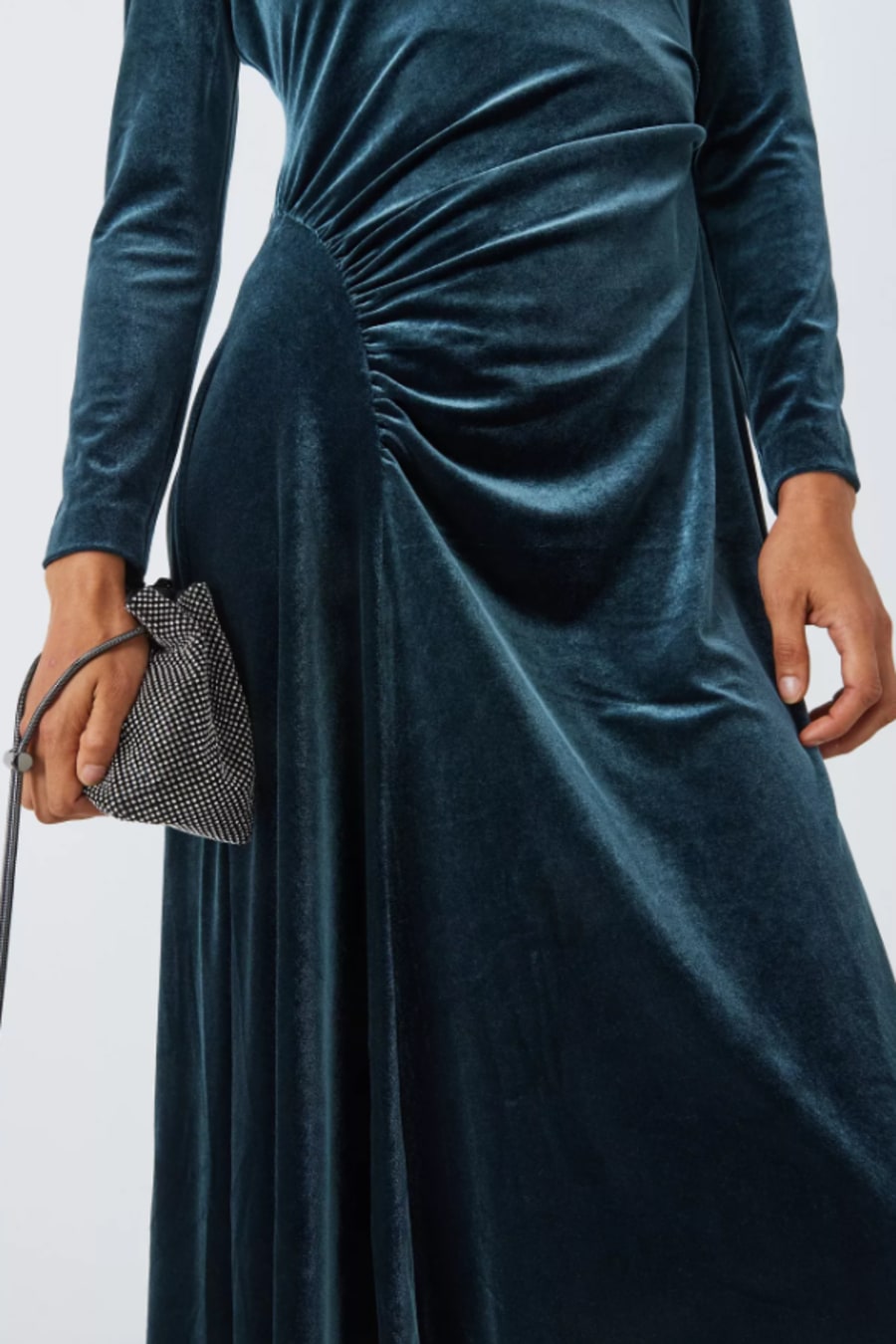 Inspired by the rich, heritage fabrics seen around grand manor houses, this velvet dress is a must for any evening event. Playing to our love of slash neck details for an unexpected twist, this piece also features ruching around the waist for a flattering fit. A simple heel and statement earring will add just the right amount of sophistication.