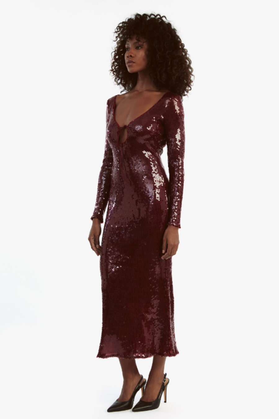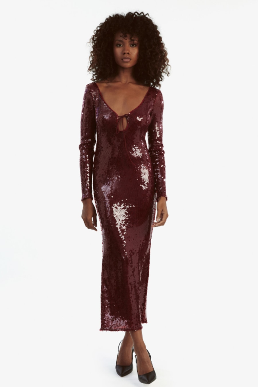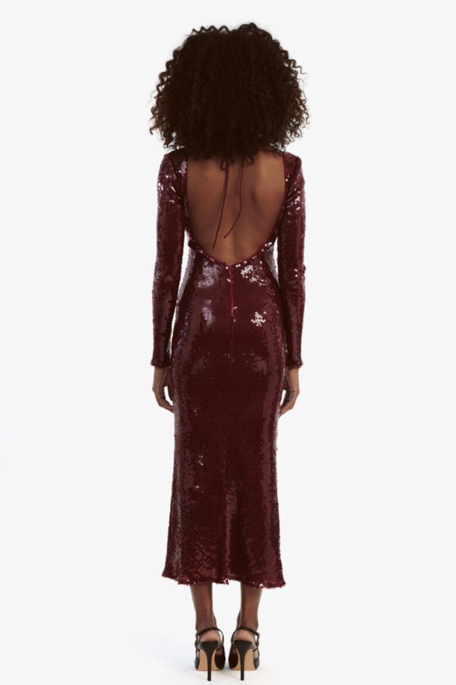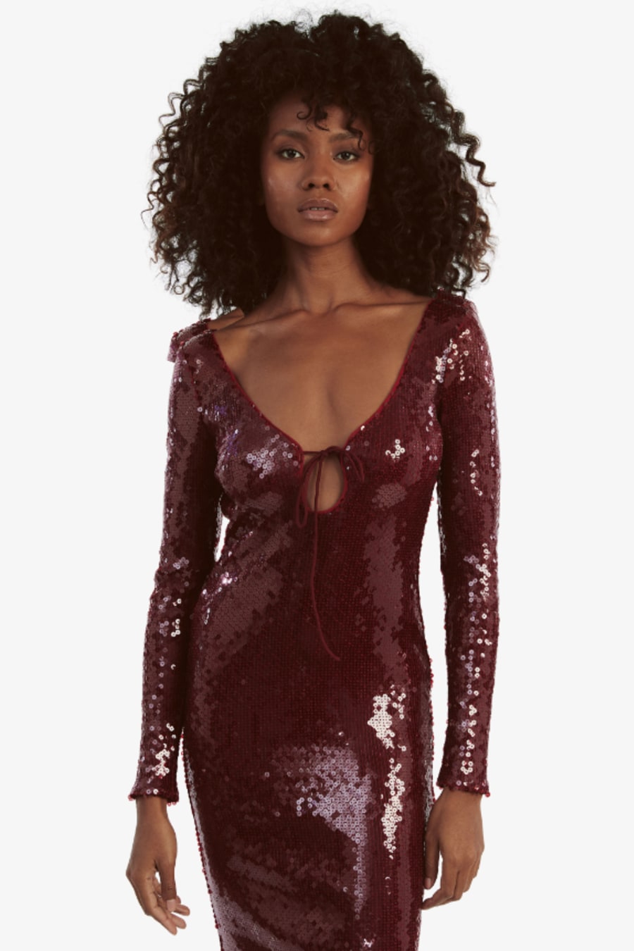 Nights alive. The Verona Sequin Maxi Dress features a shimmering sequin silhouette with long sleeves, a deep neckline with a tie detail, midi-length and a bold open back for unmistakable impact.
