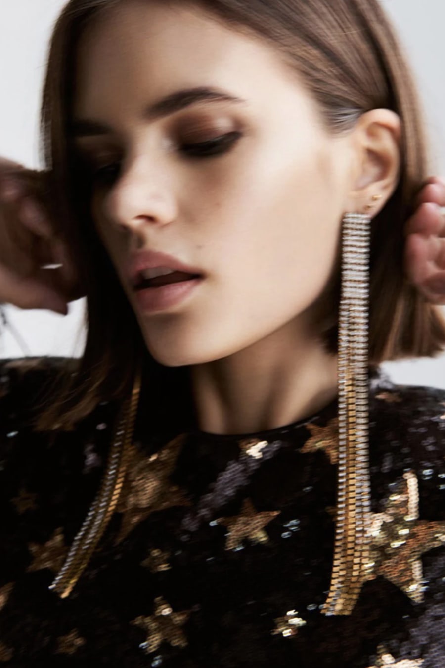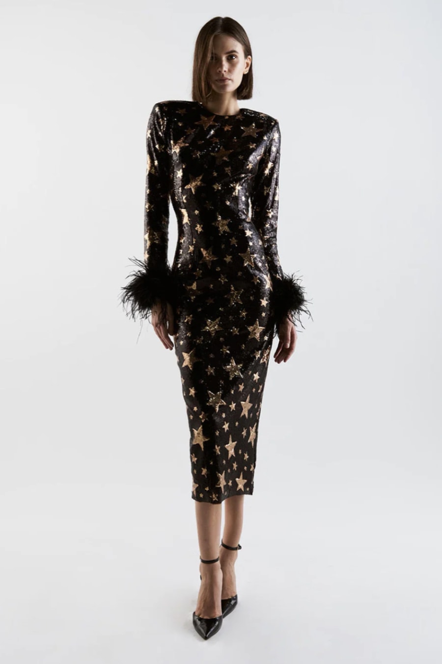 More glamour, more feathers and more festivity… With Veronique, you are invited on to a night stage at Olympia. Its imposing shoulder form, waist-fitting fit and feathered detailing on the ankles are designed to make you feel like a Superstar all night long.