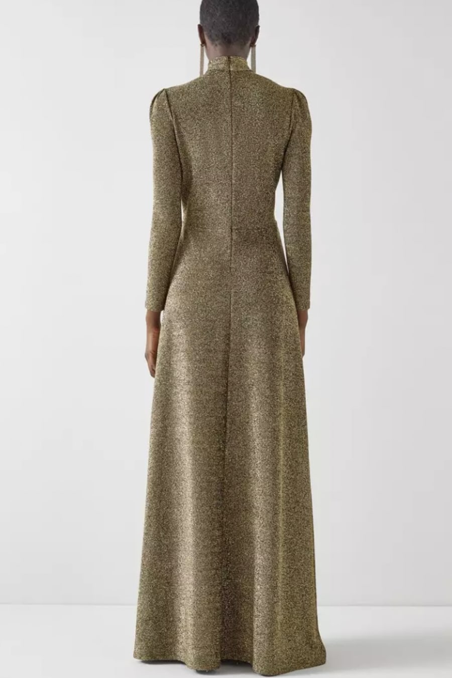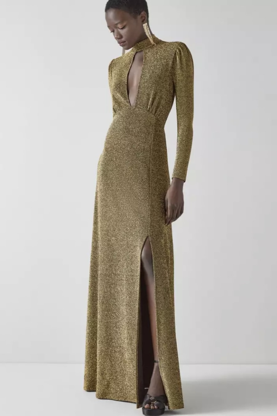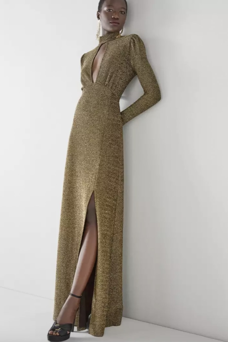Channeling Studio 54 glamour, our new Wilma dress is designed for all the festive season's 'main character' moments. Crafted in Europe from a glittering black and gold metallic thread jersey, it's a turtle neck style with a slit-front, puff shoulders, long sleeves, pleating at the bust and a fitted shape with a long flared skirt and a single side slit. Team it with towering platforms, shoulder-grazing earrings and the best parties in town.