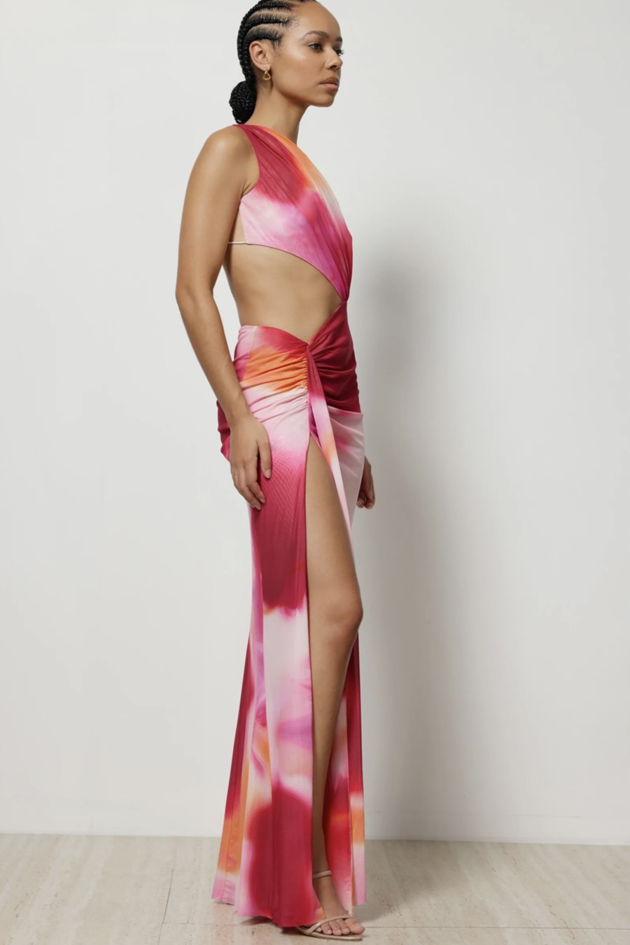 The Zaniah Dress features a one shoulder, asymmetric bodice with delicate elastic strap detailing across the back. The flattering ruching across the hip, paired with the dipped waistline cut out, creates the ultimate cinched waist look. The dress is cut from a stretch mesh featuring a sash overlay and sexy thigh high split.